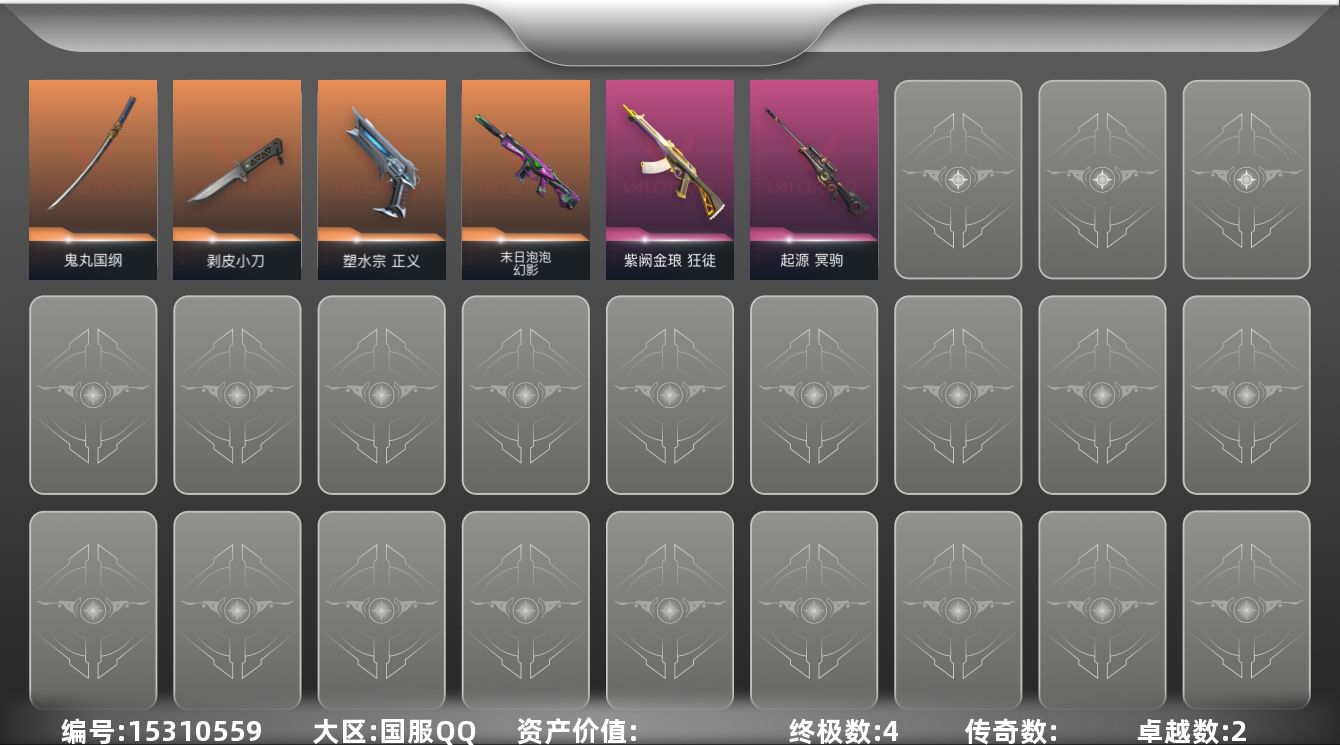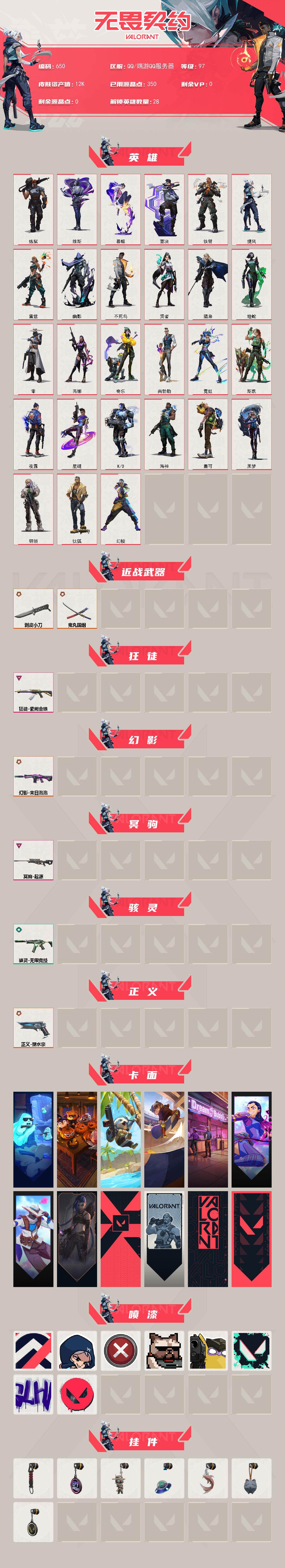 [15310559]【英雄】:幻棱,炼狱,维斯,暮蝶,钛狐,壹决,铁臂,捷风,雷兹,幽影,不死鸟,贤者,猎枭,蝰蛇,零,芮娜,奇乐,尚勃勒,霓虹,斯凯,夜露,星礈,K/O,海神,盖可,黑梦,钢锁 【近战武器】:近战武器-剥皮小刀,近战武器-鬼丸国纲 【狂徒】:狂徒-紫阙金琅 【幻影】:幻影-末日泡泡 【冥驹】:冥驹-起源 【骇灵】:骇灵-无限竞技 【正义】:正义-塑水宗 【卡面】:精灵大战 卡面,南瓜盛典 卡面,树懒大作战 卡面,Clutch 卡面,梦幻奶茶 卡面,无畏契约GO!第一卷:芮娜 卡面,无畏契约GO!第一卷:零 卡面,《双城之战》金克丝 卡面,代号红色 卡面,新兵报到 卡面,V契约 卡面,无畏契约 卡面 【喷漆】:控场勿近 喷漆,捷风差距 喷漆,买装还是存钱 喷漆,关门放狗 喷漆,放下武器 喷漆,胜利属于无畏契约 喷漆,GLHF 喷漆,无畏契约 喷漆 【挂饰】:伞绳 挂饰,第九季//第三幕 纪念币 挂饰,无畏契约GO!第一卷 零 挂饰,天外飞客 挂饰,红鳞松叶 挂饰,《双城之战》魄罗 挂饰,无畏契约 纪念币 挂饰