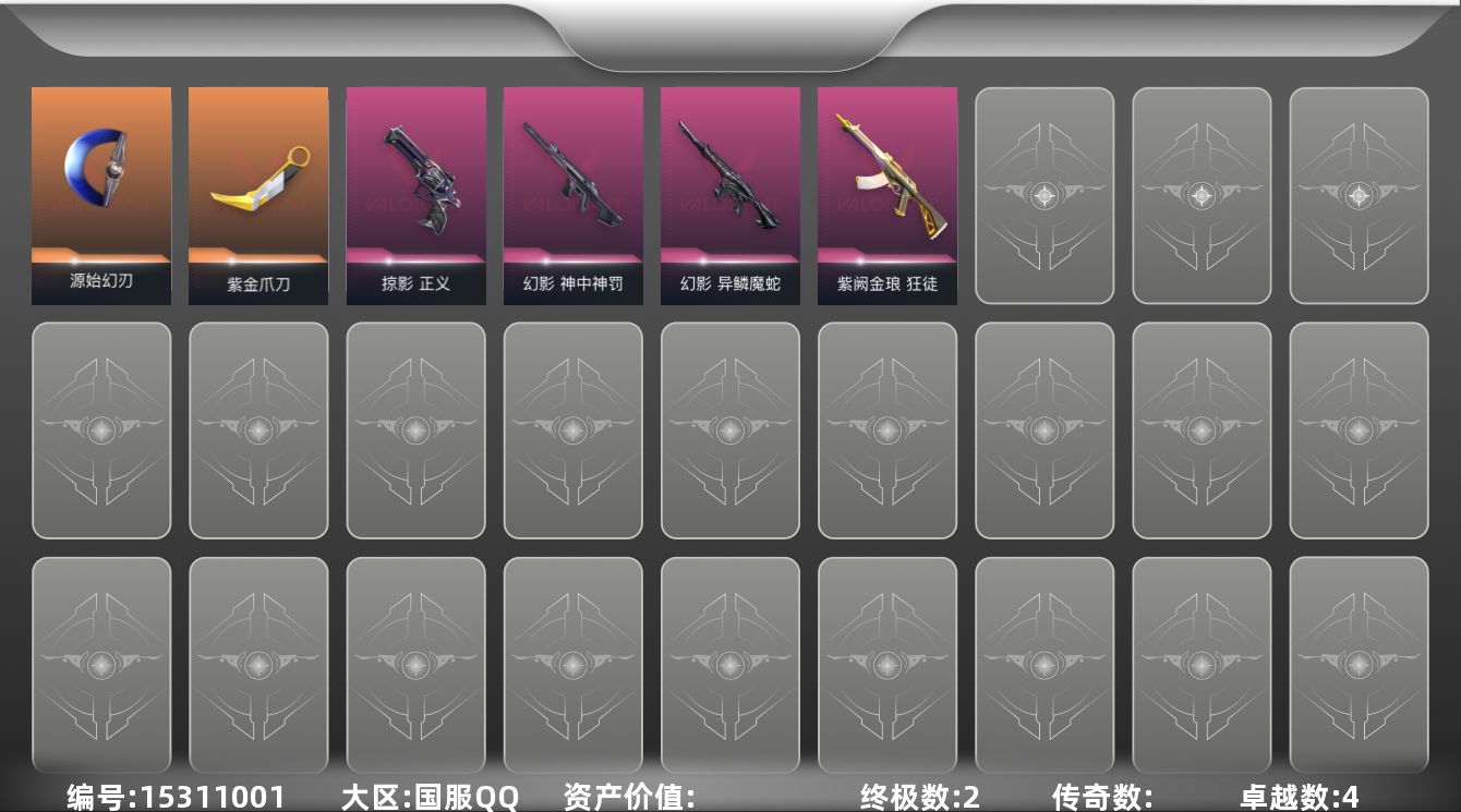 [15311001]【英雄】:幻棱,炼狱,暮蝶,壹决,捷风,雷兹,幽影,不死鸟,贤者,猎枭,零,芮娜,奇乐,霓虹,夜露,星礈,K/O,盖可 【近战武器】:近战武器-紫金爪刀,近战武器-源始幻刃 【狂徒】:狂徒-紫阙金琅 【幻影】:幻影-异鳞魔蛇,幻影-神中神罚 【正义】:正义-掠影 【卡面】:欢迎来到底城 卡面,南瓜盛典 卡面,零点嗅探设计图 卡面,无畏契约GO!第一卷:芮娜 卡面,无畏契约GO!第一卷:零 卡面,无畏契约GO!第一卷:贤者 卡面,代号红色 卡面,新兵报到 卡面,V契约 卡面,无畏契约 卡面 【喷漆】:都算到了 喷漆,买装还是存钱 喷漆,胜利属于无畏契约 喷漆,GLHF 喷漆,无畏契约 喷漆 【挂饰】:天外飞客 挂饰,《双城之战》魄罗 挂饰,无畏契约 纪念币 挂饰