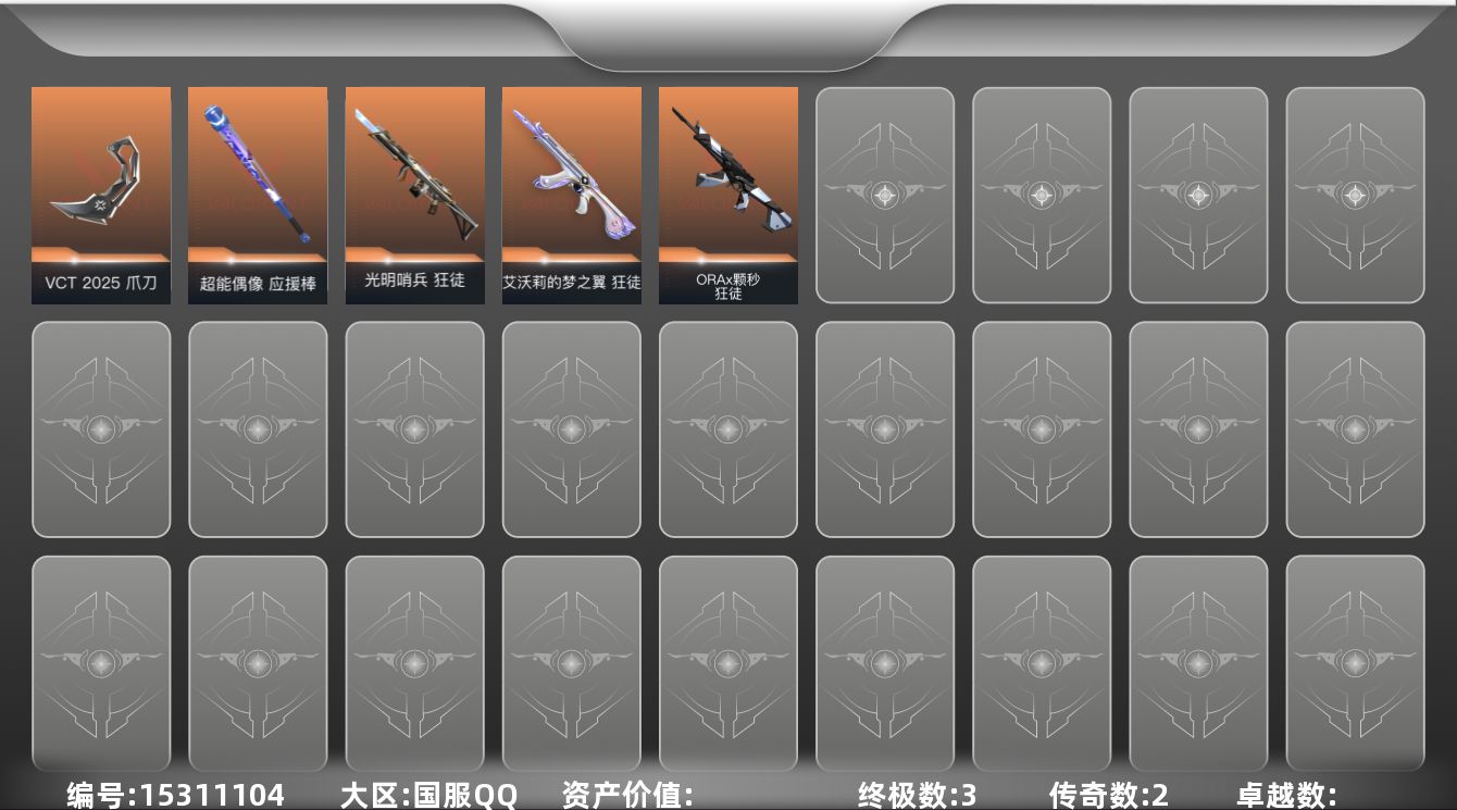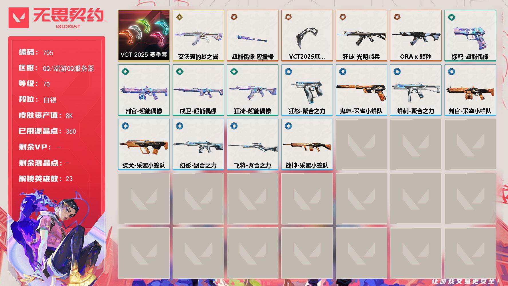 [15311104]【套装】:VCT 2025 赛季套装 【英雄】:幻棱,炼狱,暮蝶,钛狐,壹决,铁臂,捷风,雷兹,幽影,不死鸟,贤者,猎枭,蝰蛇,零,芮娜,奇乐,尚勃勒,霓虹,夜露,K/O,盖可,黑梦,钢锁 【近战武器】:近战武器-VCT 2025 爪刀,近战武器-超能偶像 应援棒 【狂徒】:狂徒-艾沃莉的梦之翼,狂徒-光明哨兵,狂徒-ORA x 颗秒,狂徒-超能偶像 【幻影】:幻影-聚合之力 【戍卫】:戍卫-超能偶像 【獠犬】:獠犬-采蜜小蜂队 【飞将】:飞将-聚合之力 【战神】:战神-采蜜小蜂队 【判官】:判官-超能偶像,判官-采蜜小蜂队 【蜂刺】:蜂刺-聚合之力 【标配】:标配-超能偶像 【鬼魅】:鬼魅-采蜜小蜂队 【狂怒】:狂怒-聚合之力 【卡面】:南瓜盛典 卡面,正义的化身 卡面,铁之华 卡面,失而复得 卡面,时间到 卡面,最高舞台 卡面,复活专家 卡面,归乡 // 蝰蛇 卡面,超能偶像 卡面,生意人麦宝 卡面,声感陷阱设计图 卡面,钢锁工牌 卡面,战术小伙伴的夏日 卡面,采蜜小蜂队 卡面,聚合之力 卡面,梦幻奶茶 卡面,零点嗅探设计图 卡面,无畏契约GO!第一卷:芮娜 卡面,清除名单 卡面,无畏契约GO!第一卷:零 卡面,龍记 卡面,完美调谐 卡面 ,暗枪 卡面,代号红色 卡面,新兵报到 卡面,V契约 卡面,无畏契约 卡面 【喷漆】:又被闪了 喷漆,终极羞辱 喷漆,超级粉丝 喷漆,黯兽卖萌 喷漆,捷风差距 喷漆,惊声尖叫 喷漆,五人成星 喷漆,超能偶像 喷漆,放我出去 喷漆,掩护我 喷漆,大佬发枪 喷漆,边缘试探 喷漆,拼一枪 喷漆,聚合之力 喷漆,采蜜小蜂队 喷漆,梦幻小队 喷漆,五个全都齐了 喷漆,买装还是存钱 喷漆,醒狮贺春 喷漆,蕊形灯 喷漆,胜利属于无畏契约 喷漆,GLHF 喷漆,无畏契约 喷漆 【挂饰】:第九季//第三幕 纪念币 挂饰,第九季//第二幕 纪念币 挂饰,炼狱雪糕 挂饰,糖葫芦 挂饰,袖珍捷风 挂饰,冲上云霄 挂饰,超能偶像 挂饰,迷你浓缩 挂饰,这瓜保熟 挂饰,采蜜小蜂队 挂饰,第九季//第一幕 纪念币 挂饰,聚合之力 挂饰,第八季//第二幕 纪念币 挂饰 ,天外飞客 挂饰,好运福爪 挂饰,瞄这里 挂饰,第八季//第一幕 纪念币 挂饰,无畏契约 纪念币 挂饰