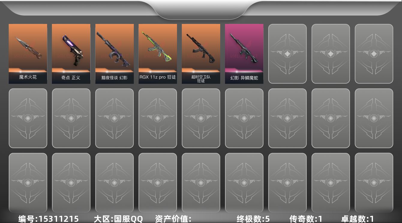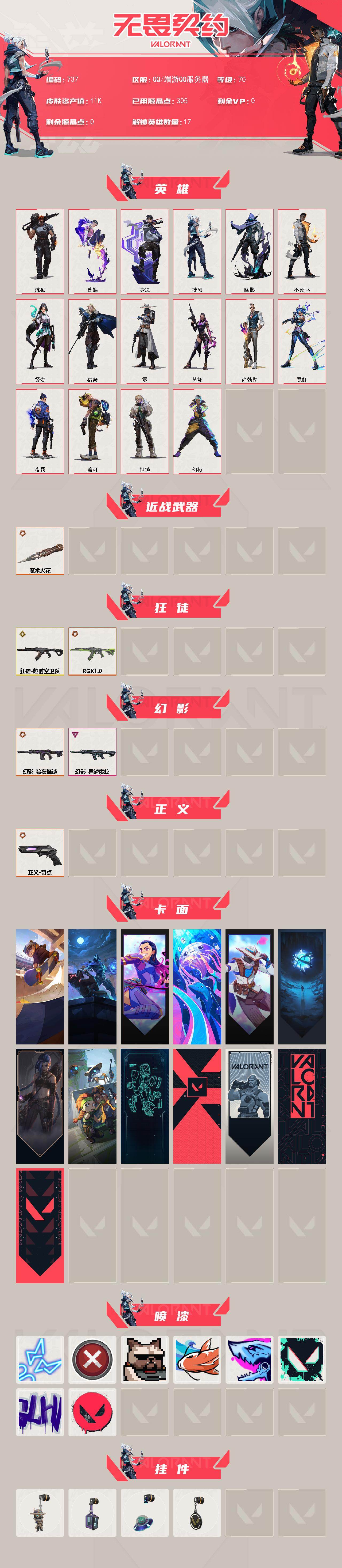 [15311215]【英雄】:幻棱,炼狱,暮蝶,壹决,捷风,幽影,不死鸟,贤者,猎枭,零,芮娜,尚勃勒,霓虹,夜露,盖可,钢锁 【近战武器】:近战武器-魔术火花,近战武器-魔术火花 【狂徒】:狂徒-超时空卫队,狂徒-RGX 11z Pro 【幻影】:幻影-黯夜怪谈,幻影-异鳞魔蛇 【正义】:正义-奇点 【卡面】:Clutch 卡面,失控边缘 卡面,无畏契约GO!第一卷:芮娜 卡面,深海水族 卡面,无畏契约GO!第一卷:零 卡面,无垠星环 卡面,《双城之战》金克丝 卡面,别冒尖 卡面,铁臂设计图 卡面,代号红色 卡面,新兵报到 卡面,V契约 卡面,无畏契约 卡面 【喷漆】:霓光四射 喷漆,买装还是存钱 喷漆,关门放狗 喷漆,红鳞 喷漆,暴走萝莉 喷漆,胜利属于无畏契约 喷漆,GLHF 喷漆,无畏契约 喷漆 【挂饰】:无畏契约GO!第一卷 零 挂饰,动力机箱 挂饰,天外飞客 挂饰,无畏契约 纪念币 挂饰