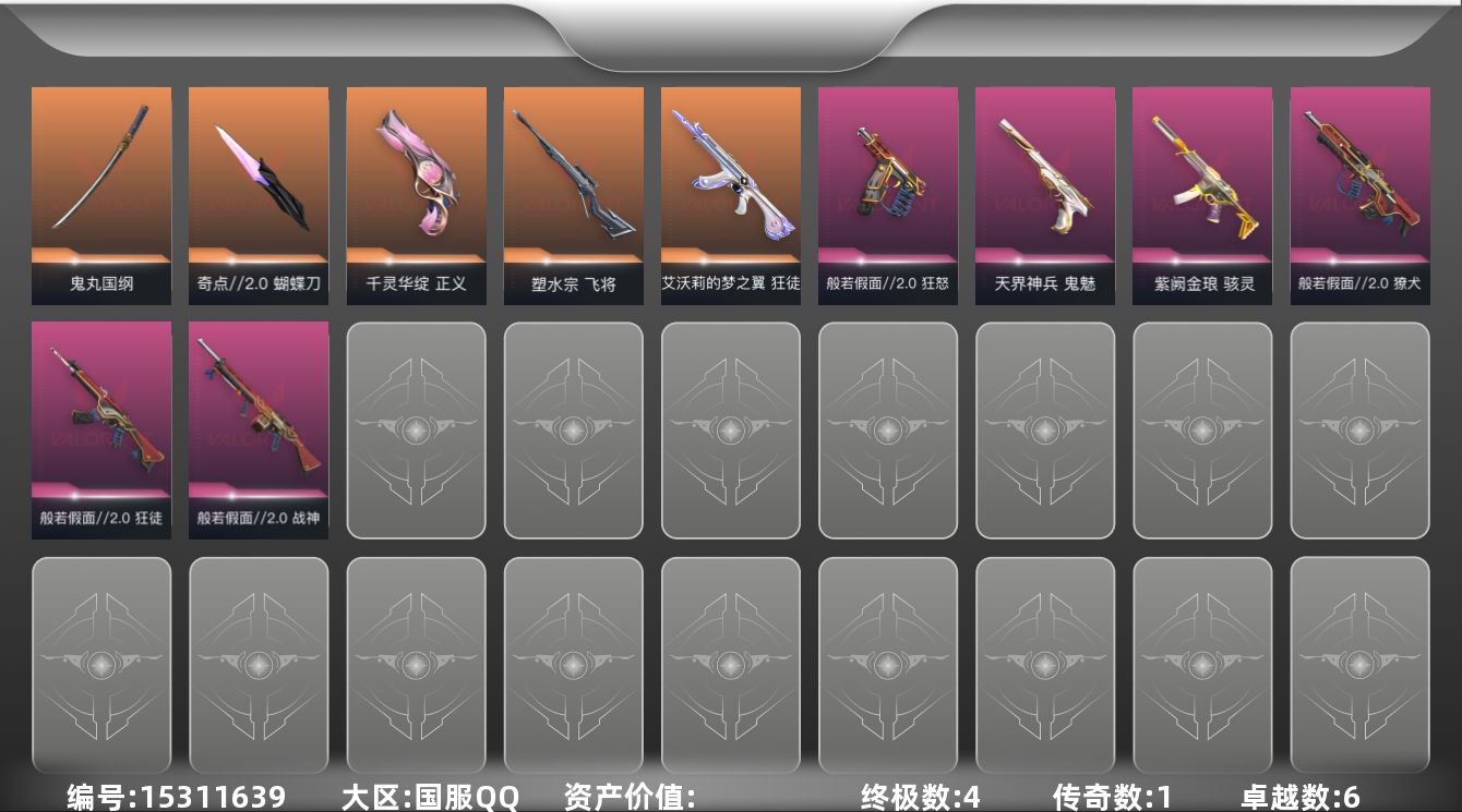 [15311639]【套装】:般若假面//2.0套装 【英雄】:炼狱,暮蝶,壹决,捷风,幽影,不死鸟,贤者,猎枭,零,芮娜,奇乐,尚勃勒,霓虹,夜露,K/O 【近战武器】:近战武器-奇点//2.0 蝴蝶刀,近战武器-鬼丸国纲 【狂徒】:狂徒-艾沃莉的梦之翼,狂徒-般若假面//2.0,狂徒-荒土机兵 【幻影】:幻影-白日幻梦,幻影-纳米打击 【戍卫】:戍卫-逆冲蛮牛 【獠犬】:獠犬-般若假面//2.0,獠犬-逆冲蛮牛 【冥驹】:冥驹-荒土机兵 【飞将】:飞将-塑水宗 【战神】:战神-般若假面//2.0 【奥丁】:奥丁-纳米打击 【判官】:判官-纳米打击x 【雄鹿】:雄鹿-逆冲蛮牛 【骇灵】:骇灵-紫阙金琅,骇灵-荒土机兵 【标配】:标配-荒土机兵,标配-涂鸦艺廊 【正义】:正义-千灵华绽 【鬼魅】:鬼魅-天界神兵 【狂怒】:狂怒-般若假面//2.0,狂怒-逆冲蛮牛 【卡面】:分崩离析 卡面,纳米打击 卡面,抑制技术 卡面,激斗汉堡 卡面,瓦娃脸雪糕 P2 卡面,从黄昏到黎明 卡面,荒土机兵 卡面,银弹猎手 卡面,逆冲蛮牛 卡面,《双城之战》拥抱 卡面,精灵大战 卡面,欢迎来到底城 卡面,南瓜盛典 卡面,树懒大作战 卡面,无垠星环 卡面,《双城之战》金克丝 卡面,代号红色 卡面,新兵报到 卡面,V契约 卡面,无畏契约 卡面 【喷漆】:小小心意 喷漆,战“素”兔 喷漆,宇宙的指引 喷漆,请求重启 喷漆,逆冲蛮牛 喷漆,纳米打击 喷漆,鼻尖上的蝴蝶 喷漆,简笔画黯兽 喷漆,独守蝰腹 喷漆,他们将落荒而逃 喷漆,通缉:战术企鹅 喷漆,荒土机兵 喷漆,别挡我吃球! 喷漆,嗨宝南瓜灯 喷漆,嘭! 喷漆,都算到了 喷漆,控场勿近 喷漆,放下武器 喷漆,胜利属于无畏契约 喷漆,GLHF 喷漆,无畏契约 喷漆 【挂饰】:荒土机兵 挂饰,悠闲鸡块 挂饰,猫猫木乃伊 挂饰,水壶 挂饰,纳米打击 挂饰,逆冲蛮牛 挂饰,可爱糖糖 挂饰,伞绳 挂饰,《双城之战》小蛋糕 挂饰,第九季//第三幕 纪念币 挂饰,动力机箱 挂饰,无畏契约 纪念币 挂饰