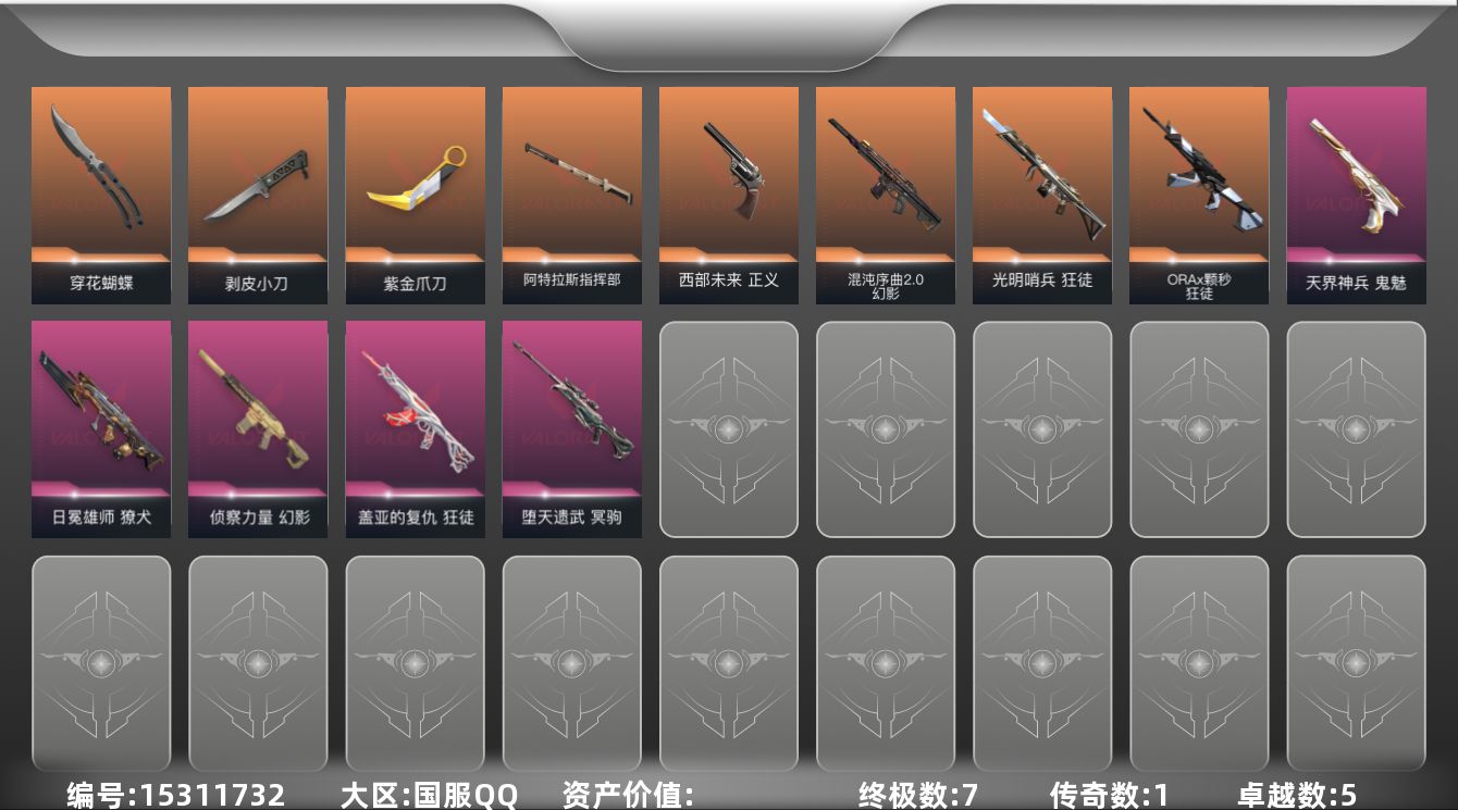 [15311732]【英雄】:幻棱,炼狱,维斯,暮蝶,壹决,捷风,雷兹,幽影,不死鸟,贤者,猎枭,蝰蛇,零,芮娜,奇乐,尚勃勒,霓虹,斯凯,夜露,星礈,K/O,盖可,黑梦,钢锁 【近战武器】:近战武器-穿花蝴蝶,近战武器-剥皮小刀,近战武器-紫金爪刀,近战武器-阿特拉斯指挥部 甩棍 【狂徒】:狂徒-光明哨兵,狂徒-ORA x 颗秒,狂徒-盖亚的复仇 【幻影】:幻影-混沌序曲//2.0,幻影-侦察力量 【獠犬】:獠犬-日冕雄师 【冥驹】:冥驹-堕天遗武 【骇灵】:骇灵-无限竞技 【正义】:正义-西部未来 【鬼魅】:鬼魅-天界神兵 【卡面】:《双城之战》拥抱 卡面,欢迎来到底城 卡面,南瓜盛典 卡面,热舞环节 卡面,正义的化身 卡面,树懒大作战 卡面,Clutch 卡面,无畏契约GO!第一卷:芮娜 卡面,无畏契约GO!第一卷:零 卡面,《双城之战》金克丝 卡面,无畏契约GO!第一卷:贤者 卡面,钢锁vs盖可 卡面,代号红色 卡面,新兵报到 卡面,V契约 卡面,无畏契约 卡面 【喷漆】:嘭! 喷漆,都算到了 喷漆,控场勿近 喷漆,霓光四射 喷漆,买装还是存钱 喷漆,无畏契约GO!第一卷:捷风 喷漆,无畏契约GO!第一卷:贤者 喷漆,胜利属于无畏契约 喷漆,GLHF 喷漆,无畏契约 喷漆 【挂饰】:《双城之战》小蛋糕 挂饰,第九季//第三幕 纪念币 挂饰,无畏契约GO!第一卷 芮娜 挂饰,无畏契约GO!第一卷 零 挂饰,第九季//第二幕 纪念币 挂饰,薰衣草之心 挂饰,Z世代特饮 挂饰,天外飞客 挂饰,《双城之战》魄罗 挂饰,海豹的认可 挂饰,无畏契约 纪念币 挂饰