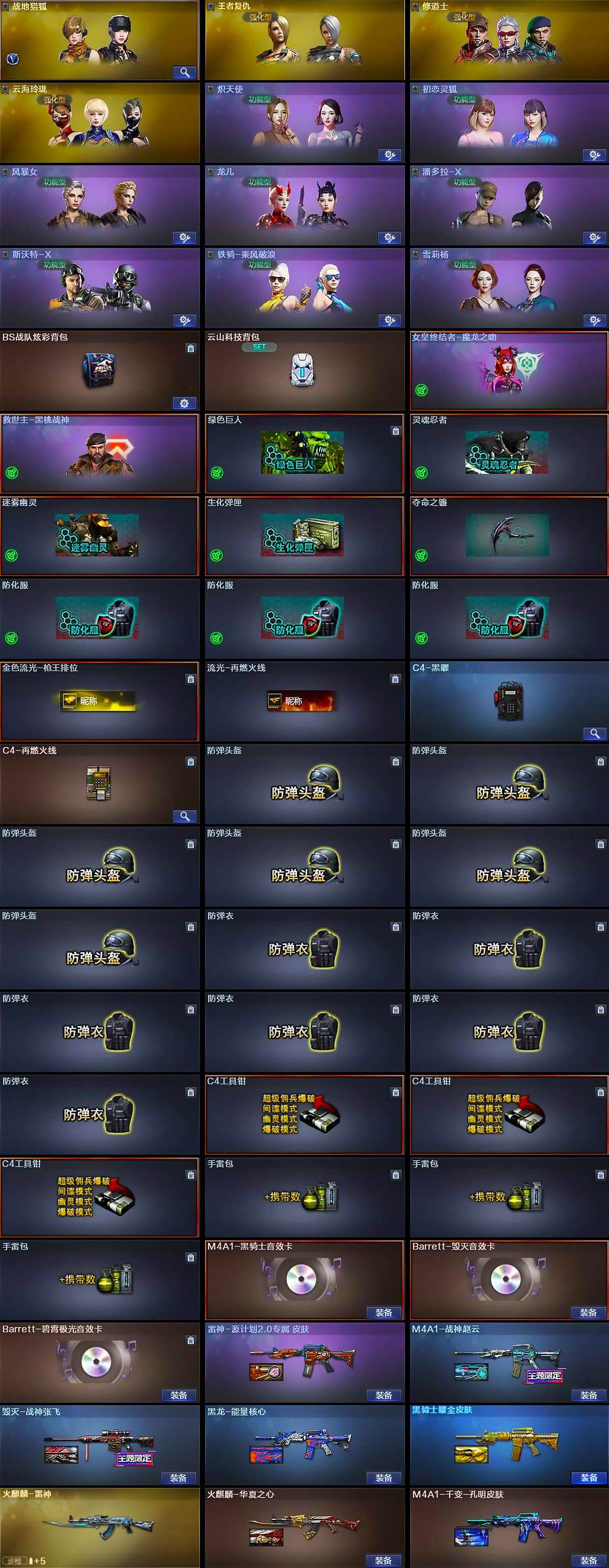 【道具】:BS战队炫彩背包,云山科技背包,女皇终结者-魔龙之吻,救世主-黑桃战神,绿色巨人,灵魂忍者,迷雾幽灵,生化弹匣,夺命之镰,防化服*3,金色流光-枪王排位,流光-再燃火线,C4-黑曜,C4-再燃火线,防弹头盔*6,防弹衣*6,C4工具钳*3,手雷包*3