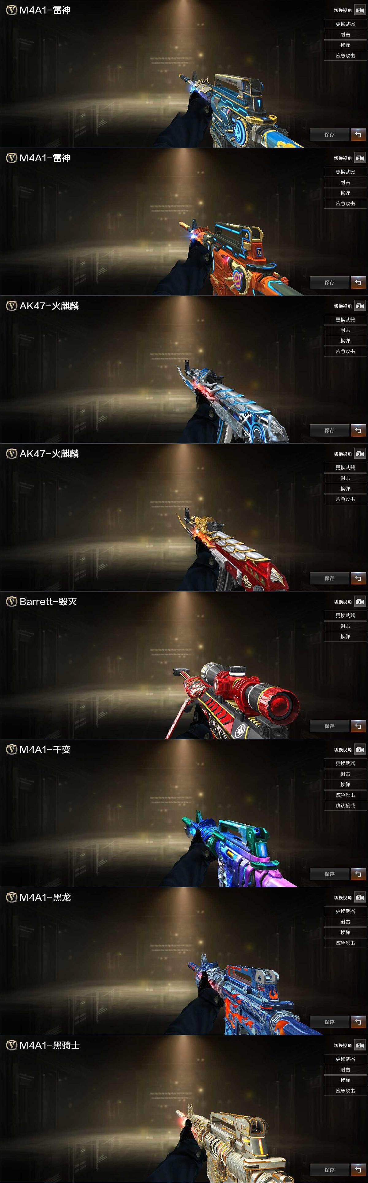 【皮肤】:M4A1-战神赵云,雷神-源计划2.0专属 皮肤,火麒麟-雷神,火麒麟-华夏之心,毁灭-战神张飞,M4A1-千变-孔明皮肤,黑龙-能量核心,黑骑士耀金皮肤