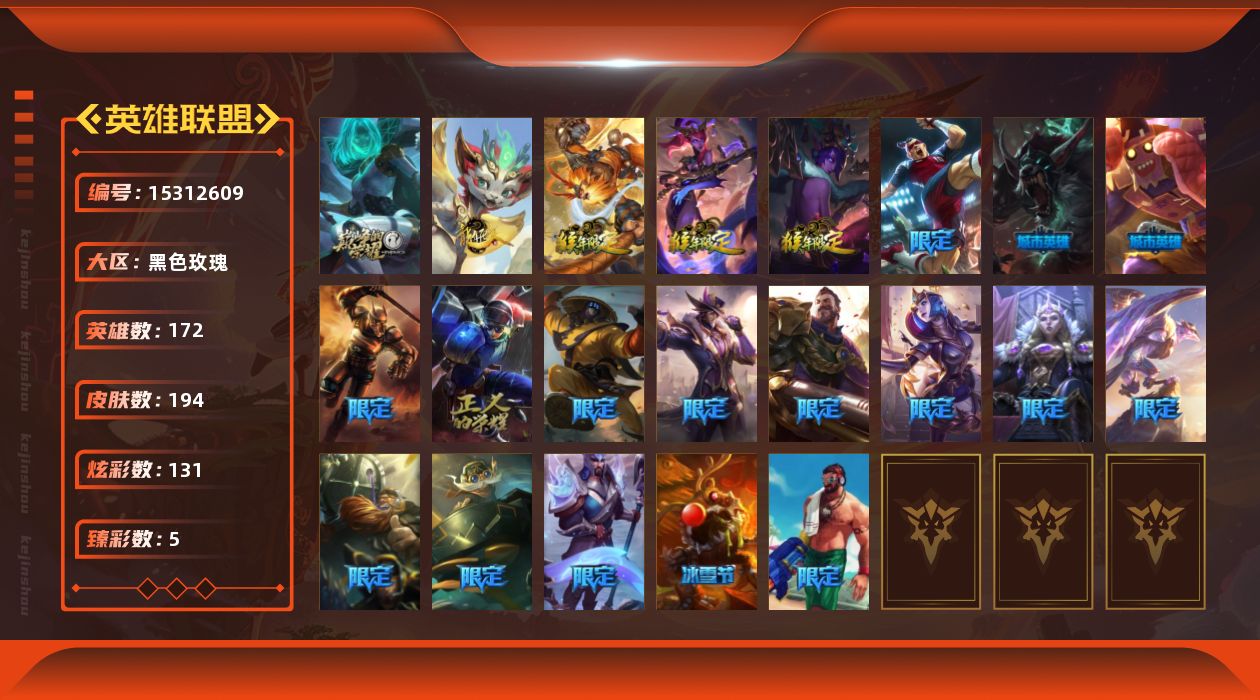 [15312609]【特价出售/店主推荐】黄金段位-172英雄-194皮肤-131炫彩-0终极-2神话-22限定-14传说-42史诗