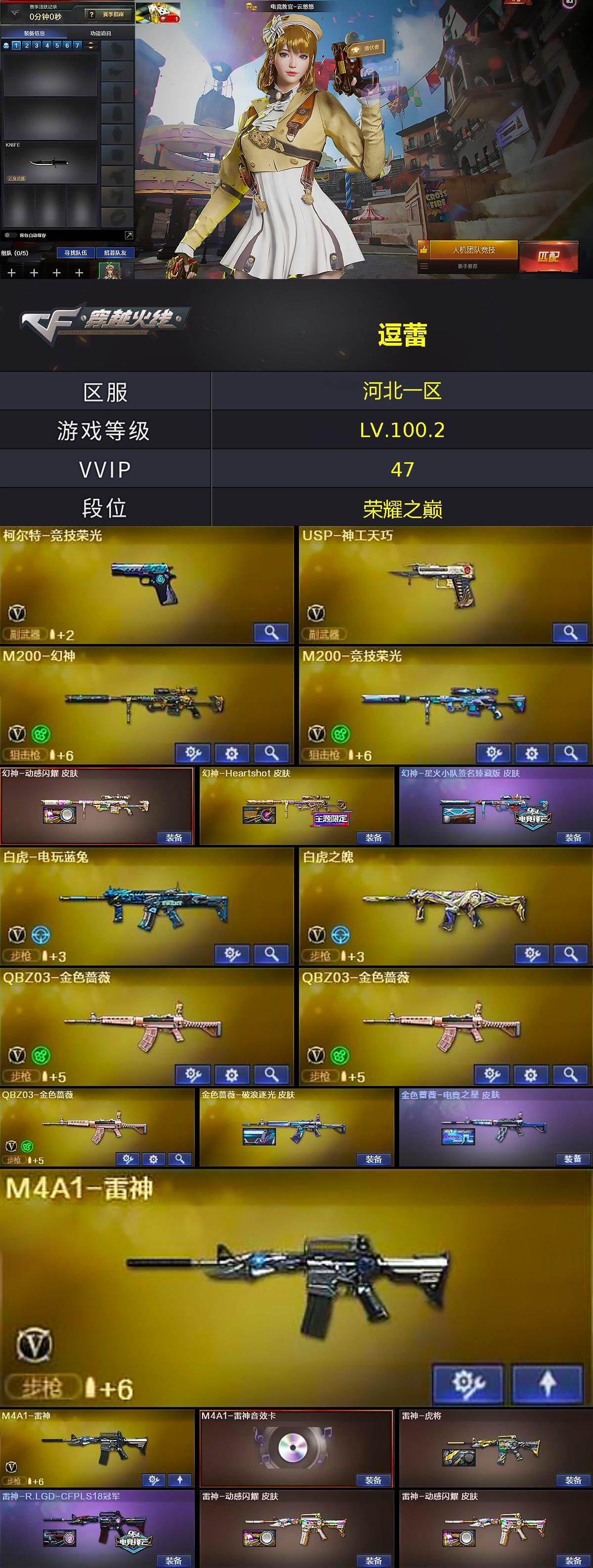 [15312793]河北一区-47V-15王者-0炫金 【热门武器】:QBZ03-金色蔷薇*3,HK417-朱雀,M200-幻神,M200-竞技荣光,白虎-电玩蓝兔,金色小号,C.A.T,牛牛-AK47,M4A1-黑骑士,沙鹰-修罗*2,金刚伞 【王者炫金武器】:王者之魄高爆手雷*2,王者之魄闪光弹*5,王者之魄烟雾弹*2 【音效卡】:M4A1-雷神音效卡 【皮肤】:幻神-动感闪耀 皮肤,幻神-Heartshot 皮肤,幻神-星火小队签名臻藏版 皮肤,金色蔷薇-破浪逐光 皮肤,金色蔷薇-电竞之星 皮肤,雷神-虎将,雷神-R.LGD-CFPLS18冠军,雷神-动感闪耀 皮肤*2,火麒麟-轻羽皮肤,毁灭耀金皮肤,毁灭-SV-CFPLS16冠军,毁灭-英雄计划 皮肤,黑骑士-战神马超,黑骑士-少林,HK417-朱雀-武当,战神-流金岁月皮肤,AK47-B-常胜将军-刘备*2,麒麟刺-甜蜜糖果 皮肤 【角色】:电竞教官-云悠悠,王者-瞳-闭月羞花,王者-迷迭香,乔伊教练,云海玲珑,空,初恋灵狐,芳心审判者,风暴女,虎妞,嘉年华灵狐,灵动武士,灵狐者-X,龙儿,女战神,女主播,潘多拉-X,潘多拉-甜心教官,斯沃特-X,兔囡囡,樱-青春偶像,游珑儿 【人偶武器】:星神-炽天使,天龙-曼陀罗,Scar Light-马枪,AWM-灵狐-15周年嘉年华,海滩汪汪-巴雷特,C.A.T,牛牛-AK47,迷你牛魔王,迷你牛牛,生化手雷-机甲核心,深渊终结者手雷,迷你超能女侍,QBZ03-斯沃特,灵狐娃娃手雷*2 【挑战大师】:冰龙粉碎者-白马银枪,激光毁灭者III-白马银枪,神圣爆裂者-末日III 【英雄级武器】:AK47-火麒麟,M4A1-雷神*2,M4A1-黑骑士,AK12-天启,HK417-朱雀,QBZ03-天罚,无影-神兵利器,黑武士-锦绣游龙,QBZ03-金色蔷薇*3,烈火-动感闪耀,超新星-悦享-觉醒版,AK-47-猩红传说,AK47-B-战神,王者火魄-觉醒版,AK47-B-常胜将军,白虎-电玩蓝兔,白虎之魄-觉醒版,Barrett-毁灭,M200-幻神,M200-竞技荣光,王者之怒-觉醒版,沙鹰-修罗*2,沙鹰-天神,柯尔特-竞技荣光,USP-神工天巧,王者之魂-觉醒版,天神-动感闪耀,唐刀-神工天巧,屠龙-动感闪耀,王者之锋-觉醒版,高爆手雷-竞技荣光*4,高爆手雷-神工天巧,手雷-动感闪