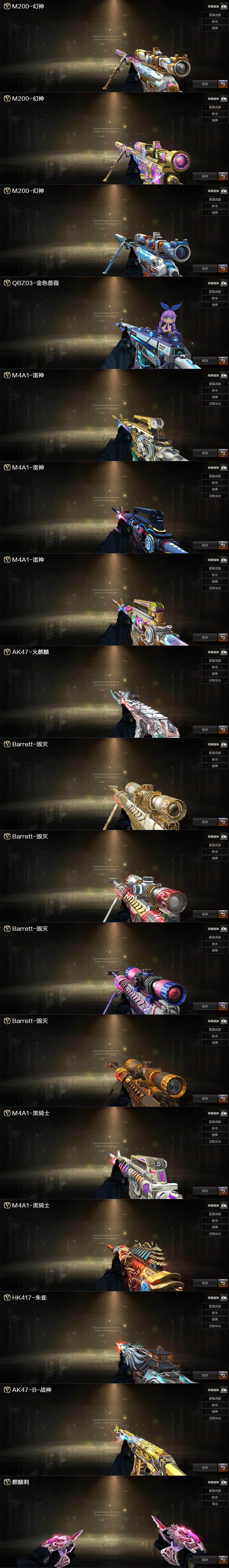 【热门武器】:QBZ03-金色蔷薇*3,HK417-朱雀,M200-幻神,M200-竞技荣光,白虎-电玩蓝兔,金色小号,C.A.T,牛牛-AK47,M4A1-黑骑士,沙鹰-修罗*2,金刚伞