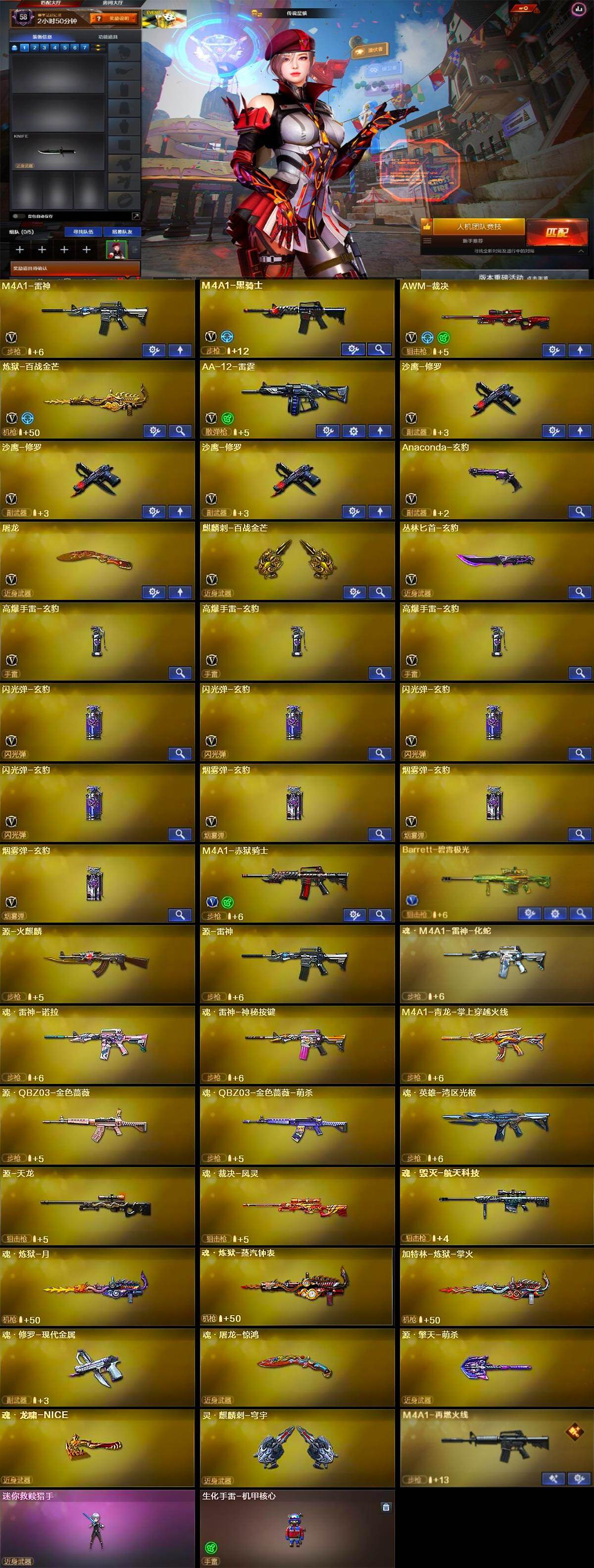 【英雄级武器】:M4A1-雷神,M4A1-黑骑士,AWM-裁决,炼狱-百战金芒,AA-12-雷霆,沙鹰-修罗*3,Anaconda-玄豹,屠龙,麒麟刺-百战金芒,丛林匕首-玄豹,高爆手雷-玄豹*3,闪光弹-玄豹*4,烟雾弹-玄豹*3,M4A1-赤狱骑士,Barrett-碧霄极光