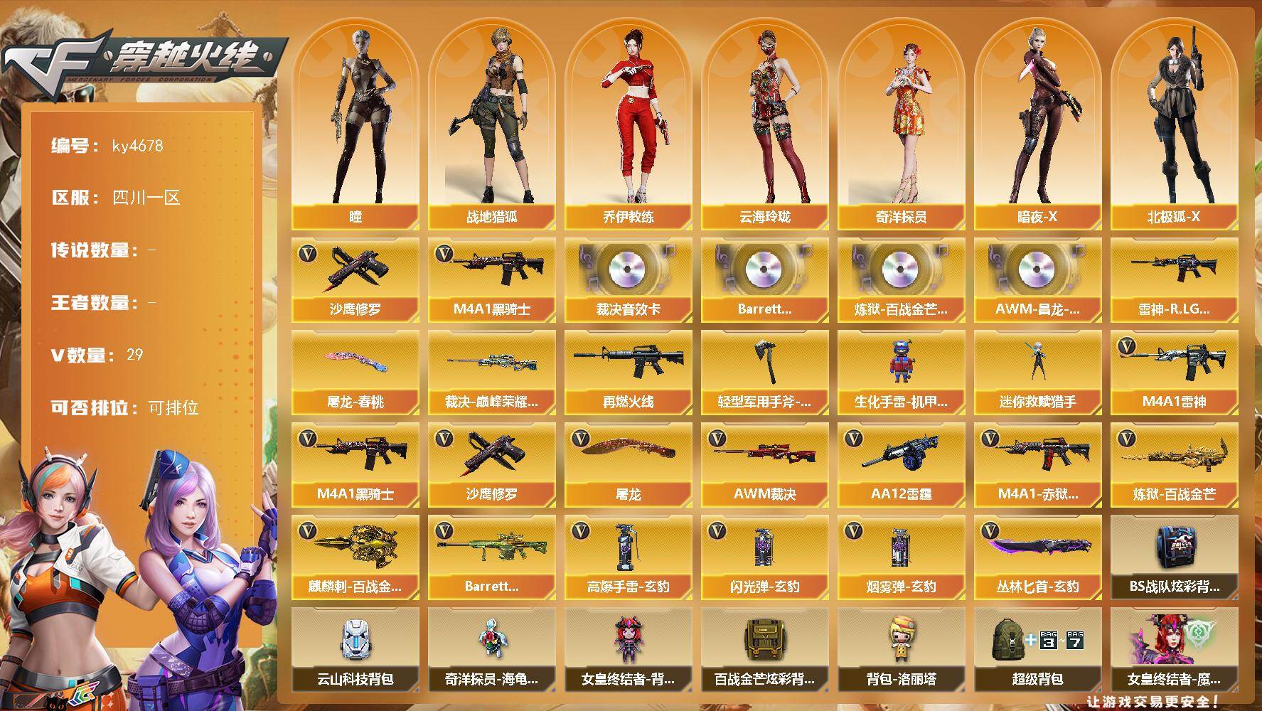[15312960]四川一区-29V-0王者-0炫金 【传说角色】:传说星骇 【热门武器】:M4A1-黑骑士,沙鹰-修罗*3 【音效卡】:AWM-裁决音效卡,Barrett-碧霄极光音效卡*5,炼狱-百战金芒-庆典舞曲音效卡,AWM-昌龙-怀旧音效卡 【皮肤】:裁决-巅峰荣耀 皮肤,雷神-R.LGD-CFPLS18冠军,M4A1-再燃火线,屠龙-春桃 皮肤,轻型军用手斧-再燃火线 【角色】:瞳,战地猎狐,奇洋探员,乔伊教练,云海玲珑,暗夜-X,北极狐-X,初恋灵狐,风暴女,灵狐者-X,龙儿-小淘气,潘多拉-甜心教官,斯沃特-X 【人偶武器】:迷你救赎猎手,生化手雷-机甲核心 【英雄级武器】:M4A1-雷神,M4A1-黑骑士,AWM-裁决,炼狱-百战金芒,AA-12-雷霆,沙鹰-修罗*3,Anaconda-玄豹,屠龙,麒麟刺-百战金芒,丛林匕首-玄豹,高爆手雷-玄豹*3,闪光弹-玄豹*4,烟雾弹-玄豹*3,M4A1-赤狱骑士,Barrett-碧霄极光 【道具】:BS战队炫彩背包,云山科技背包,奇洋探员-海龟背包,女皇终结者-背包,百战金芒炫彩背包,背包-洛丽塔,超级背包,女皇终结者-魔龙之吻,救世主-黑桃战神,黄金生化钩,绿色巨人,灵魂忍者,迷雾幽灵,夺命之镰,防化服*3,流光-鎏金之域,流光-再燃火线,语音特效-盛典烟火,萌萌小葵表情,热带奇洋表情,动感闪耀表情,云海游龙表情,CFPL选手表情-第2套,C4-再燃火线,防弹头盔*3,防弹衣*3,C4工具钳*3,手雷包*3 【特殊枪械】:1黑骑士