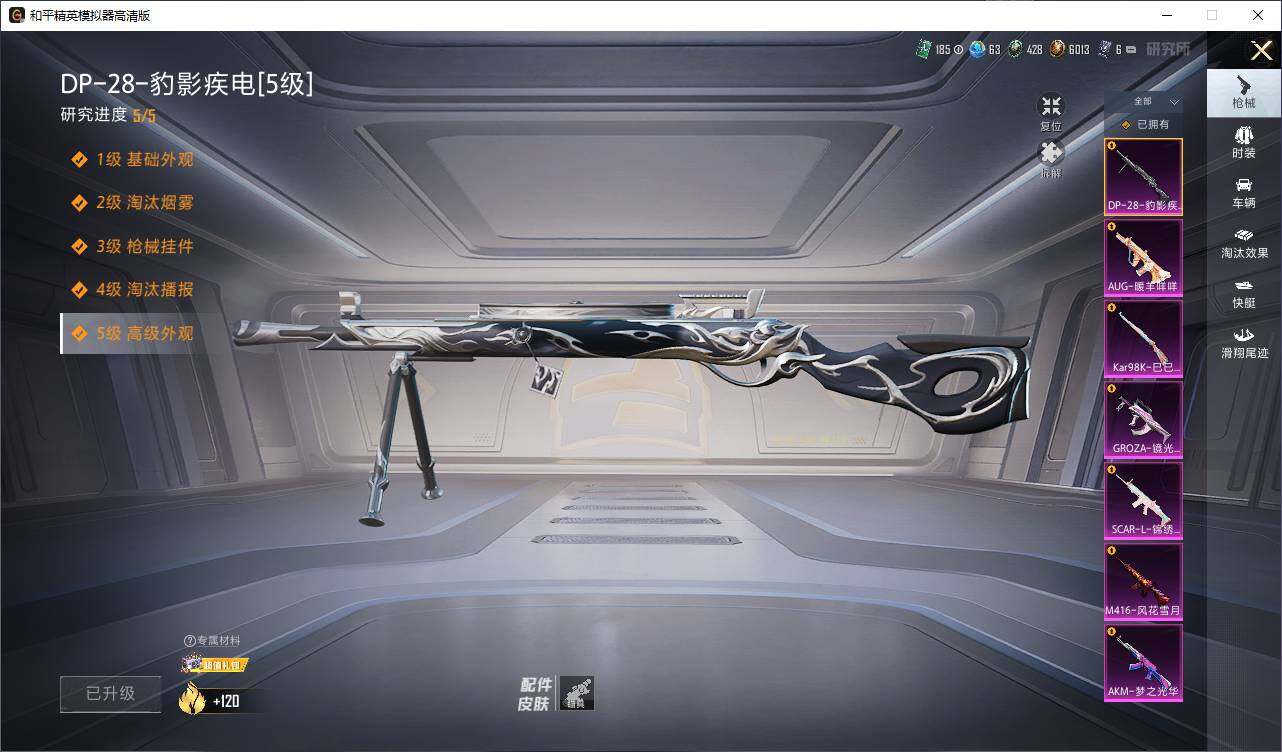 AKM-梦之光华,SCAR-L-锦绣绵绵,M416-风花雪月,GROZA-镜光银凌,AUG-暖羊咩咩,Kar98K-巳巳如意