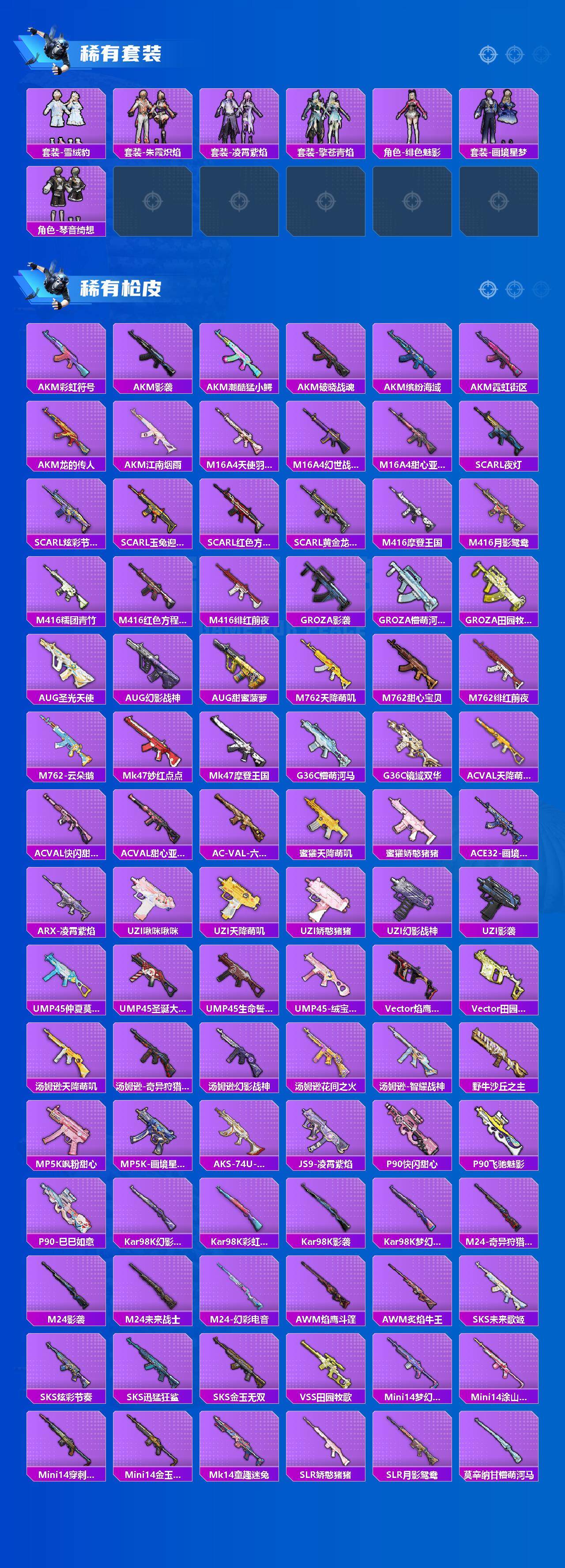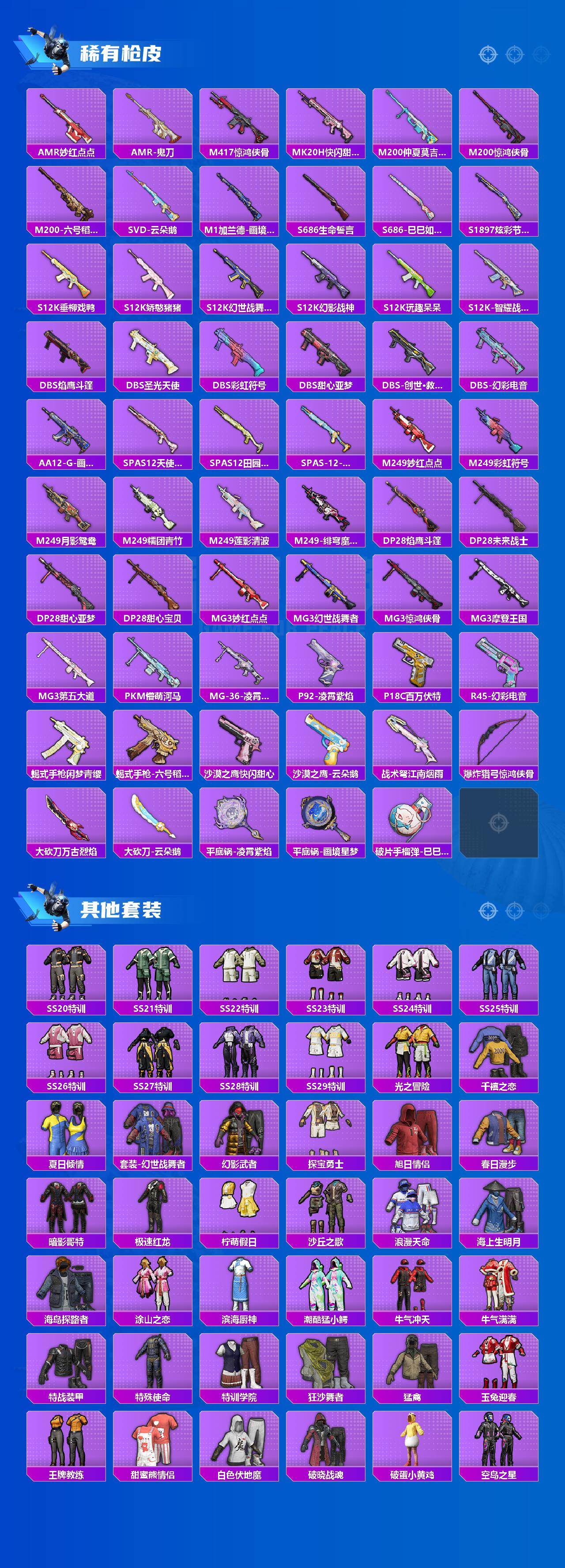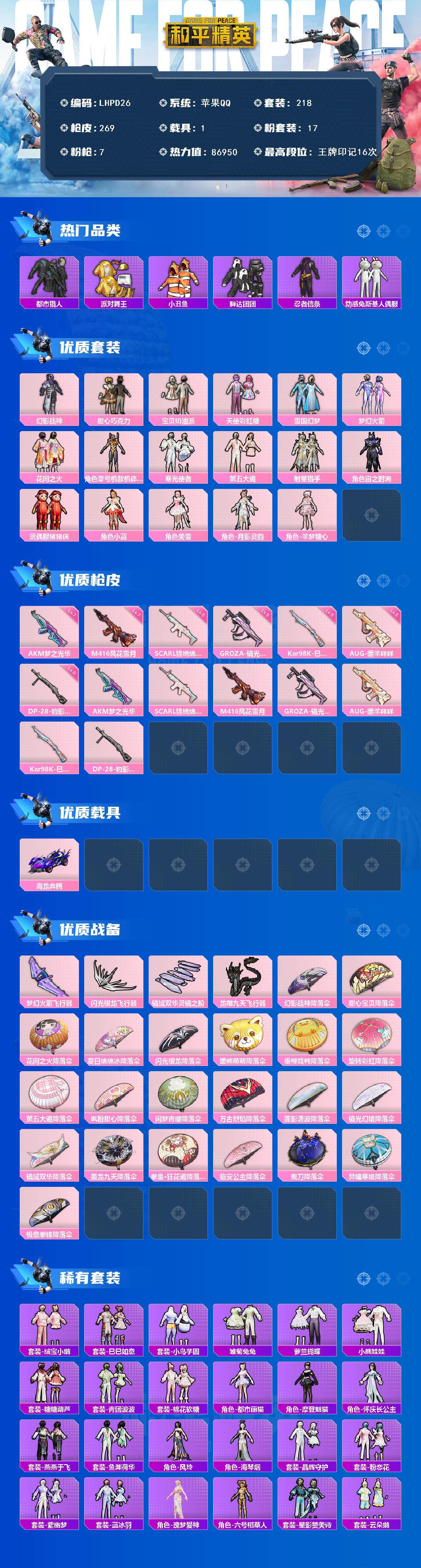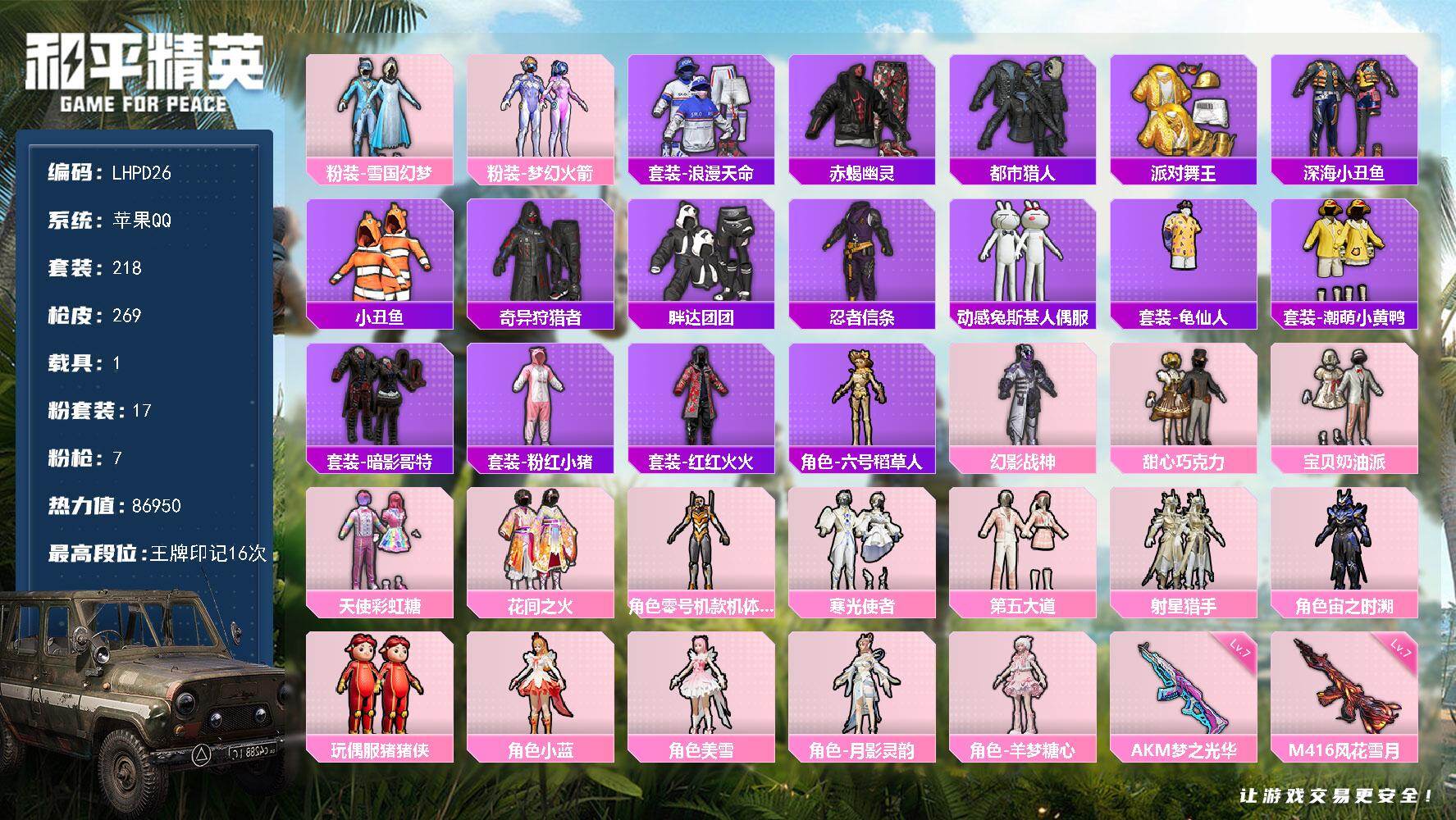 [15311807]【特价出售/店主推荐】极品素材男神号!!! 苹果 手Q-17粉装-7特效枪-1载具-5粉色飞行器-86950热力值-16王牌印记-218套装-269枪皮【热门品类】:粉装-雪国幻梦,粉装-梦幻火箭,套装-浪漫天命,套装-赤蝎幽灵,套装-都市猎人,套装-派对舞王,套装-深海小丑鱼,套装-小丑鱼,套装-奇异狩猎者,套装-胖达团团,套装-忍者信条,套装-动感兔斯基人偶服,套装-龟仙人,套装-潮萌小黄鸭,套装-暗影哥特,套装-粉红小猪,套装-红红火火,角色-六号稻草人【粉色套装】:粉装-幻影战神,粉装-甜心巧克力,粉装-宝贝奶油派,粉装-天使彩虹糖,粉装-雪国幻梦,粉装-梦幻火箭,粉装-花间之火,角色-零号机款机体服,粉装-寒光使者,粉装-第五大道,粉装-射星猎手,角色-宙之时溯,玩偶服-猪猪侠,角色-小蓝,角色-美雪,角色-月影灵韵,角色-羊梦糖心【粉色枪皮等级】:AKM-梦之光华(七级),SCAR-L-锦绣绵绵(五级),M416-风花雪月(七级),GROZA-镜光银凌(五级),AUG-暖羊咩咩(五级),Kar98K-巳巳如意(五级),DP-28-豹影疾电(五级)【粉色载具】:海龙奔腾【粉色枪皮】:AKM-梦之光华,SCAR-L-锦绣绵绵,M416-风花雪月,GROZA-镜光银凌,AUG-暖羊咩咩,Kar98K-巳巳如意,DP-28-豹影疾电