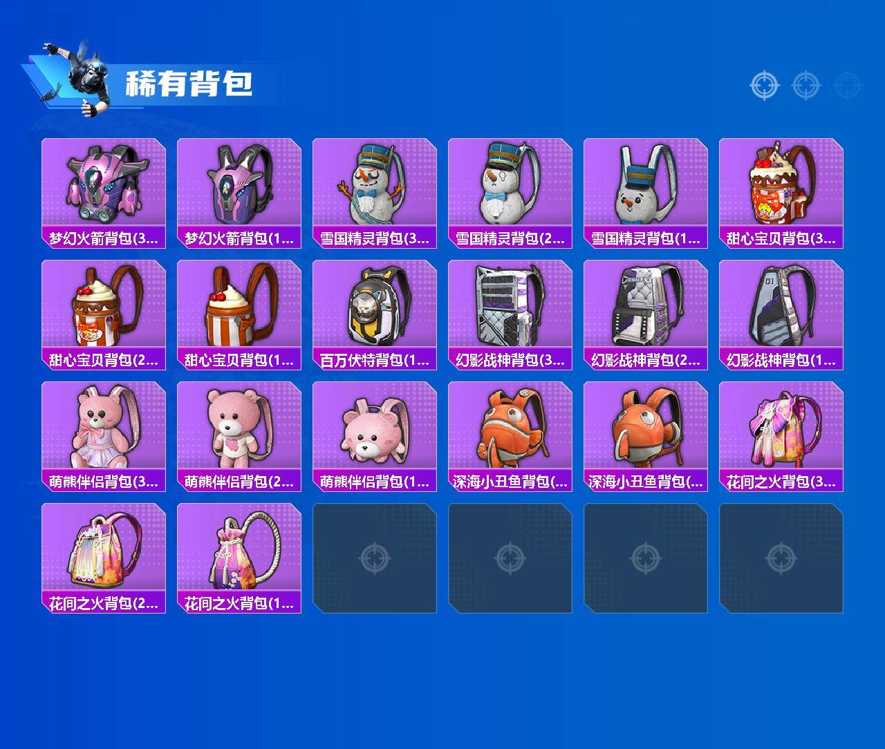 套装-雪国幻梦,套装-梦幻火箭,套装-赤蝎幽灵,套装-都市猎人,套装-派对舞王,套装-深海小丑鱼,套装-奇异狩猎者,套装-胖达团团,套装-潮萌小黄鸭,套装-幻影战神,套装-宝贝奶油派,套装-天使彩虹糖,套装-花间之火,角色-零号机款机体服,套装-寒光使者,套装-第五大道,套装-射星猎手,角色-宙之时溯,玩偶服-猪猪侠,角色-小蓝,角色-美雪,角色-月影灵韵,套装-鹰眼刺客,套装-呆萌铁蟹,套装-迅捷狂鲨