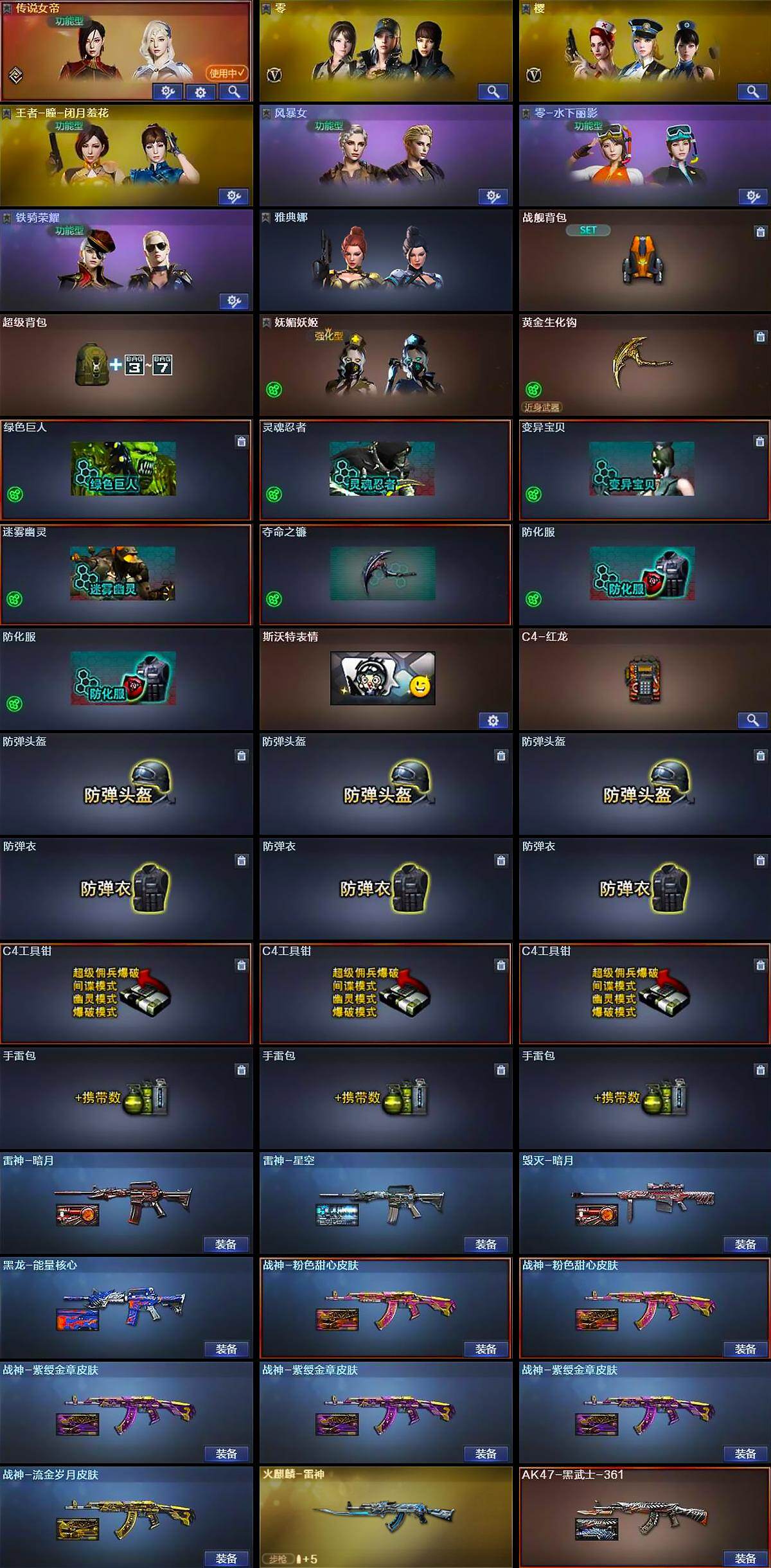 【道具】:战舰背包,超级背包,妩媚妖姬,黄金生化钩,绿色巨人,灵魂忍者,变异宝贝,迷雾幽灵,夺命之镰,防化服*2,斯沃特表情,C4-红龙,防弹头盔*3,防弹衣*3,C4工具钳*3,手雷包*3