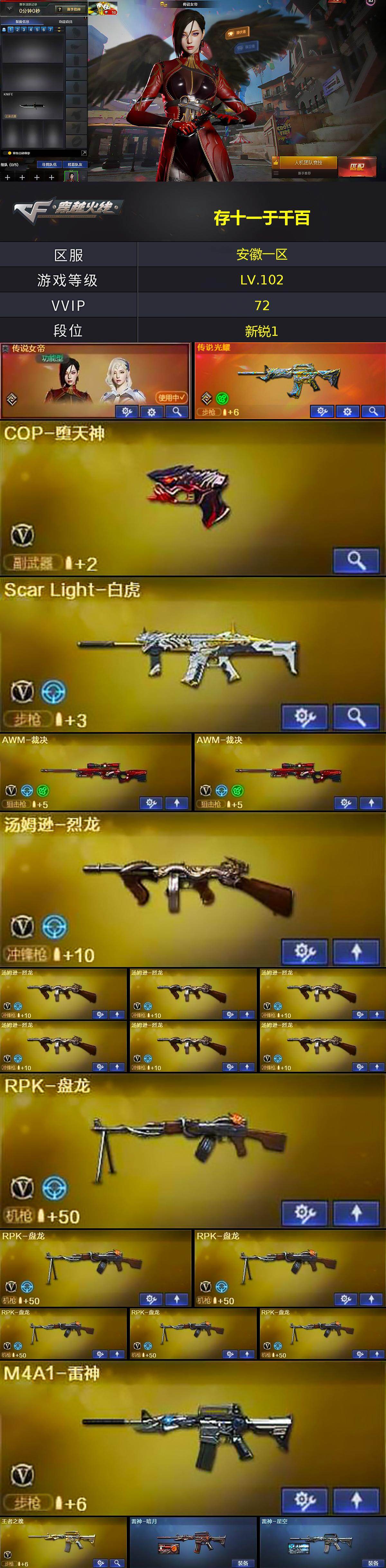 【热门武器】:传说光耀,Scar Light-白虎,HK417-朱雀,死亡之眼,王者炎心,M4A1-黑骑士*2,汤姆逊-烈龙*7,RPK-盘龙*6,加特林-炼狱,COP-堕天神,沙鹰-修罗*3