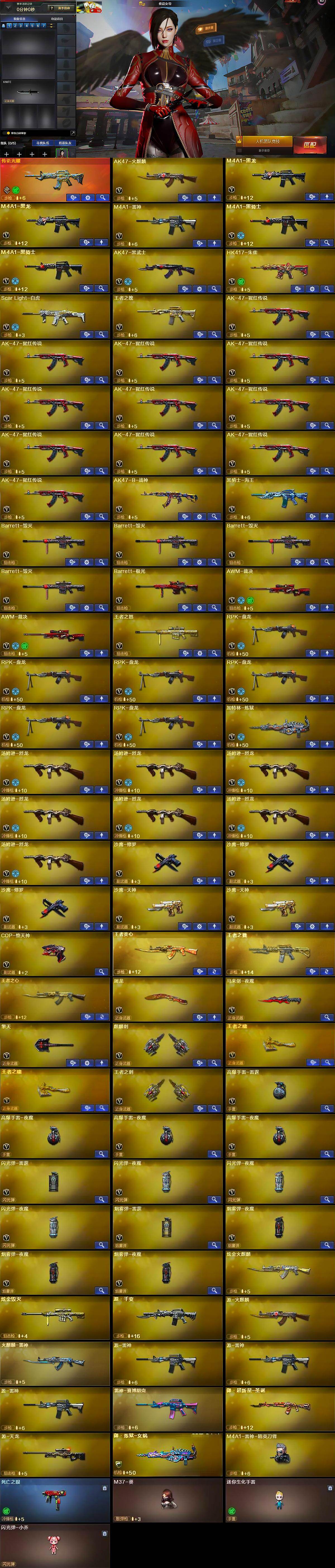 【英雄级武器】:AK47-火麒麟,M4A1-黑龙*2,M4A1-雷神,M4A1-黑骑士*2,AK47-黑武士,HK417-朱雀,Scar Light-白虎,王者之魄-觉醒版,AK-47-猩红传说*11,AK47-B-战神,黑骑士-海王,Barrett-毁灭*4,Barrett-极光,AWM-裁决*2,王者之怒-觉醒版,RPK-盘龙*6,加特林-炼狱,汤姆逊-烈龙*7,沙鹰-修罗*3,沙鹰-天神*2,COP-堕天神,屠龙,马来剑-夜魔,擎天,麒麟刺,王者之啸-觉醒版*2,王者之刺-觉醒版,高爆手雷-雷霆,高爆手雷-夜魔*3,闪光弹-雷霆,闪光弹-夜魔*3,烟雾弹-雷霆,烟雾弹-夜魔*3