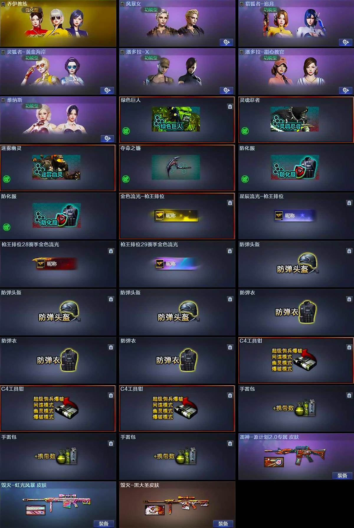 【道具】:绿色巨人,灵魂忍者,迷雾幽灵,夺命之镰,防化服*2,金色流光-枪王排位,星辰流光-枪王排位,枪王排位28赛季金色流光,枪王排位29赛季金色流光,防弹头盔*3,防弹衣*3,C4工具钳*3,手雷包*3