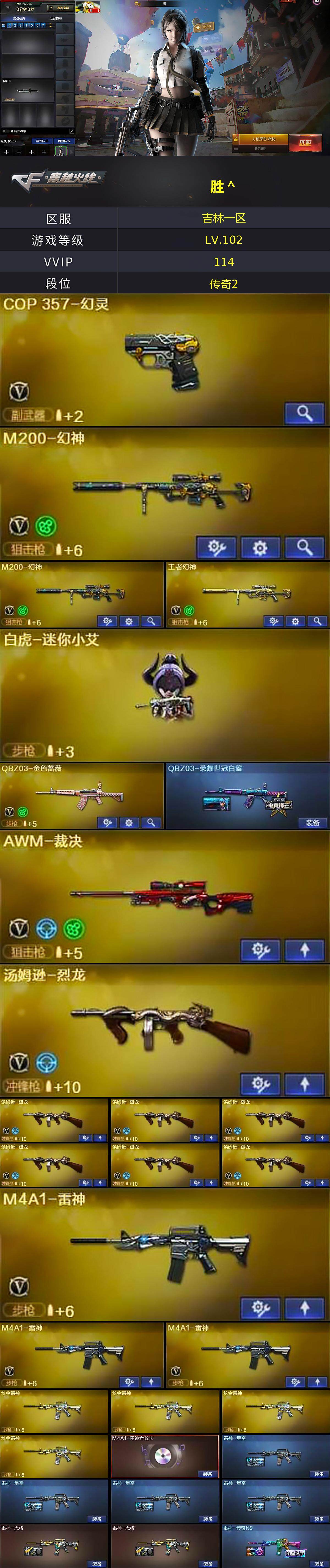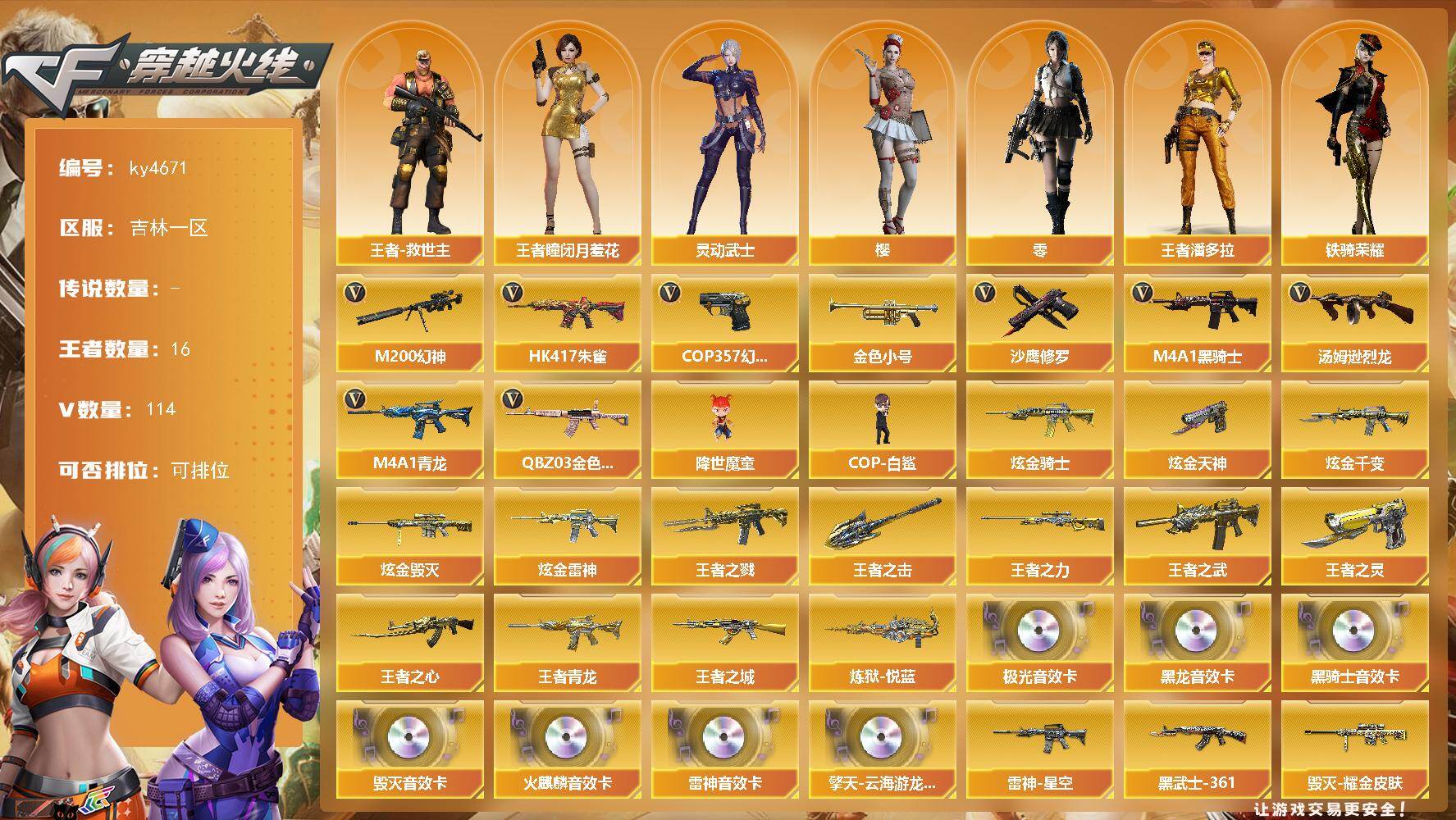 [15314805]吉林一区-114V-16王者-9炫金 【热门武器】:QBZ03-金色蔷薇,HK417-朱雀,M4A1-青龙,M200-幻神*2,金色小号,M4A1-黑骑士*5,汤姆逊-烈龙*7,降世魔童,COP-白鲨,COP 357-幻灵,沙鹰-修罗*6 【王者炫金武器】:王者之城,王者之戮,王者之武,王者之心,王者青龙,王者之力,炼狱-悦蓝,王者之灵*2,王者之击,炫金骑士,炫金千变,炫金雷神*4,炫金毁灭*2,炫金天神 【音效卡】:擎天-云海游龙音效卡,AK47-火麒麟音效卡,M4A1-雷神音效卡,M4A1-黑龙音效卡,M4A1-黑骑士音效卡,Barrett-毁灭音效卡,Barrett-极光音效卡 【皮肤】:QBZ03-荣耀世冠白鲨,雷神-星空*4,雷神-虎将*2,雷神-传奇N9,火麒麟-华夏之心,火麒麟-轻羽皮肤,火麒麟-战神关羽,火麒麟-平天大圣,毁灭耀金皮肤,毁灭-冠军之怒,黑龙-暗月*4,黑骑士-地狱火,黑骑士-电玩青兔皮肤,AK47-黑武士-361,AWM-天龙-传奇70KG,AWM-天龙-传奇白鲨,极光-能量核心,修罗-星空,屠龙-荣耀世冠AG,擎天-冠军之击 【角色】:零,樱,王者-瞳-闭月羞花,王者-救世主,王者潘多拉,灵动武士,曼陀罗-X,铁骑荣耀 【人偶武器】:COP-白鲨,白虎-迷你小艾,天龙-曼陀罗,火麒麟-灵狐*2,M4A1-雷神-精英刀锋,巴雷特-零-水下丽影,M37-葵,降世魔童 【挑战大师】:激光毁灭者III-白马银枪,VEPR-12-金魔*2,激光毁灭者III,神圣爆裂者-末日III 【英雄级武器】:M4A1-千变*2,AK47-火麒麟*5,M4A1-黑龙,M4A1-雷神*3,M4A1-黑骑士*5,AK47-无影*3,M4A1-死神,AK47-黑武士*3,AK12-天启,M4A1-武圣,AK47-黑鲨*5,M4A1-龙血*3,M4A1-青龙,HK417-朱雀,M4A1-玫瑰精灵*2,QBZ03-金色蔷薇,M4A1-猎神,王者之翼-觉醒版,王者之武-觉醒版,AWM-天龙*3,Barrett-毁灭*2,Barrett-极光*2,AWM-裁决,M200-幻神*2,Barrett-金色蔷薇*4,王者之怒-觉醒版,王者幻神-觉醒版,汤姆逊-烈龙*7,AA-12-雷霆*2,沙鹰-修罗*6,沙鹰-天神,COP 357-幻灵,Glock18-武圣,屠龙*4,
