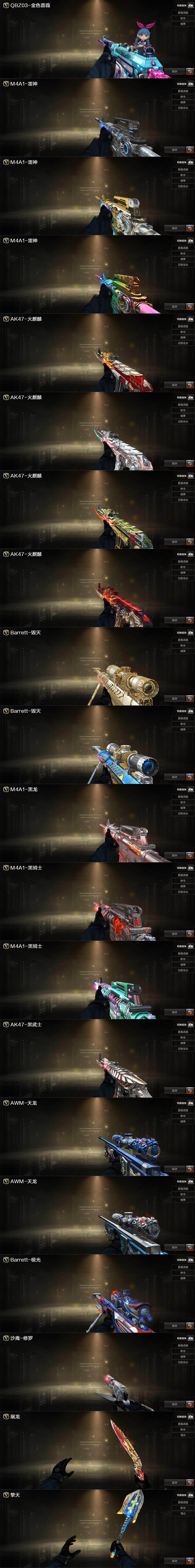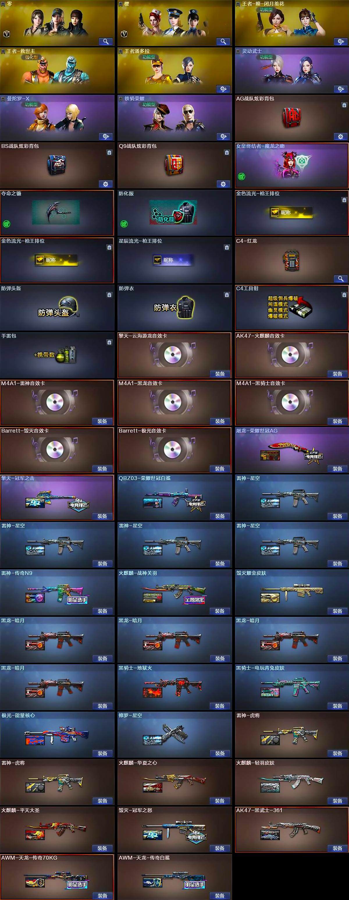 【英雄级武器】:M4A1-千变*2,AK47-火麒麟*5,M4A1-黑龙,M4A1-雷神*3,M4A1-黑骑士*5,AK47-无影*3,M4A1-死神,AK47-黑武士*3,AK12-天启,M4A1-武圣,AK47-黑鲨*5,M4A1-龙血*3,M4A1-青龙,HK417-朱雀,M4A1-玫瑰精灵*2,QBZ03-金色蔷薇,M4A1-猎神,王者之翼-觉醒版,王者之武-觉醒版,AWM-天龙*3,Barrett-毁灭*2,Barrett-极光*2,AWM-裁决,M200-幻神*2,Barrett-金色蔷薇*4,王者之怒-觉醒版,王者幻神-觉醒版,汤姆逊-烈龙*7,AA-12-雷霆*2,沙鹰-修罗*6,沙鹰-天神,COP 357-幻灵,Glock18-武圣,屠龙*4,