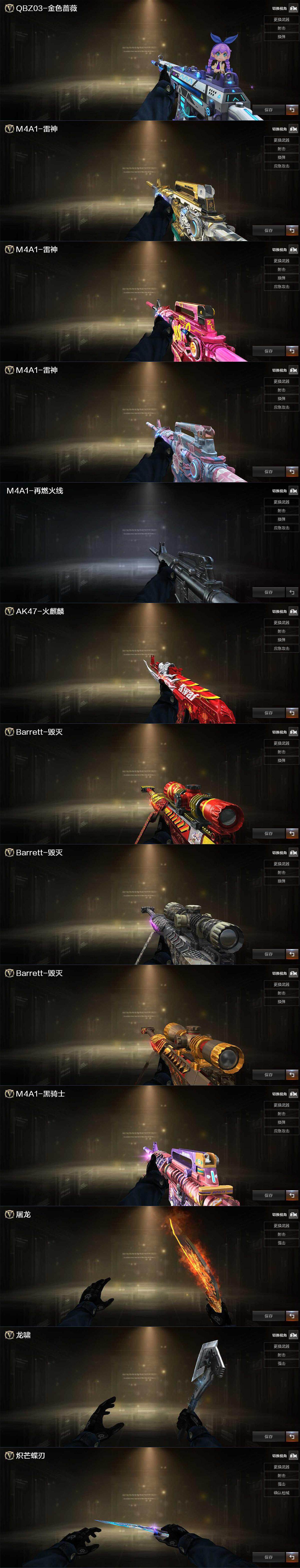 【英雄级武器】:M4A1-黑龙,M4A1-雷神,M4A1-黑骑士*5,Scar Light-白虎,QBZ03-云龙,黑武士-锦绣游龙,超新星-热带奇洋,王者之势-觉醒版,Barrett-毁灭,AWM-裁决,M200-竞技荣光,炼狱-百战金芒,沙鹰-修罗*2,沙鹰-天神,COP 357-雷霆王者-觉醒版,柯尔特-竞技荣光*2,COP 357-云龙,屠龙,擎天-竞技荣光,炽芒蝶刃*2,龙啸-热带奇洋,麒麟刺-百战金芒,高爆手雷-竞技荣光*3,高爆手雷-云龙*3,手雷-热带奇洋,闪光弹-竞技荣光*4,闪光弹-云龙*3,闪光弹-雷霆王者-觉醒版*3,烟雾弹-竞技荣光*5,烟雾弹-云龙*3,烟雾弹-雷霆王者-觉醒版*3,M4A1-赤狱骑士
