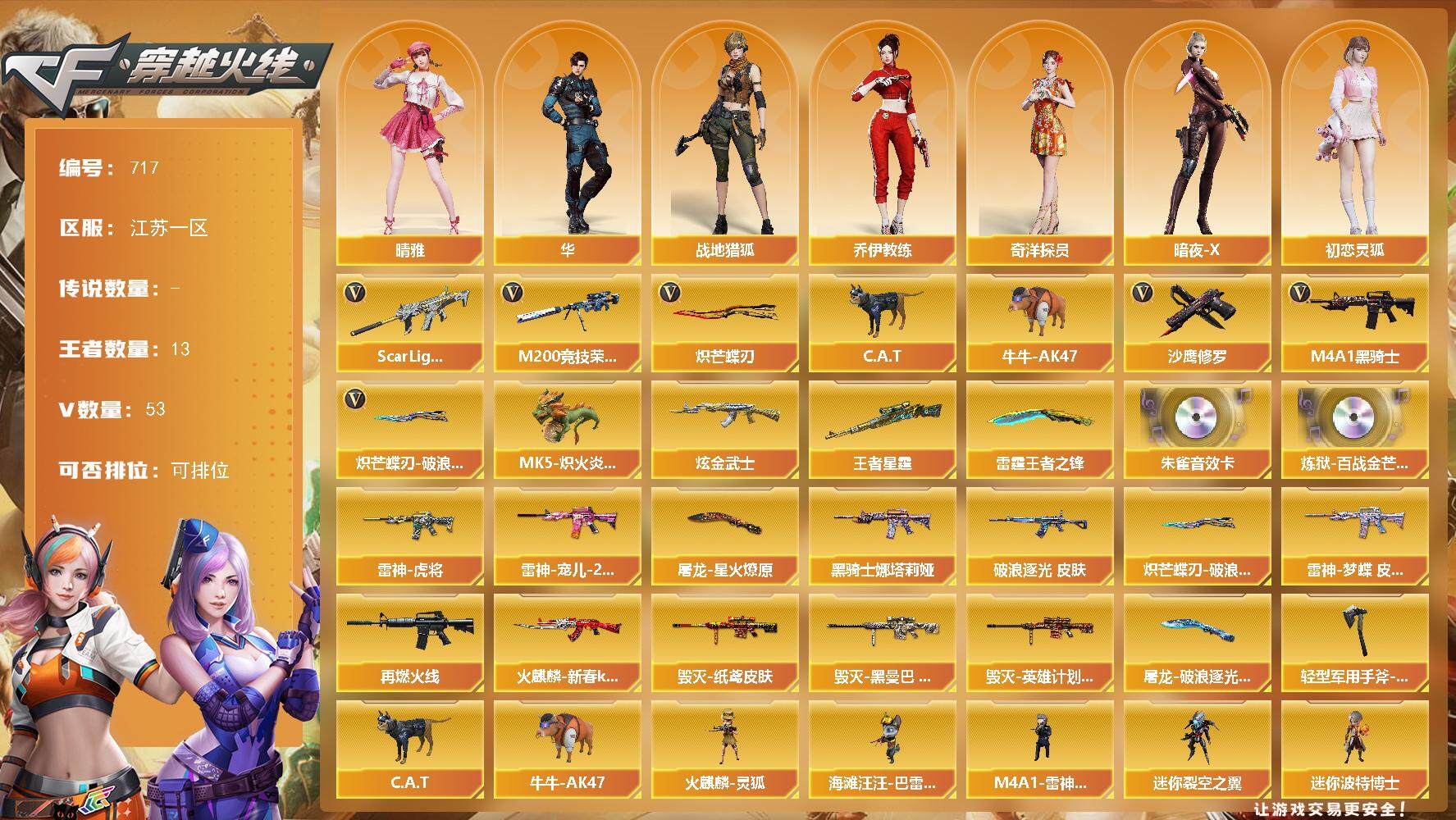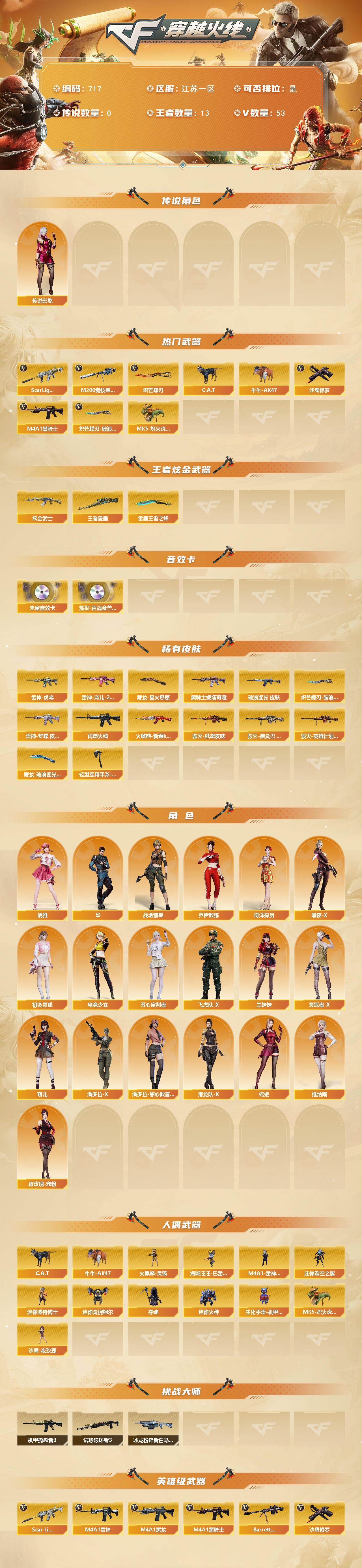 [15315789]江苏一区-53V-13王者-1炫金 【传说角色】:传说影煞 【热门武器】:Scar Light-白虎,M200-竞技荣光,C.A.T,牛牛-AK47,M4A1-黑骑士*5,MK5-炽火炎龙,沙鹰-修罗*2,炽芒蝶刃*2,炽芒蝶刃-破浪逐光 皮肤 【王者炫金武器】:王者星霆,雷霆王者之锋,炫金武士 【音效卡】:HK417-朱雀音效卡,炼狱-百战金芒-庆典舞曲音效卡 【皮肤】:金色蔷薇-破浪逐光 皮肤,雷神-虎将,雷神-宠儿-2019MVP,雷神-梦蝶 皮肤,M4A1-再燃火线,火麒麟-新春kwai乐,毁灭-纸鸢皮肤,毁灭-黑曼巴 皮肤,毁灭-英雄计划 皮肤,M4A1-黑骑士-娜塔莉娅 皮肤,屠龙-星火燎原,屠龙-破浪逐光 皮肤,轻型军用手斧-再燃火线,炽芒蝶刃-破浪逐光 皮肤 【角色】:晴雅,华,战地猎狐,奇洋探员,乔伊教练,暗夜-X,初恋灵狐,电竞少女,芳心审判者,飞虎队-X,兰妹妹,灵狐者-X,萌儿,潘多拉-X,潘多拉-甜心教官,潜龙队-X,蛇姬,维纳斯,夜玫瑰-宠粉 【人偶武器】:火麒麟-灵狐,M4A1-雷神-精英刀锋,MK5-炽火炎龙,海滩汪汪-巴雷特,C.A.T,牛牛-AK47,迷你裂空之翼*2,迷你波特博士,迷你曼提柯尔*2,夺魂*2,迷你火种,生化手雷-机甲核心,沙鹰-夜玫瑰 【挑战大师】:冰龙粉碎者-白马银枪,机甲撕裂者III,试炼破坏者III 【英雄级武器】:M4A1-黑龙,M4A1-雷神,M4A1-黑骑士*5,Scar Light-白虎,QBZ03-云龙,黑武士-锦绣游龙,超新星-热带奇洋,王者之势-觉醒版,Barrett-毁灭,AWM-裁决,M200-竞技荣光,炼狱-百战金芒,沙鹰-修罗*2,沙鹰-天神,COP 357-雷霆王者-觉醒版,柯尔特-竞技荣光*2,COP 357-云龙,屠龙,擎天-竞技荣光,炽芒蝶刃*2,龙啸-热带奇洋,麒麟刺-百战金芒,高爆手雷-竞技荣光*3,高爆手雷-云龙*3,手雷-热带奇洋,闪光弹-竞技荣光*4,闪光弹-云龙*3,闪光弹-雷霆王者-觉醒版*3,烟雾弹-竞技荣光*5,烟雾弹-云龙*3,烟雾弹-雷霆王者-觉醒版*3,M4A1-赤狱骑士 【道具】:BS战队炫彩背包,云山科技背包,亚洲杯纪念炫彩背包,奇洋探员-海龟背包,热带奇洋炫彩背包,百战金芒炫彩背包,臻选金狐背包,超级背包,女皇终结者-魔龙之吻,救世主-黑桃战神,