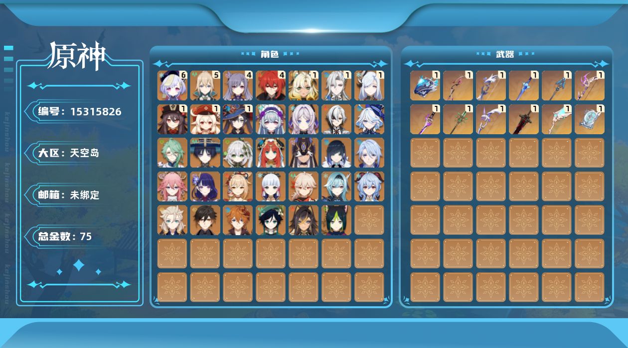 0命阿蕾奇诺,0命芙宁娜,1命那维莱特,0命白术,0命迪希雅,0命流浪者,0命纳西妲,0命妮露,0命赛诺,0命提纳里,0命夜兰,0命神里绫人,0命八重神子,1命申鹤,0命优菈,0命雷电将军,0命枫原万叶,0命神里绫华,0命钟离,1命胡桃,0命甘雨,0命宵宫,0命温迪,1命可莉,0命达达利亚,0命阿贝多,4命刻晴,满命七七,5命琴,1命莫娜,4命迪卢克,1命希诺宁,0命茜特菈莉,0命梦见月瑞希,0命丝柯克,0命菈乌玛,精1万世流涌大典,精1最初的大魔术,精1若水,精1波乱月白经津,精1息灾,精1飞雷之弦振,精1雾切之回光,精1四风原典,精1和璞鸢,精1天空之翼,精1阿莫斯之弓,精1狼的末路