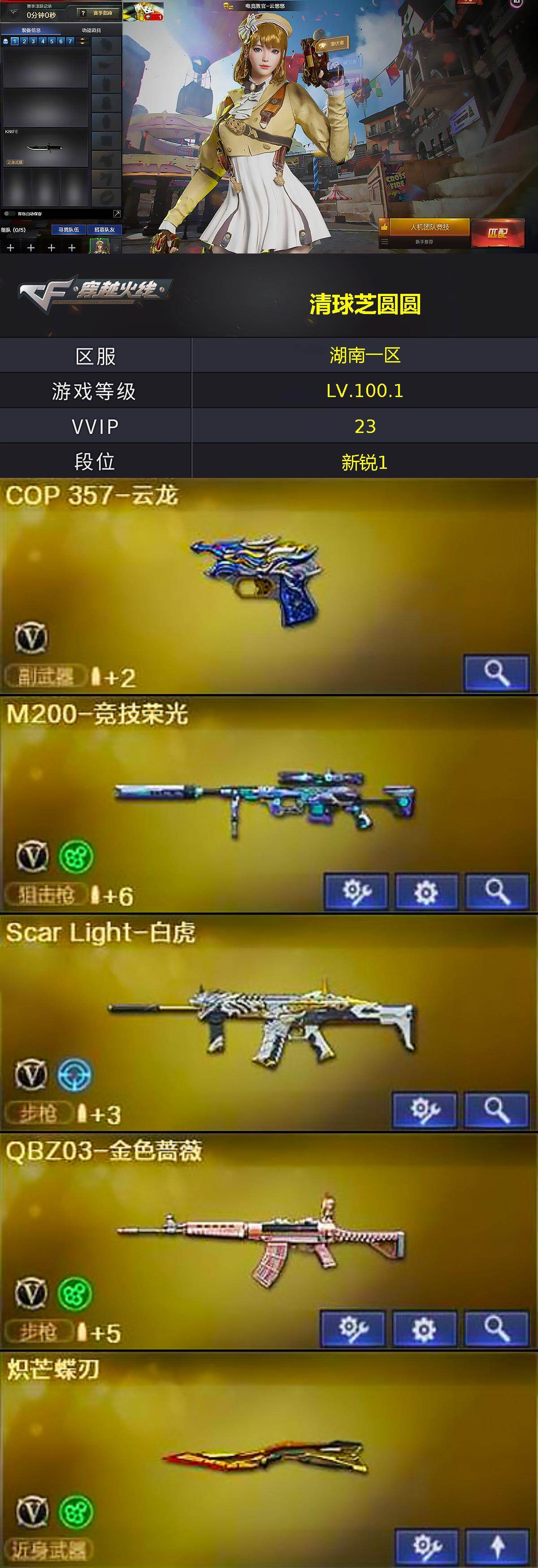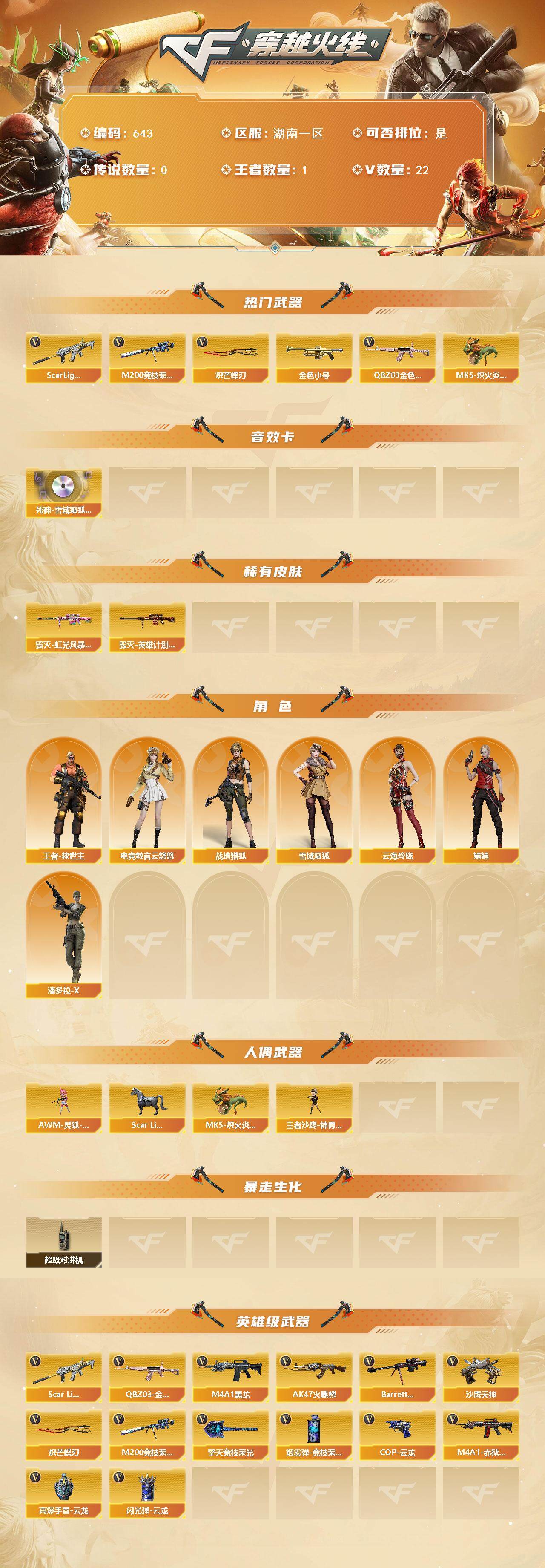 [15316523]湖南一区-22V-1王者-0炫金 【热门武器】:QBZ03-金色蔷薇,Scar Light-白虎,M200-竞技荣光,金色小号,MK5-炽火炎龙,炽芒蝶刃 【音效卡】:死神-雪域霜狐-怀旧音效卡 【皮肤】:毁灭-虹光风暴 皮肤,毁灭-英雄计划 皮肤 【角色】:电竞教官-云悠悠,战地猎狐,王者-救世主,雪域霜狐,云海玲珑,娟娟,潘多拉-X 【人偶武器】:王者沙鹰-神勇金戈,MK5-炽火炎龙,Scar Light-马枪,AWM-灵狐-15周年嘉年华 【暴走生化】:超级对讲机 【英雄级武器】:AK47-火麒麟*2,M4A1-黑龙,Scar Light-白虎,QBZ03-金色蔷薇,Barrett-毁灭,M200-竞技荣光,沙鹰-天神*2,COP 357-云龙,擎天-竞技荣光,炽芒蝶刃,高爆手雷-云龙*2,闪光弹-云龙*2,烟雾弹-竞技荣光*2,M4A1-赤狱骑士 【道具】:BS战队炫彩背包,雪域霜狐炫彩背包,女皇终结者-魔龙之吻,救世主-黑桃战神,绿色巨人,灵魂忍者,迷雾幽灵,夺命之镰,防化服*2,枪王排位28赛季金色流光,CFPL选手表情-第2套,C4-黑曜,C4-再燃火线*2,防弹头盔,防弹衣,C4工具钳,手雷包 【特殊枪械】:1白虎