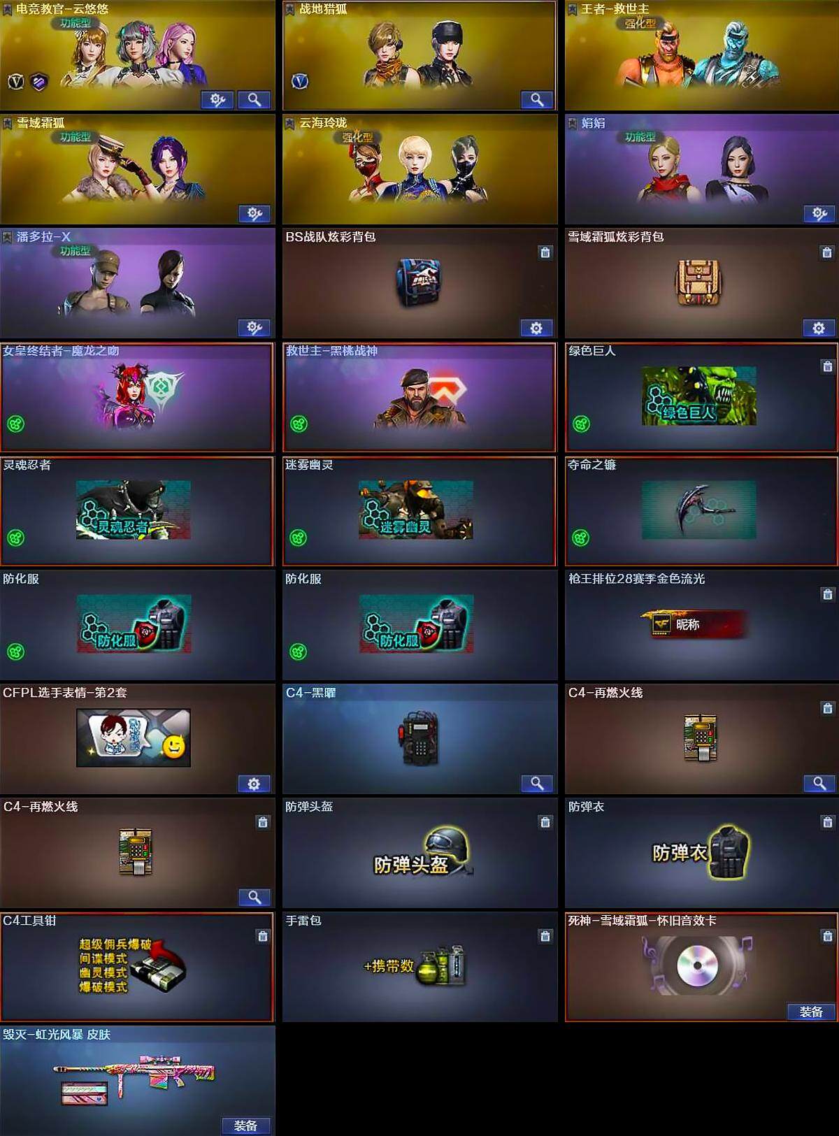 【道具】:BS战队炫彩背包,雪域霜狐炫彩背包,女皇终结者-魔龙之吻,救世主-黑桃战神,绿色巨人,灵魂忍者,迷雾幽灵,夺命之镰,防化服*2,枪王排位28赛季金色流光,CFPL选手表情-第2套,C4-黑曜,C4-再燃火线*2,防弹头盔,防弹衣,C4工具钳,手雷包