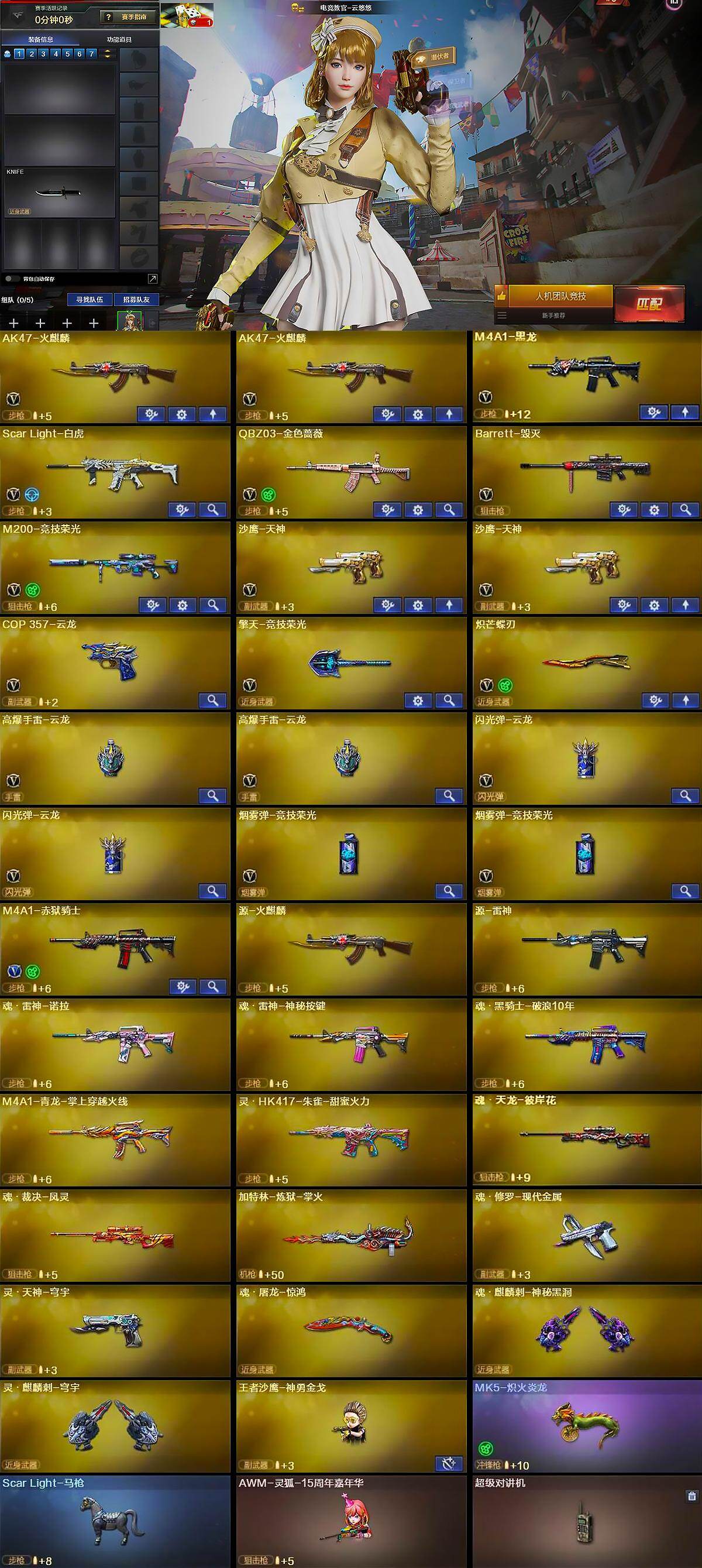 【英雄级武器】:AK47-火麒麟*2,M4A1-黑龙,Scar Light-白虎,QBZ03-金色蔷薇,Barrett-毁灭,M200-竞技荣光,沙鹰-天神*2,COP 357-云龙,擎天-竞技荣光,炽芒蝶刃,高爆手雷-云龙*2,闪光弹-云龙*2,烟雾弹-竞技荣光*2,M4A1-赤狱骑士