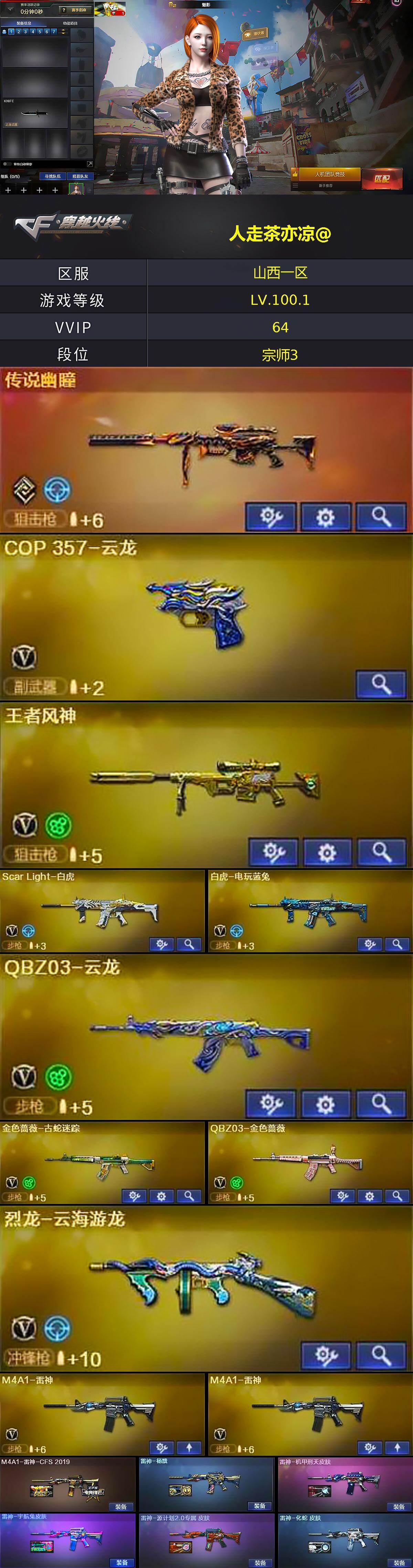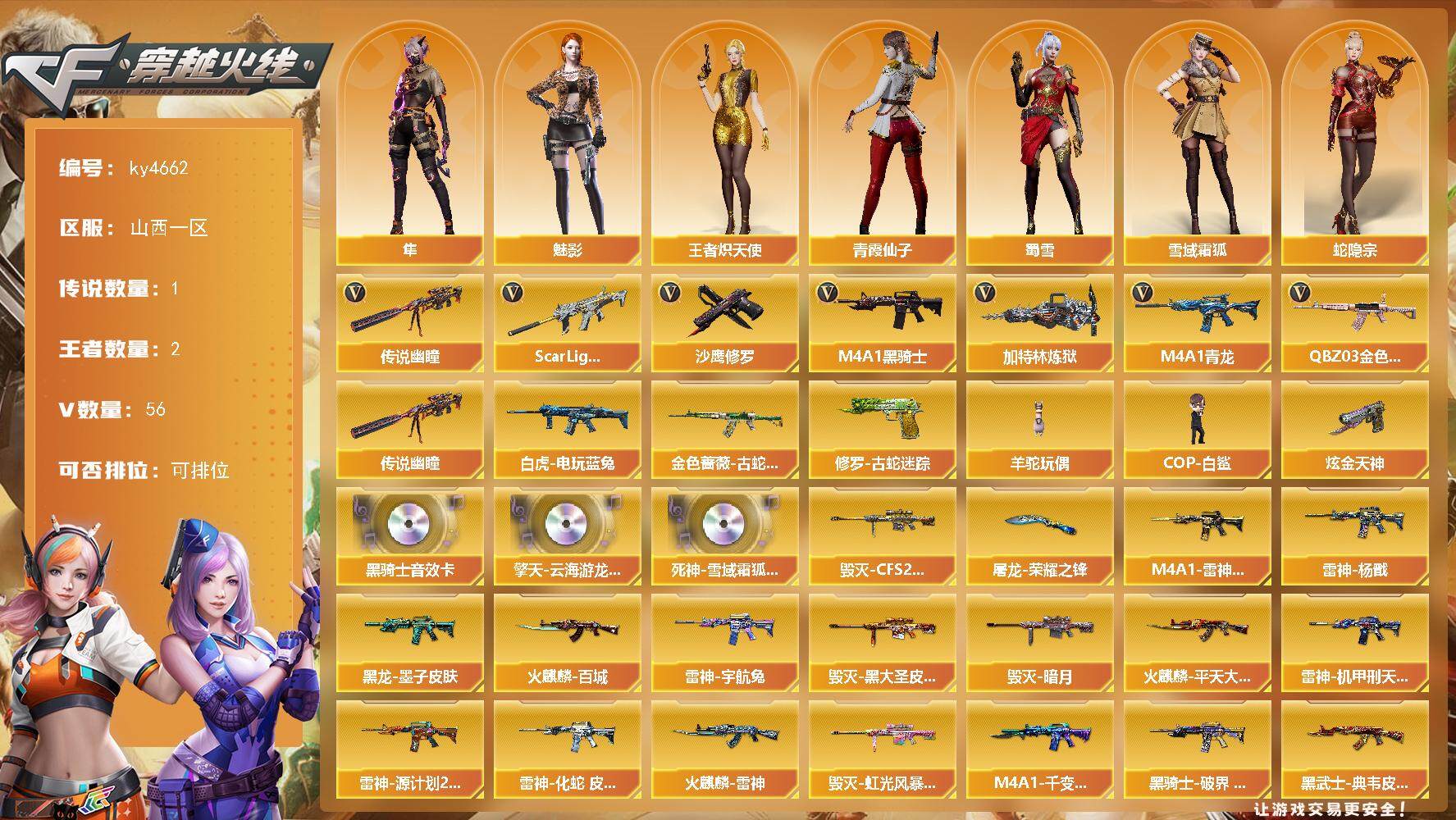 [15318303]山西一区-56V-2王者-1炫金 【传说武器】:传说幽瞳 【热门武器】:传说幽瞳,QBZ03-金色蔷薇,Scar Light-白虎,M4A1-青龙,金色蔷薇-古蛇迷踪,修罗-古蛇迷踪,白虎-电玩蓝兔,M4A1-黑骑士,加特林-炼狱*2,羊驼玩偶,COP-白鲨,沙鹰-修罗 【王者炫金武器】:炫金天神 【音效卡】:擎天-云海游龙音效卡,M4A1-黑骑士音效卡,死神-雪域霜狐-怀旧音效卡 【皮肤】:M4A1-雷神-CFS 2019,雷神-杨戬,雷神-机甲刑天皮肤,雷神-宇航兔皮肤,雷神-源计划2.0专属 皮肤,雷神-化蛇 皮肤,火麒麟-雷神,火麒麟-平天大圣*3,火麒麟-百城*2,毁灭-暗月,毁灭-CFS2020,毁灭-黑大圣皮肤,毁灭-虹光风暴 皮肤,M4A1-千变-孔明皮肤,黑龙-墨子皮肤,黑骑士-破界 皮肤,黑武士-典韦皮肤,烈火-熔核皮肤,战神-粉色甜心皮肤,战神-紫绶金章皮肤,战神-流金岁月皮肤,AK47-B-常胜将军-刘备,炼狱-玩具枪皮肤,屠龙-荣耀之锋 【角色】:魅影,隼,王者炽天使,雪域霜狐,蛇隐宗,奇洋探员,乔伊教练,云海玲珑,暗夜-X,北极狐-X,初恋灵狐,芳心审判者,飞虎队-X,风暴女*2,虎妞,嘉年华灵狐,娟娟,兰妹妹,0号玩家,灵狐-花神,灵狐者-X,灵狐者-七夕宝贝,流浪蔷薇,龙儿,龙儿-小淘气,麻雀,曼陀罗-X,曼陀罗-礼服,潘多拉-X,潘多拉-甜心教官,潜龙队-X,青霞仙子,蛇姬,蜀雪,兔囡囡,维纳斯,夜玫瑰-幻能朋克,樱-战斗天使,影武者-X 【人偶武器】:COP-白鲨,天龙-曼陀罗,M4A1-雷神-精英刀锋,Scar Light-马枪,AWM-灵狐-15周年嘉年华,迷你深渊冰龙,迷你波特博士*2,夺魂*2,生化手雷-机甲核心*2,深渊终结者手雷*2,迷你超能女侍,迷你巨石泰坦-魔花研究所 【暴走生化】:KAC-狂怒咆哮,超级对讲机 【挑战大师】:冰龙粉碎者-白马银枪*2,激光毁灭者III-白马银枪,神圣爆裂者-末日III*3 【英雄级武器】:M4A1-千变,AK47-火麒麟,M4A1-黑龙,M4A1-雷神*2,M4A1-黑骑士,AK47-黑武士,M4A1-青龙,Scar Light-白虎,无影-神兵利器,QBZ03-云龙,黑武士-锦绣游龙,超新星-热带奇洋,金色蔷薇-古蛇迷踪,死神-雪域霜狐,QBZ03-金色蔷薇,烈火-动感闪耀,A