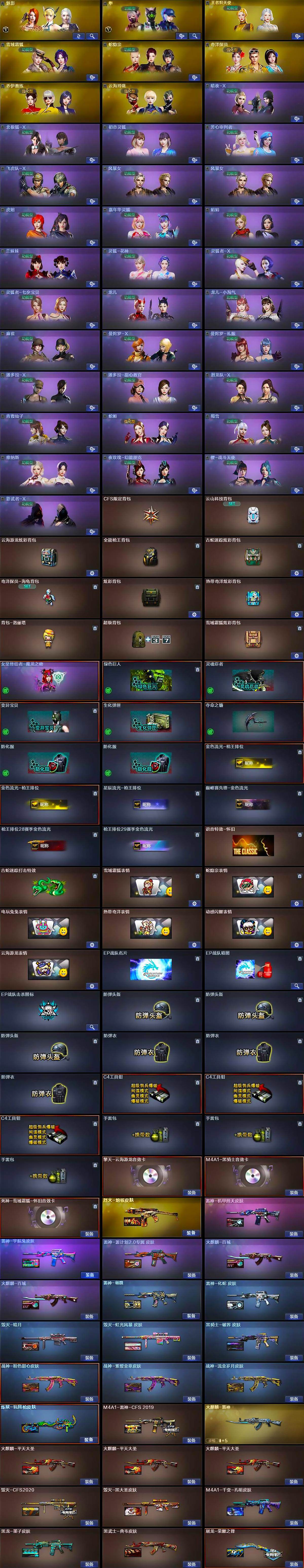 【皮肤】:M4A1-雷神-CFS 2019,雷神-杨戬,雷神-机甲刑天皮肤,雷神-宇航兔皮肤,雷神-源计划2.0专属 皮肤,雷神-化蛇 皮肤,火麒麟-雷神,火麒麟-平天大圣*3,火麒麟-百城*2,毁灭-暗月,毁灭-CFS2020,毁灭-黑大圣皮肤,毁灭-虹光风暴 皮肤,M4A1-千变-孔明皮肤,黑龙-墨子皮肤,黑骑士-破界 皮肤,黑武士-典韦皮肤,烈火-熔核皮肤,战神-粉色甜心皮肤,战神-紫绶金章皮肤,战神-流金岁月皮肤,AK47-B-常胜将军-刘备,炼狱-玩具枪皮肤,屠龙-荣耀之锋