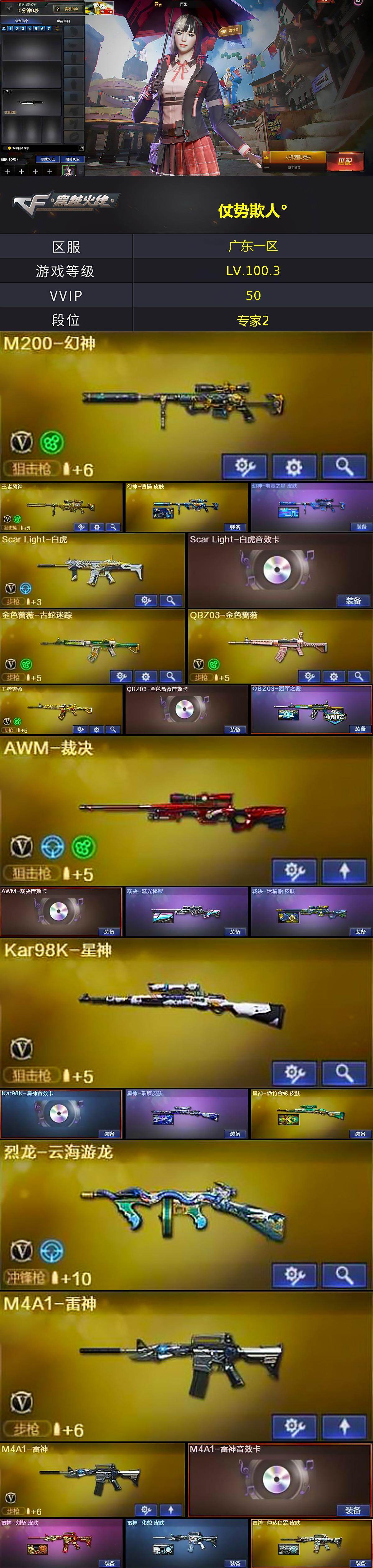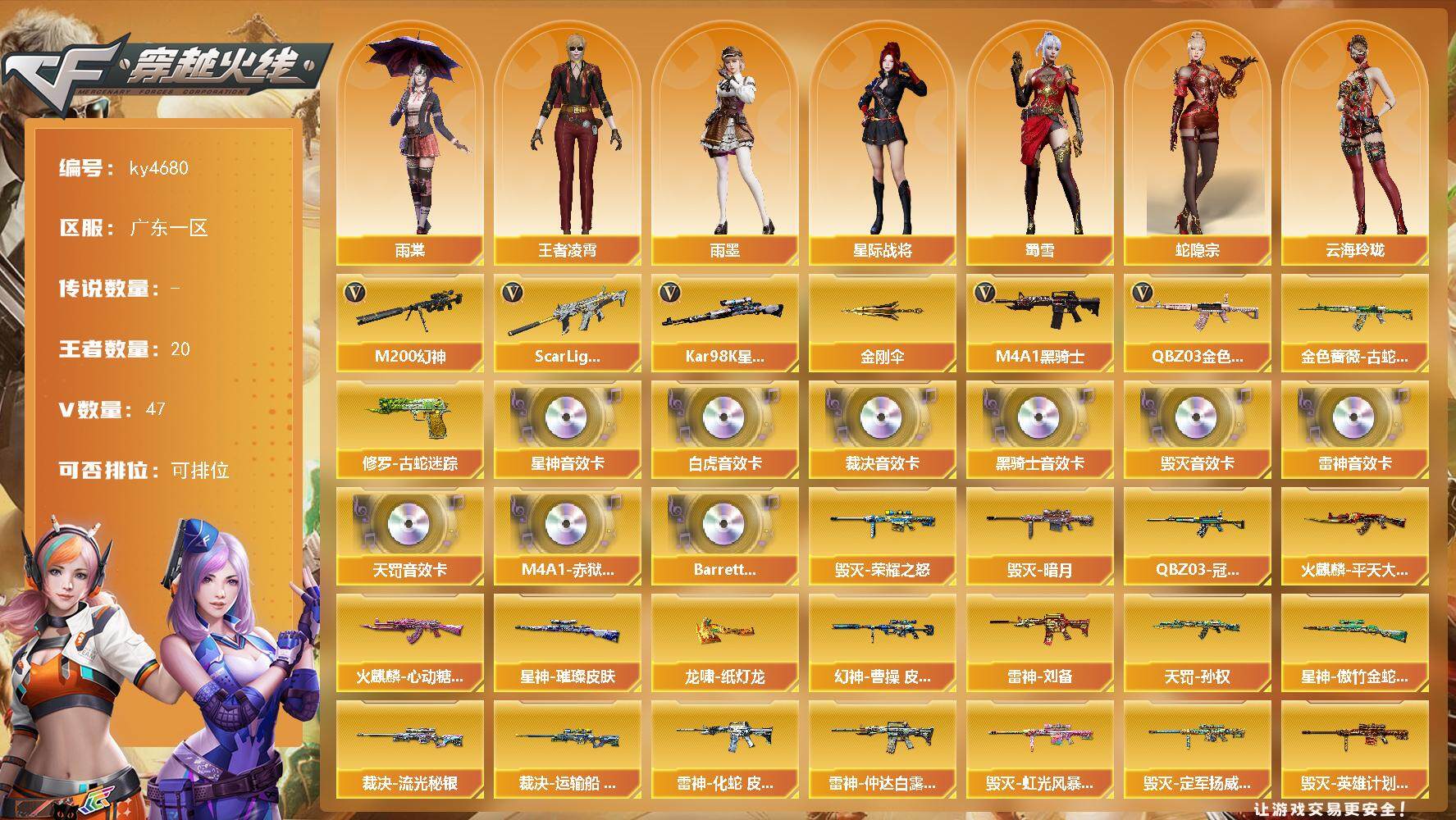 [15319226]广东一区-47V-20王者-0炫金 【热门武器】:QBZ03-金色蔷薇,Scar Light-白虎,M200-幻神,金色蔷薇-古蛇迷踪,修罗-古蛇迷踪,Kar98K-星神,M4A1-黑骑士,金刚伞 【音效卡】:M4A1-雷神音效卡,M4A1-黑骑士音效卡,Barrett-毁灭音效卡,AWM-裁决音效卡,Scar Light-白虎音效卡,Kar98K-星神音效卡,QBZ03-天罚音效卡,M4A1-赤狱骑士-怀旧音效卡,Barrett-碧霄极光音效卡 【皮肤】:幻神-曹操 皮肤,幻神-电竞之星 皮肤,QBZ03-冠军之薇,裁决-流光秘银,裁决-运输船 皮肤,星神-璀璨皮肤,星神-傲竹金蛇 皮肤,雷神-刘备 皮肤,雷神-化蛇 皮肤,雷神-仲达白露 皮肤,火麒麟-平天大圣,火麒麟-心动糖果,毁灭-暗月,毁灭-荣耀之怒,毁灭-虹光风暴 皮肤,毁灭-定军扬威 皮肤,毁灭-英雄计划 皮肤,黑骑士-破界 皮肤,天罚-孙权 皮肤,屠龙-惊鸿 皮肤,龙啸-纸灯龙皮肤,麒麟刺-荣耀世冠白鲨 【角色】:雨棠,星际战将,雨墨,王者凌霄,蛇隐宗,云海玲珑,暗夜-X,北极狐-X,电竞少女,芳心审判者,风暴女*2,虎妞,嘉年华灵狐,娟娟,葵-赛博朋克,0号玩家,灵狐者-X,龙儿,麻雀,曼陀罗-X,萌儿,潘多拉-X,潘多拉-甜心教官,蛇姬,斯沃特-X,蜀雪,维纳斯,夜玫瑰-宠粉,影武者-X 【人偶武器】:天龙-曼陀罗,加特林-机械猎手,AWM-灵狐-15周年嘉年华,COP-旗袍,迷你深渊冰龙,迷你裂空之翼,迷你波特博士,迷你曼提柯尔,迷你牛牛,迷你火种,生化手雷-机甲核心,深渊终结者手雷,迷你巨石泰坦-魔花研究所 【暴走生化】:超级对讲机 【挑战大师】:冰龙粉碎者-白马银枪,激光毁灭者III-白马银枪,VEPR-12-金魔,激光毁灭者III,机甲撕裂者III,试炼破坏者III,KAC-圣炎切割者III,神圣爆裂者-末日III,阐释者III,惩戒者III 【英雄级武器】:AK47-火麒麟*2,M4A1-黑龙,M4A1-雷神*2,M4A1-黑骑士,AK47-无影,AN94-超新星,Scar Light-白虎,QBZ03-天罚,无影-神兵利器,黑武士-锦绣游龙,金色蔷薇-古蛇迷踪,QBZ03-金色蔷薇,王者之城-觉醒版,黑骑士-海王,王者风势-觉醒版,王者芳薇-觉醒版,AWM-天龙,Barrett-毁灭