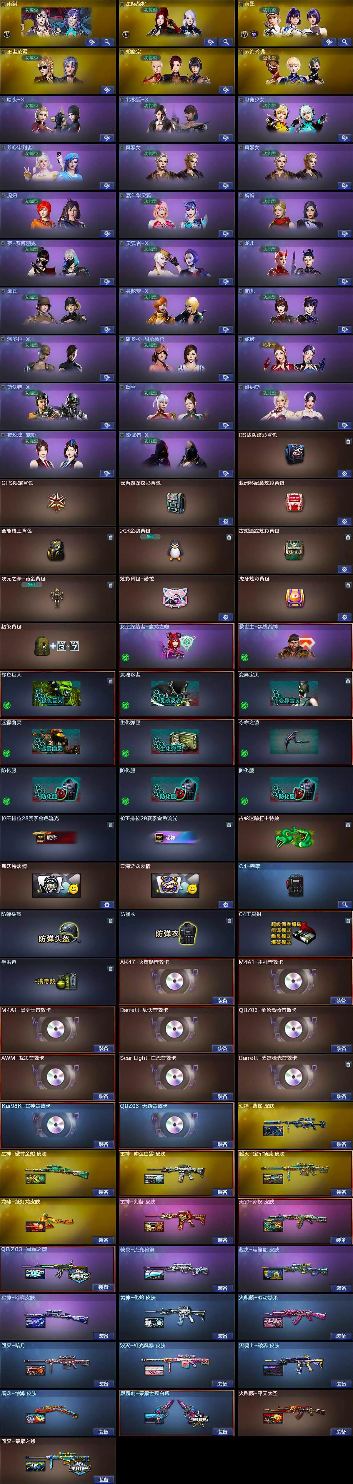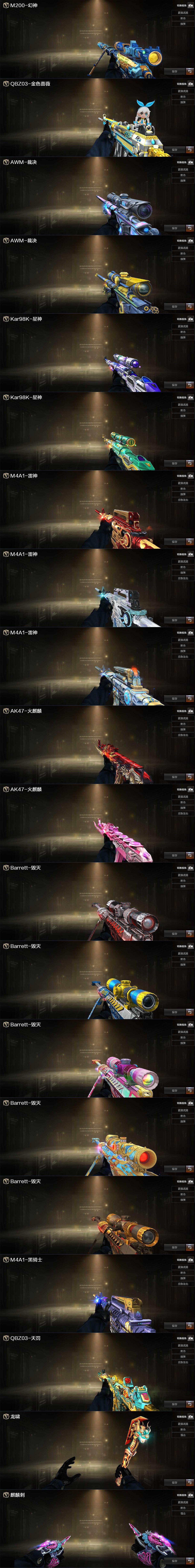 【音效卡】:M4A1-雷神音效卡,M4A1-黑骑士音效卡,Barrett-毁灭音效卡,AWM-裁决音效卡,Scar Light-白虎音效卡,Kar98K-星神音效卡,QBZ03-天罚音效卡,M4A1-赤狱骑士-怀旧音效卡,Barrett-碧霄极光音效卡