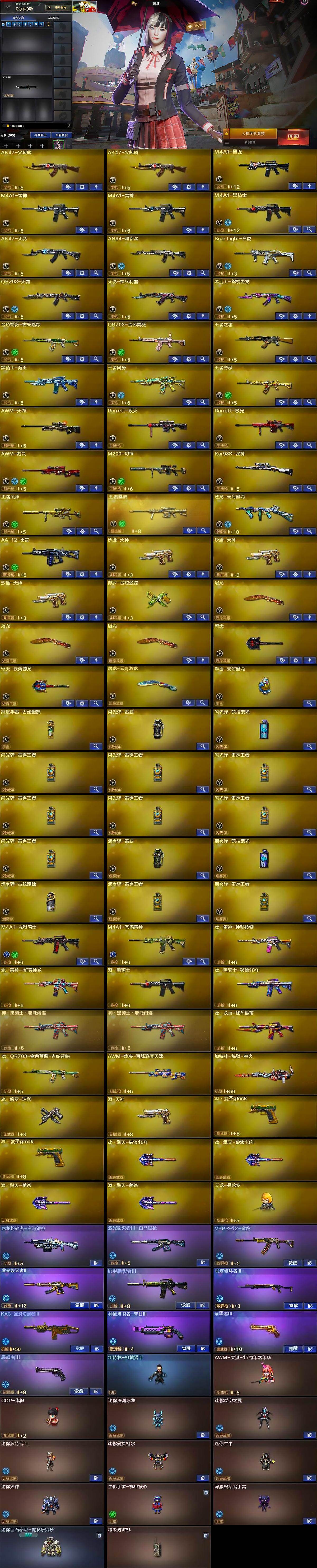 【英雄级武器】:AK47-火麒麟*2,M4A1-黑龙,M4A1-雷神*2,M4A1-黑骑士,AK47-无影,AN94-超新星,Scar Light-白虎,QBZ03-天罚,无影-神兵利器,黑武士-锦绣游龙,金色蔷薇-古蛇迷踪,QBZ03-金色蔷薇,王者之城-觉醒版,黑骑士-海王,王者风势-觉醒版,王者芳薇-觉醒版,AWM-天龙,Barrett-毁灭