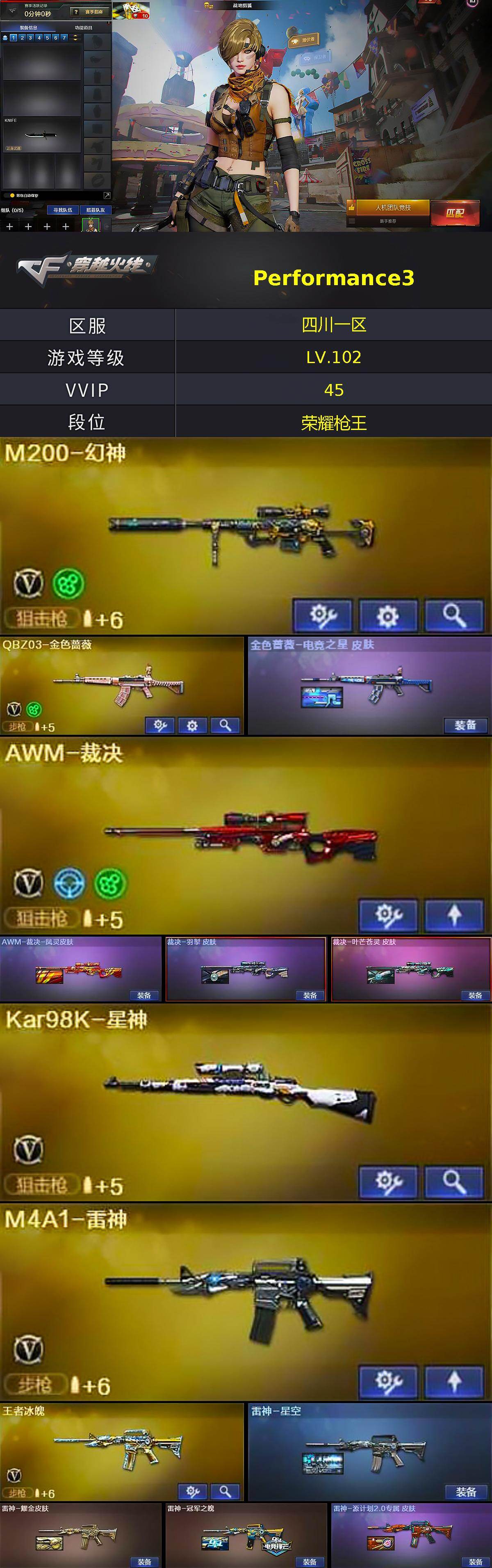 [15319482]四川一区-45V-5王者-0炫金 【热门武器】:QBZ03-金色蔷薇,M200-幻神,死亡之眼,Kar98K-星神,M4A1-黑骑士,沙鹰-修罗*2 【王者炫金武器】:王者之魄高爆手雷,王者之魄闪光弹 【音效卡】:M4A1-黑骑士音效卡,Barrett-毁灭音效卡,绝迹语音包 【皮肤】:金色蔷薇-电竞之星 皮肤,AWM-裁决-凤灵皮肤,裁决-羽掣 皮肤,裁决-叶芒苍灵 皮肤,雷神-星空,雷神-耀金皮肤,雷神-冠军之魄,雷神-源计划2.0专属 皮肤,火麒麟-平天大圣,毁灭耀金皮肤,毁灭-黑大圣皮肤,毁灭-黑曼巴 皮肤,毁灭-百城浙江 皮肤,毁灭-巅峰荣耀 皮肤,黑骑士耀金皮肤,战神-粉色甜心皮肤,战神-紫绶金章皮肤,AWM-天龙-传奇70KG,修罗-能量核心,屠龙-惊鸿 皮肤 【角色】:战地猎狐,暗夜-X,电竞少女,风暴女,嘉年华灵狐,娟娟,兰-海滩派对,0号玩家,龙儿,麻雀,曼陀罗-X,潘多拉-X,潘多拉-甜心教官,潜龙队-X,青霞仙子,斯沃特-X,蜀雪,铁骑荣耀,维纳斯,职业选手,智影 【人偶武器】:天龙-曼陀罗,AWM-灵狐-15周年嘉年华,迷你牛魔王,生化手雷-机甲核心,闪光弹-小乔 【暴走生化】:死亡之眼,超级对讲机 【挑战大师】:冰龙粉碎者-白马银枪,激光毁灭者III 【英雄级武器】:AK47-火麒麟,M4A1-雷神,M4A1-黑骑士,M4A1-武圣,AK47-黑鲨,无影-神兵利器,黑武士-锦绣游龙,M4A1-玫瑰精灵,QBZ03-金色蔷薇,王者冰魄-觉醒版,AK47-B-常胜将军,AWM-天龙,Barrett-毁灭,AWM-裁决,M200-幻神,Kar98K-星神,沙鹰-修罗*2,沙鹰-天神,屠龙,龙啸*7,麒麟刺-堕天神,擎天,斩神刀-雷暴,王者之锋-觉醒版,王者之击-觉醒版,高爆手雷-雷暴,高爆手雷-堕天神,闪光弹-雷暴,闪光弹-堕天神,烟雾弹-雷暴,烟雾弹-堕天神,M4A1-赤狱骑士 【道具】:BS战队炫彩背包,EDG炫彩背包,亚洲杯纪念炫彩背包,冰冰企鹅背包-猛男专用,炫彩背包,超级背包,女皇终结者-魔龙之吻,救世主-黑桃战神,黄金生化钩,绿色巨人,灵魂忍者,迷雾幽灵,生化弹匣,夺命之镰,防化服*3,金色流光-枪王排位*2,星辰流光-枪王排位,枪王排位28赛季金色流光,枪王排位29赛季金色流光,防弹头盔*6,防弹衣*6,C4工具钳*5,手雷包*