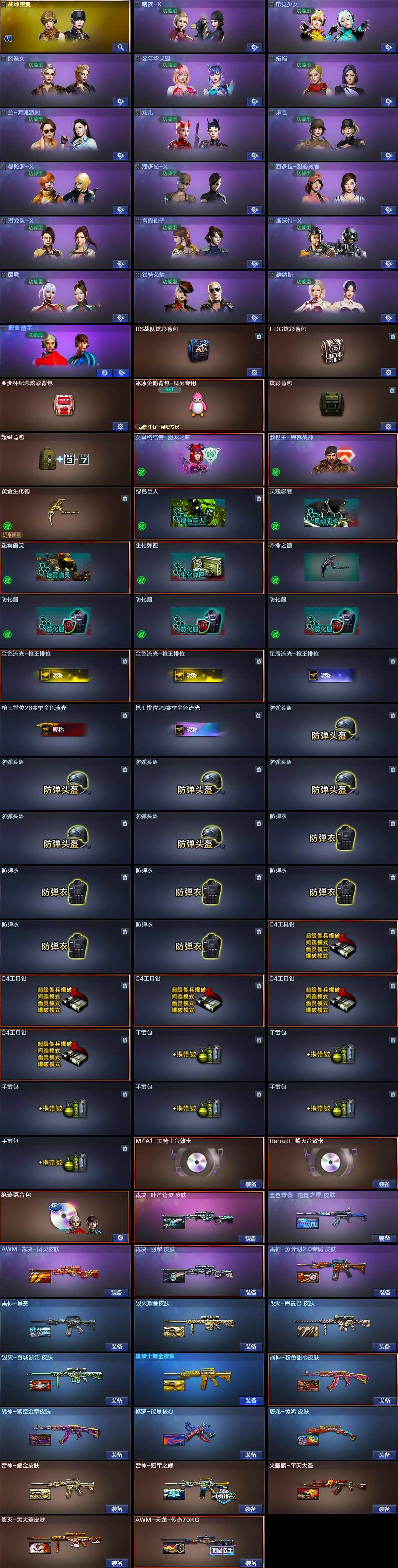 【道具】:BS战队炫彩背包,EDG炫彩背包,亚洲杯纪念炫彩背包,冰冰企鹅背包-猛男专用,炫彩背包,超级背包,女皇终结者-魔龙之吻,救世主-黑桃战神,黄金生化钩,绿色巨人,灵魂忍者,迷雾幽灵,生化弹匣,夺命之镰,防化服*3,金色流光-枪王排位*2,星辰流光-枪王排位,枪王排位28赛季金色流光,枪王排位29赛季金色流光,防弹头盔*6,防弹衣*6,C4工具钳*5,手雷包*
