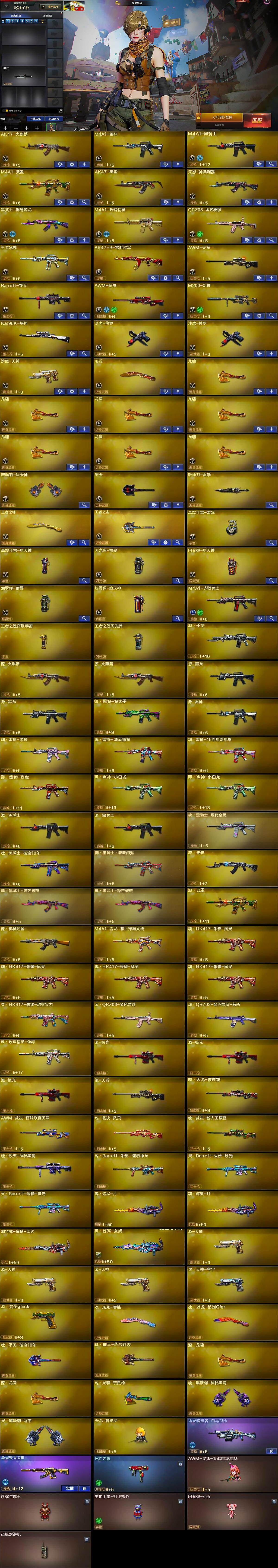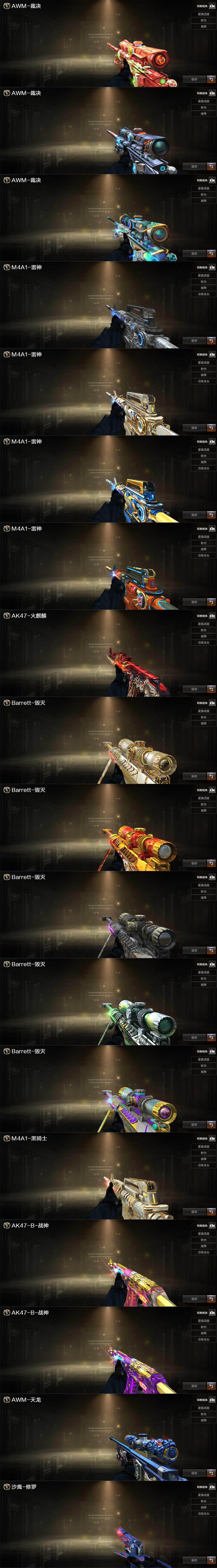 【英雄级武器】:AK47-火麒麟,M4A1-雷神,M4A1-黑骑士,M4A1-武圣,AK47-黑鲨,无影-神兵利器,黑武士-锦绣游龙,M4A1-玫瑰精灵,QBZ03-金色蔷薇,王者冰魄-觉醒版,AK47-B-常胜将军,AWM-天龙,Barrett-毁灭,AWM-裁决,M200-幻神,Kar98K-星神,沙鹰-修罗*2,沙鹰-天神,屠龙,龙啸*7,麒麟刺-堕天神,擎天,斩神刀-雷暴,王者之锋-觉醒版,王者之击-觉醒版,高爆手雷-雷暴,高爆手雷-堕天神,闪光弹-雷暴,闪光弹-堕天神,烟雾弹-雷暴,烟雾弹-堕天神,M4A1-赤狱骑士