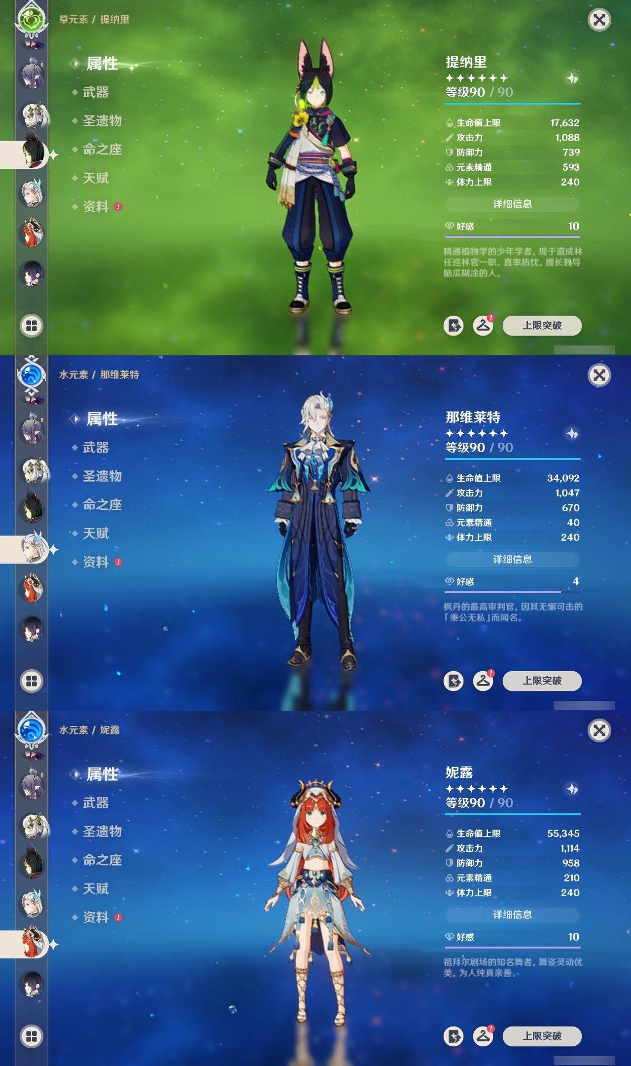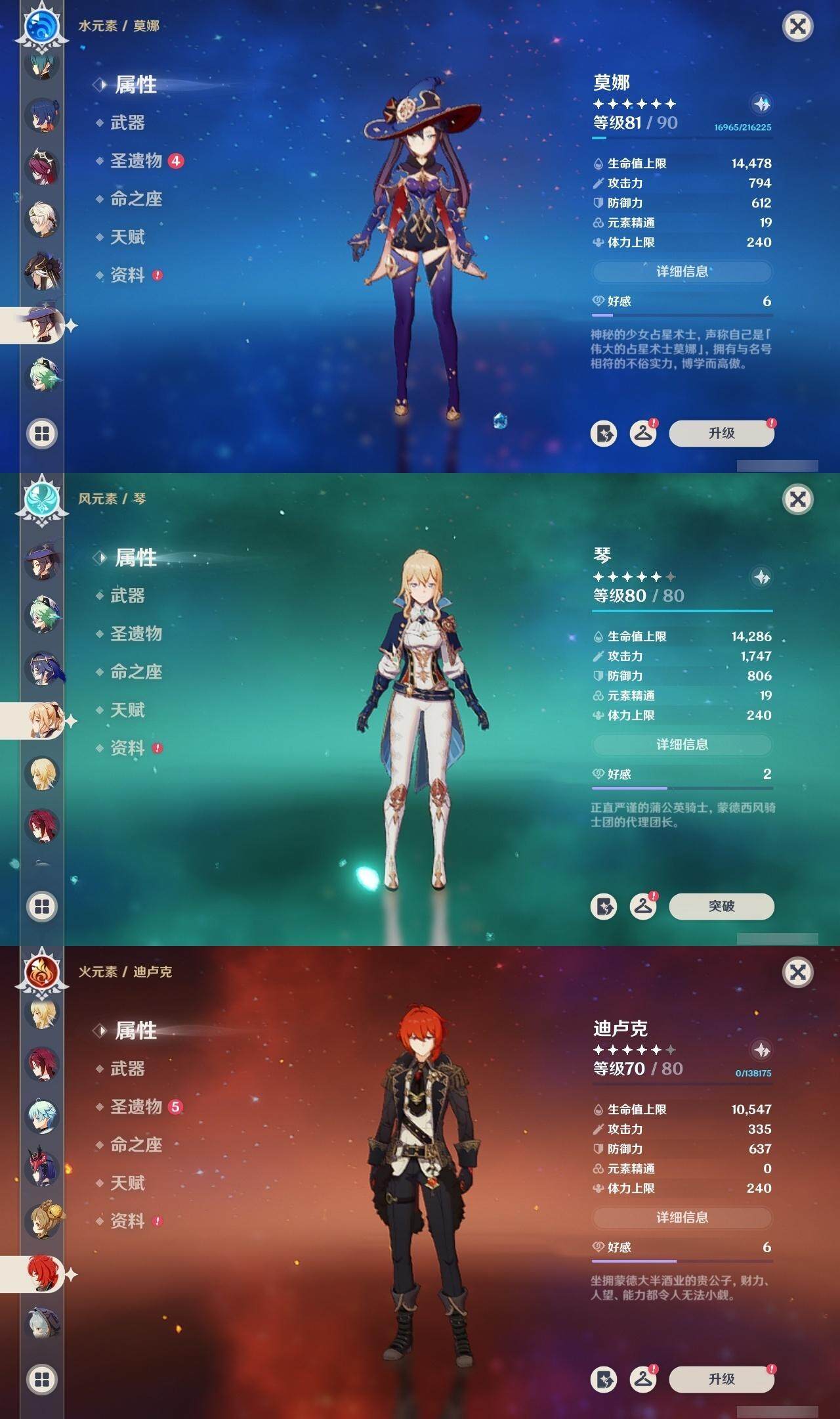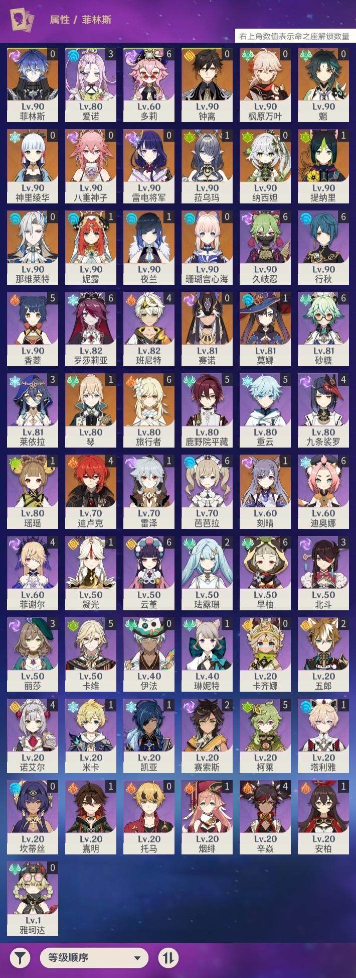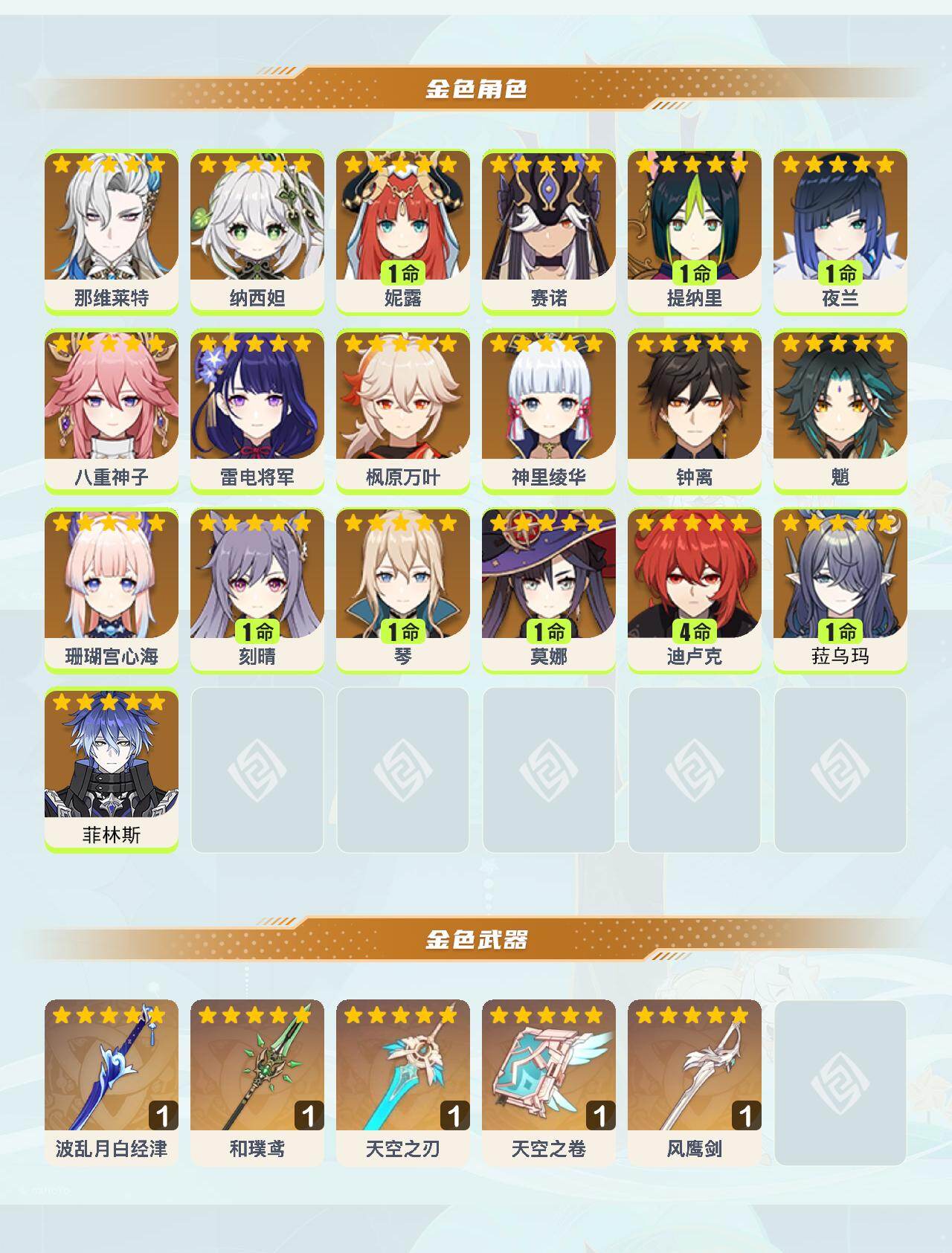 0命那维莱特,0命纳西妲,1命妮露,0命赛诺,1命提纳里,1命夜兰,0命八重神子,0命雷电将军,0命枫原万叶,0命神里绫华,0命钟离,0命魈,0命珊瑚宫心海,1命刻晴,1命琴,1命莫娜,4命迪卢克,1命菈乌玛,0命菲林斯,精1波乱月白经津,精1和璞鸢,精1天空之刃,精1天空之卷,精1风鹰剑