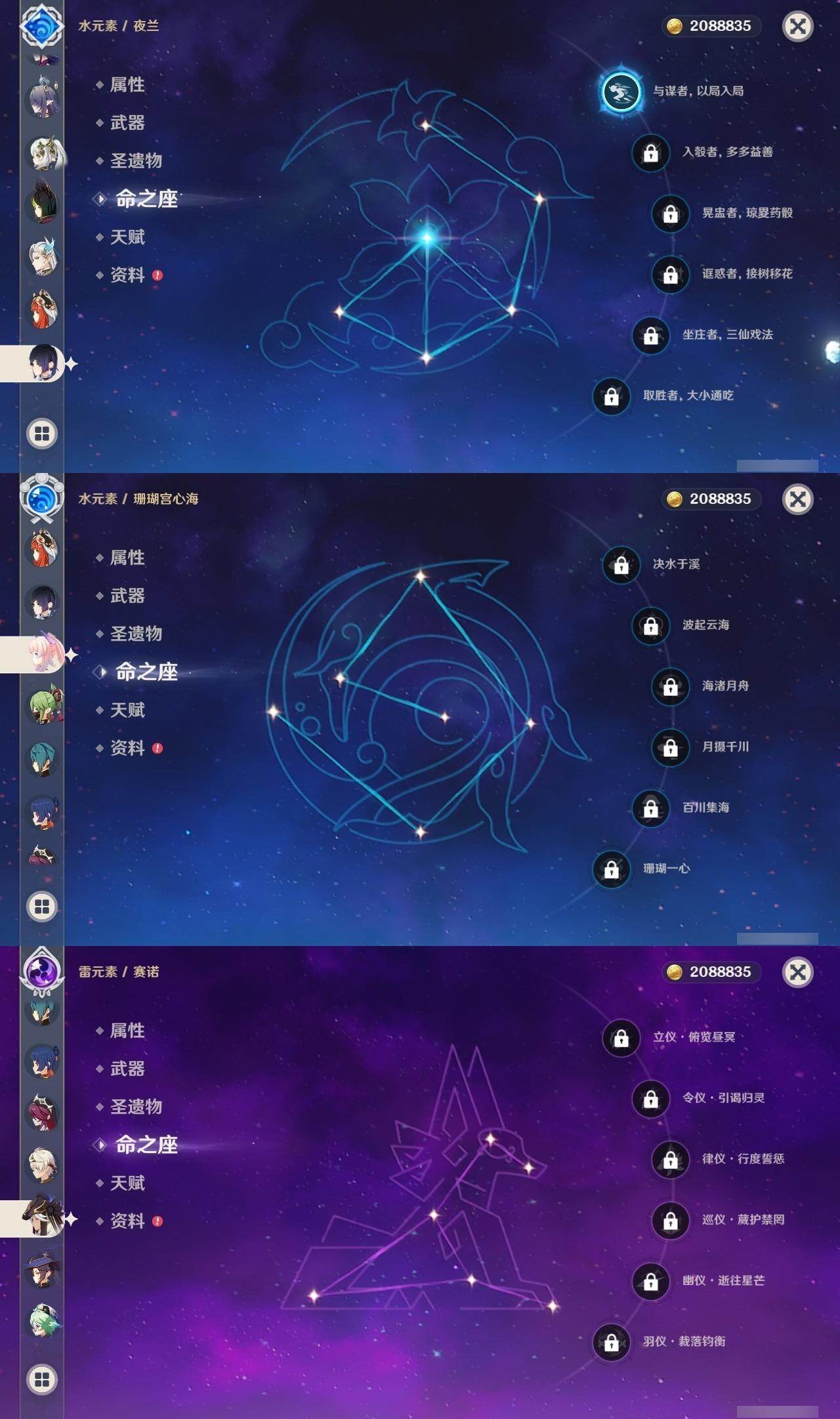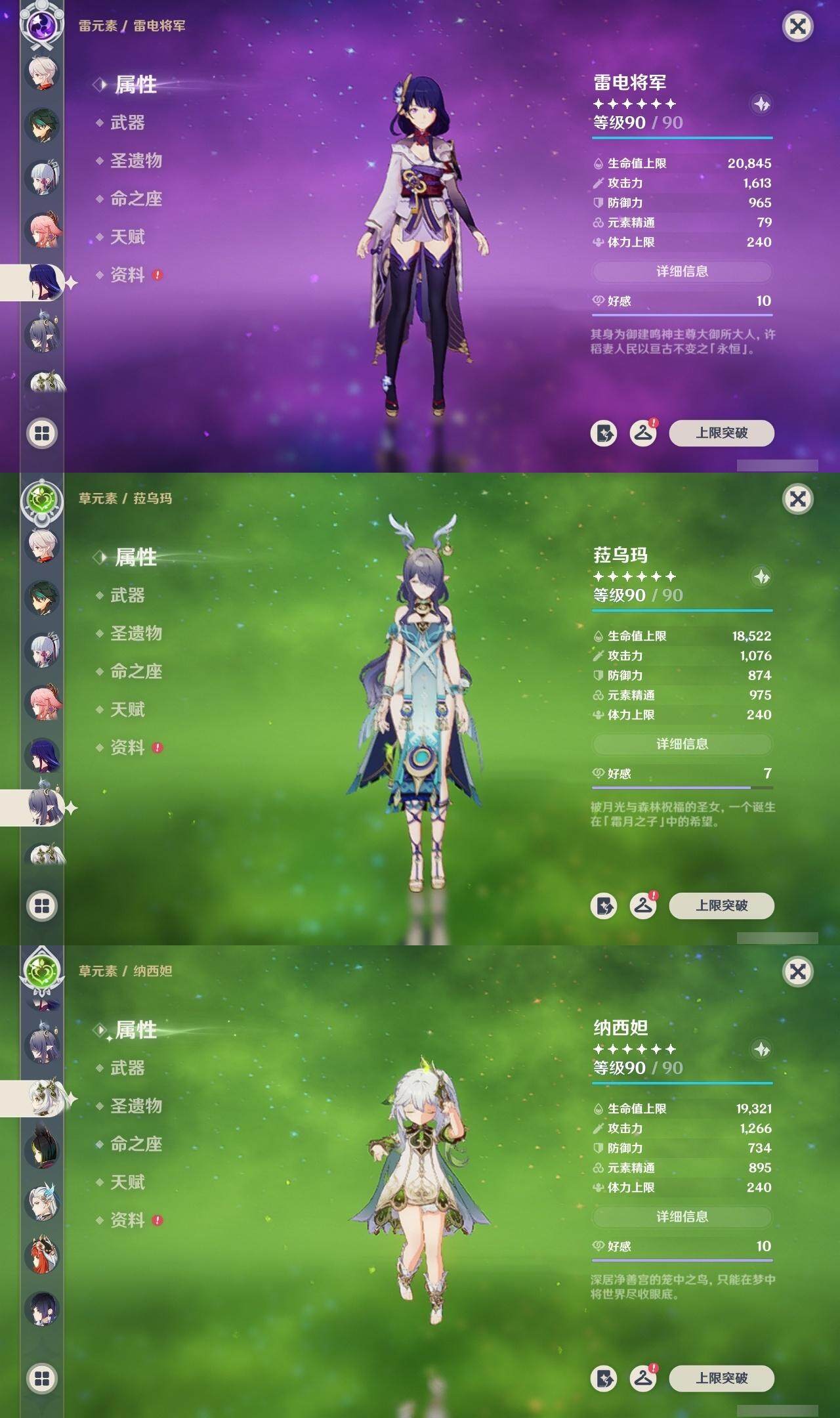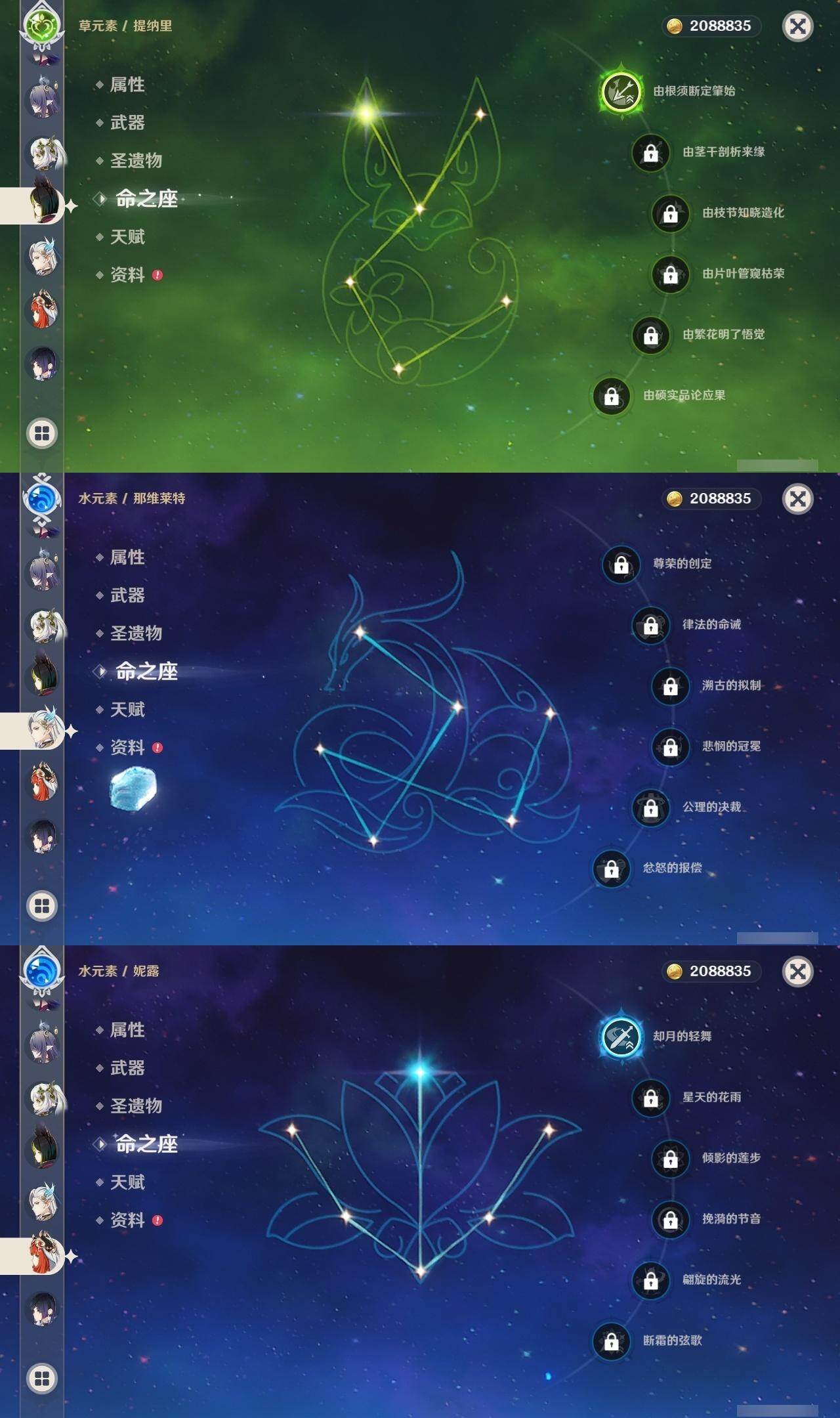 0命那维莱特,0命纳西妲,1命妮露,0命赛诺,1命提纳里,1命夜兰,0命八重神子,0命雷电将军,0命枫原万叶,0命神里绫华,0命钟离,0命魈,0命珊瑚宫心海,1命刻晴,1命琴,1命莫娜,4命迪卢克,1命菈乌玛,0命菲林斯,精1波乱月白经津,精1和璞鸢,精1天空之刃,精1天空之卷,精1风鹰剑