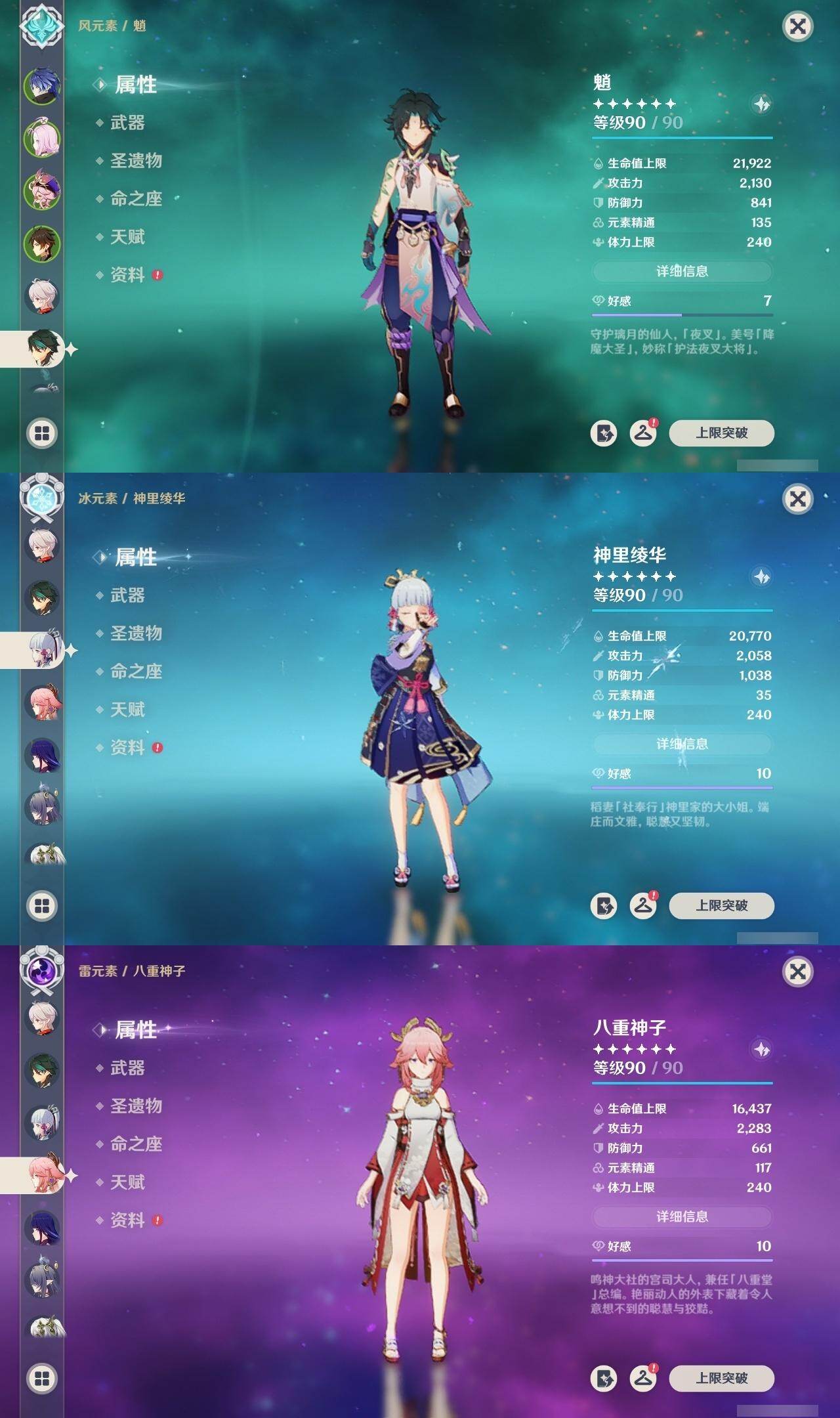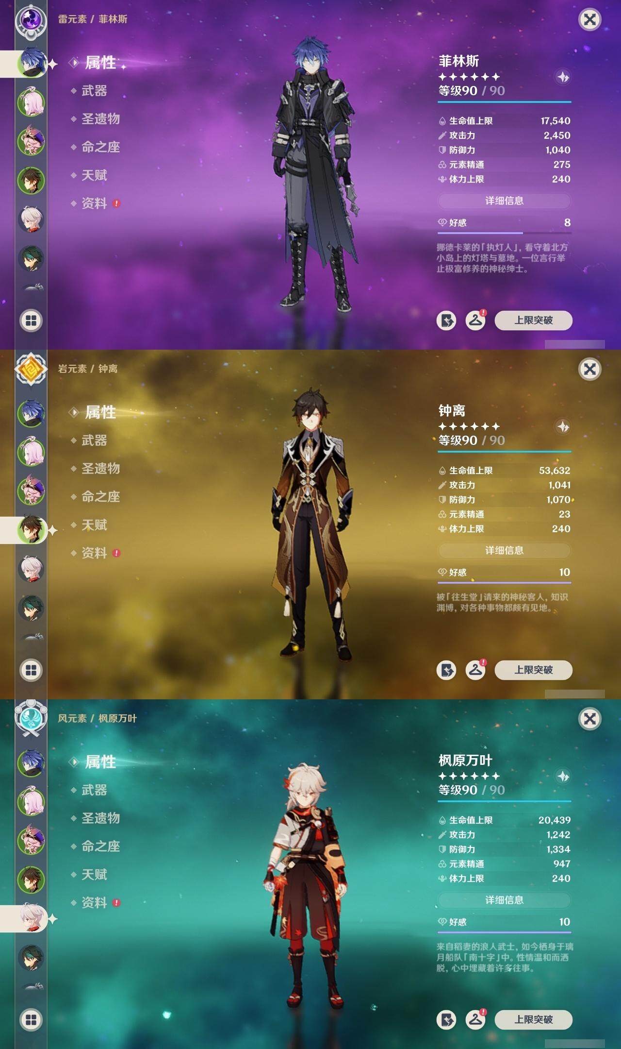 钟离,枫原万叶,魈,神里凌华,八重神子,雷电将军,珊瑚宫心海,莫娜,琴,迪卢克,刻晴
