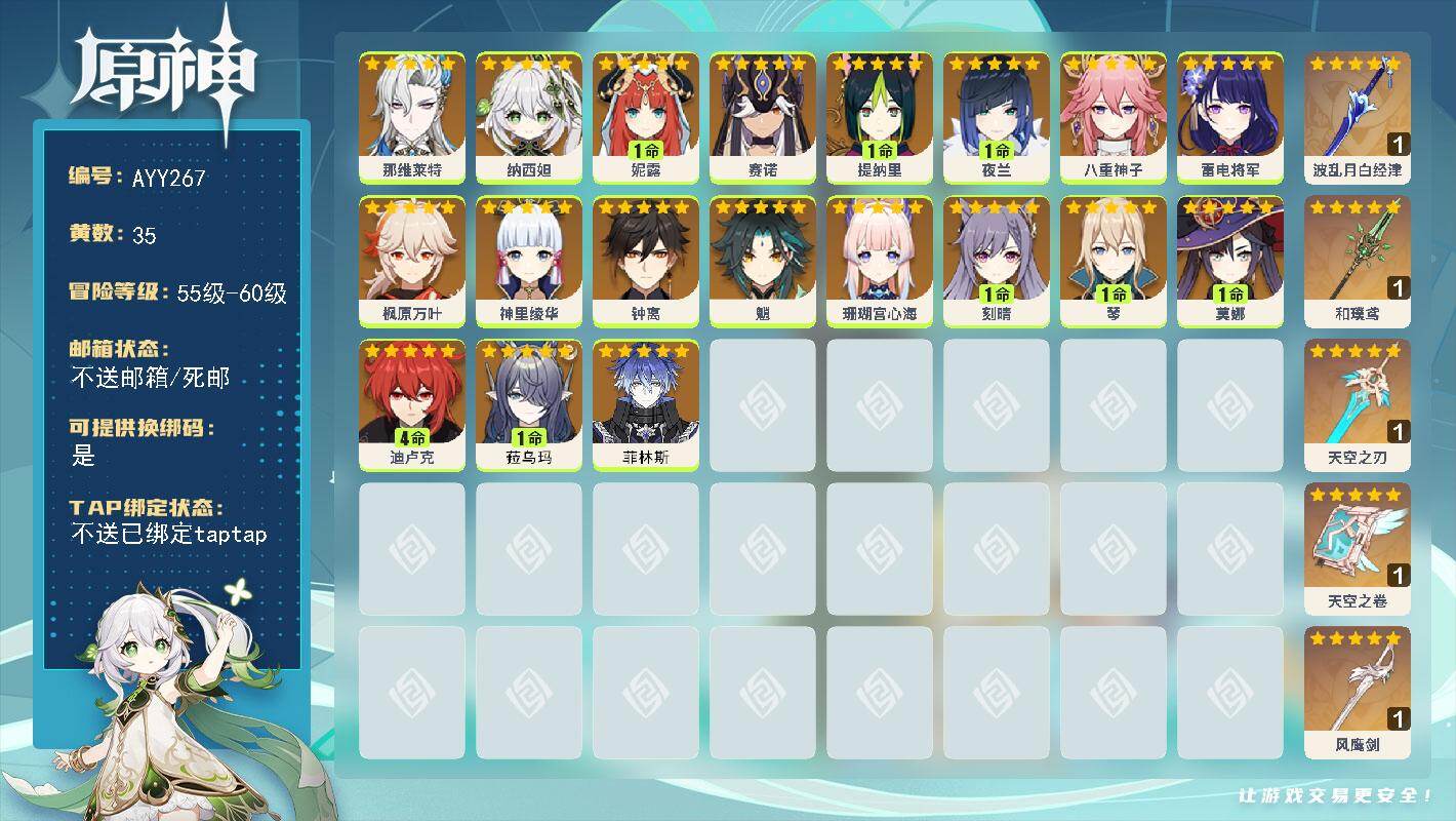 [15319910]60级/35黄/女主/19个五星角色/5个五星武器 0命那维莱特,0命纳西妲,1命妮露,0命赛诺,1命提纳里,1命夜兰,0命八重神子,0命雷电将军,0命枫原万叶,0命神里绫华,0命钟离,0命魈,0命珊瑚宫心海,1命刻晴,1命琴,1命莫娜,4命迪卢克,1命菈乌玛,0命菲林斯,精1波乱月白经津,精1和璞鸢,精1天空之刃,精1天空之卷,精1风鹰剑