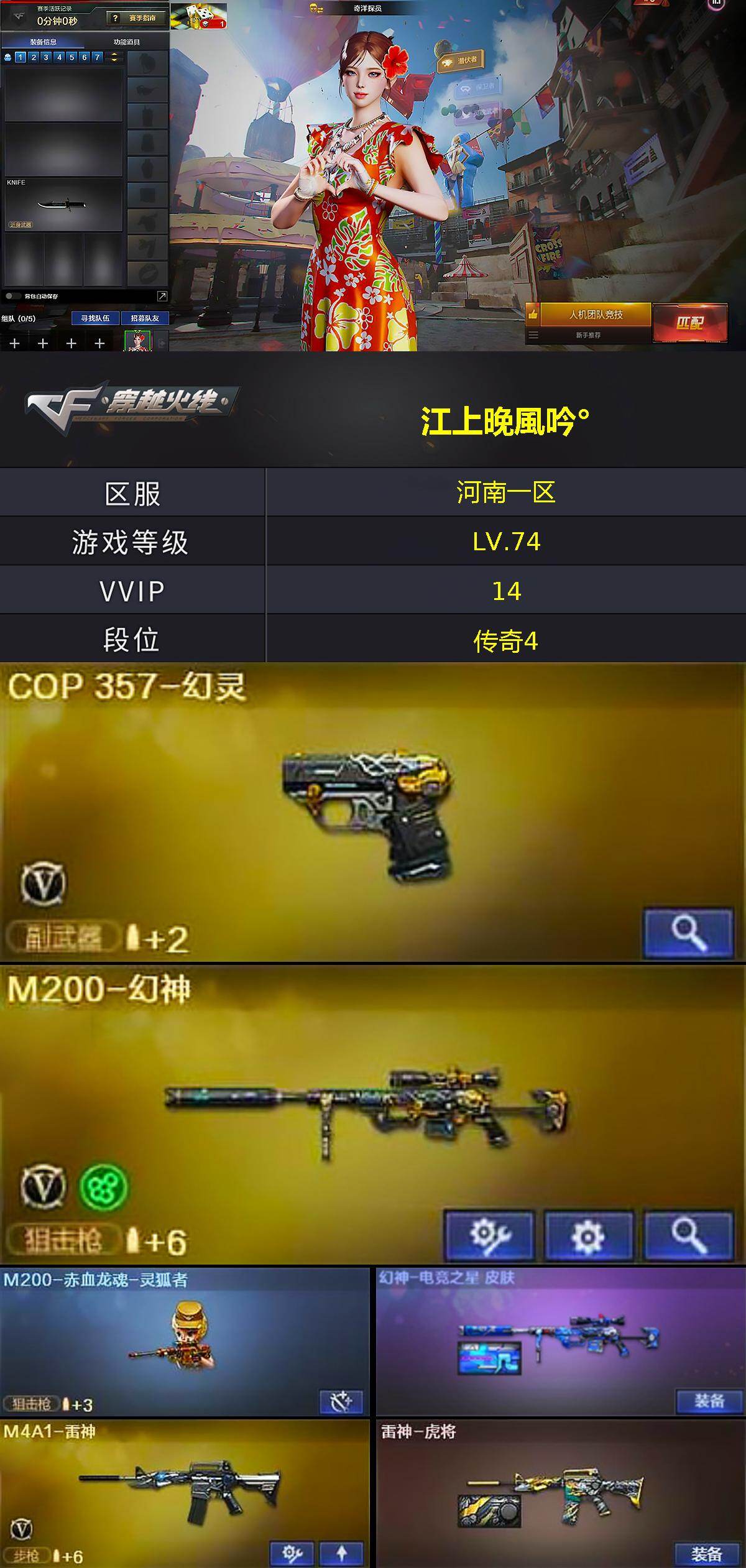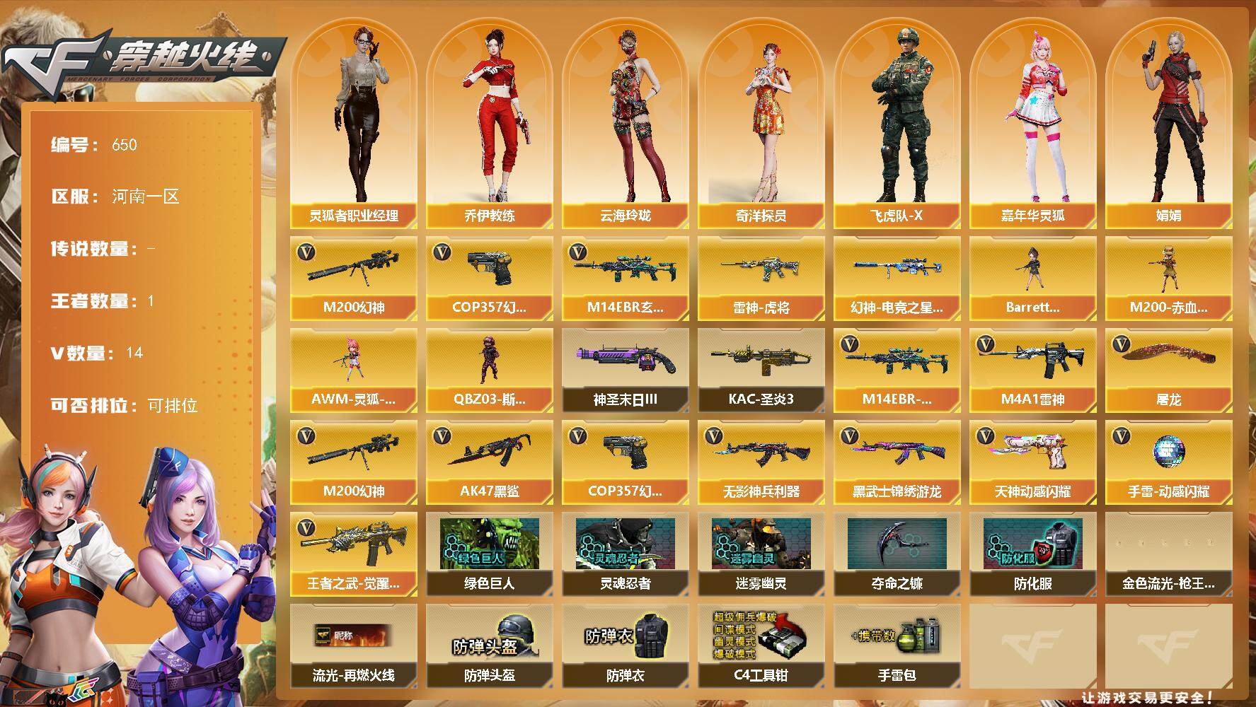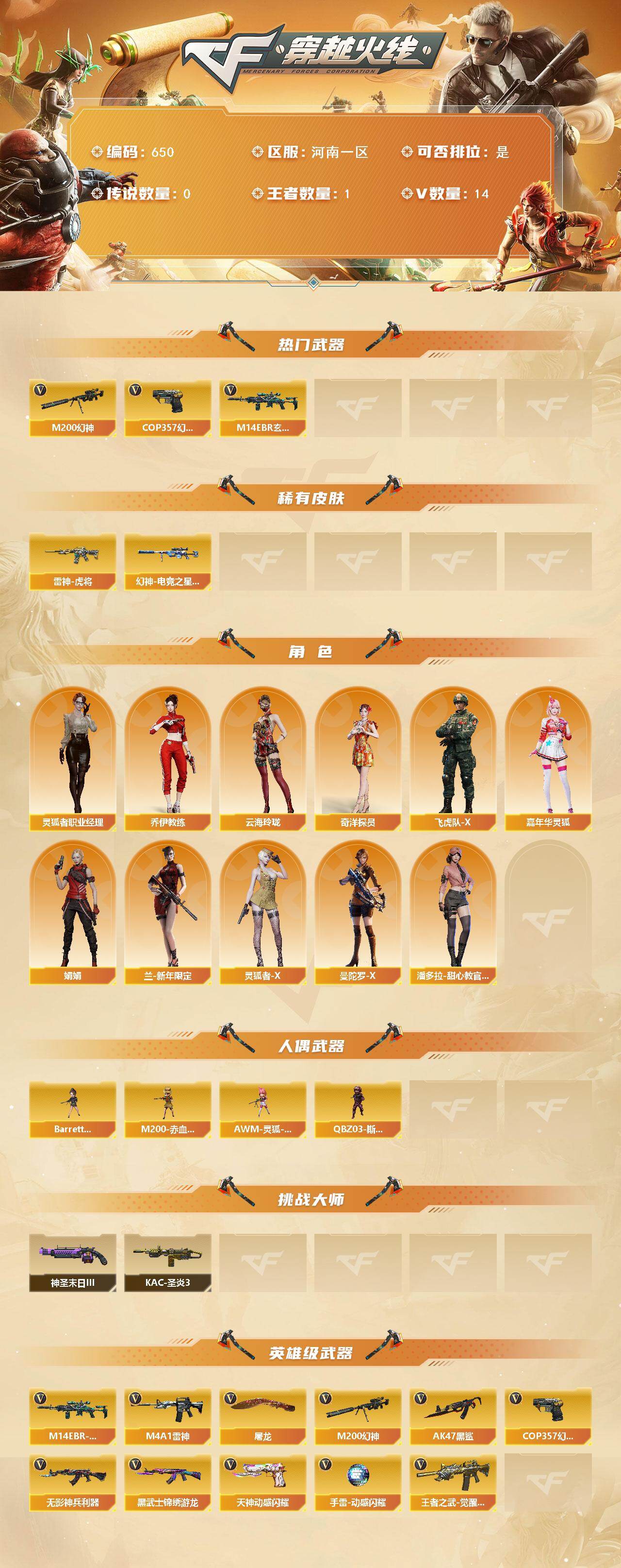 [15320045]河南一区-14V-1王者-0炫金 【热门武器】:M14EBR-玄武,M200-幻神,COP 357-幻灵 【皮肤】:幻神-电竞之星 皮肤,雷神-虎将 【角色】:奇洋探员,乔伊教练,云海玲珑,飞虎队-X,嘉年华灵狐,娟娟,兰-新年限定,灵狐者-X,灵狐者-职业经理,曼陀罗-X,潘多拉-甜心教官 【人偶武器】:M200-赤血龙魂-灵狐者,AWM-灵狐-15周年嘉年华,Barrett-夜玫瑰,QBZ03-斯沃特 【挑战大师】:KAC-圣炎切割者III,神圣爆裂者-末日III 【英雄级武器】:M4A1-雷神,AK47-黑鲨,M14EBR-玄武,无影-神兵利器,黑武士-锦绣游龙,王者之武-觉醒版,M200-幻神,COP 357-幻灵,天神-动感闪耀,屠龙,手雷-动感闪耀 【道具】:绿色巨人,灵魂忍者,迷雾幽灵,夺命之镰,防化服*2,金色流光-枪王排位*2,星辰流光-枪王排位,流光-再燃火线,枪王排位28赛季金色流光,防弹头盔*2,防弹衣*2,C4工具钳*2,手雷包*2 【特殊枪械】: