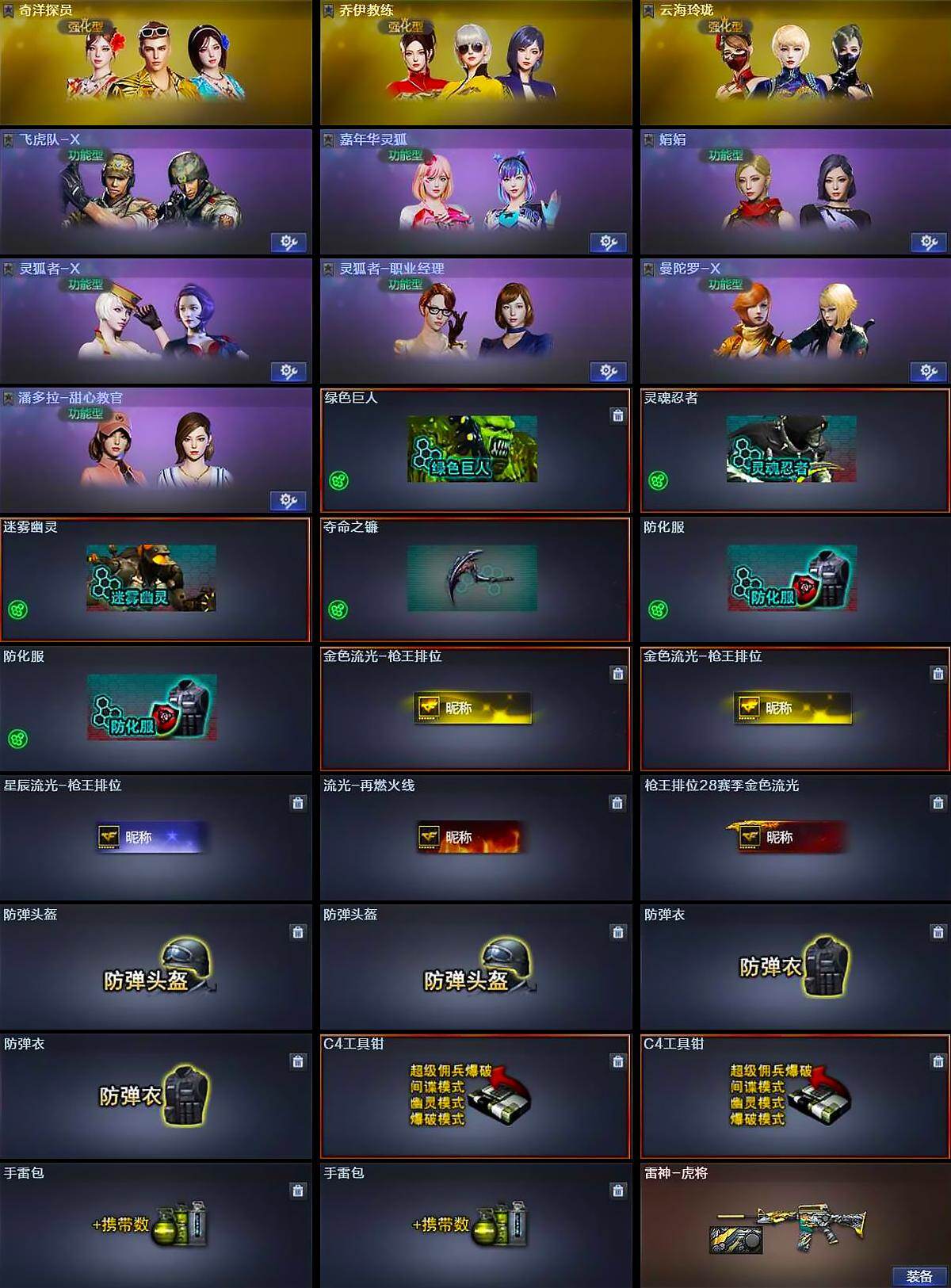 【道具】:绿色巨人,灵魂忍者,迷雾幽灵,夺命之镰,防化服*2,金色流光-枪王排位*2,星辰流光-枪王排位,流光-再燃火线,枪王排位28赛季金色流光,防弹头盔*2,防弹衣*2,C4工具钳*2,手雷包*2