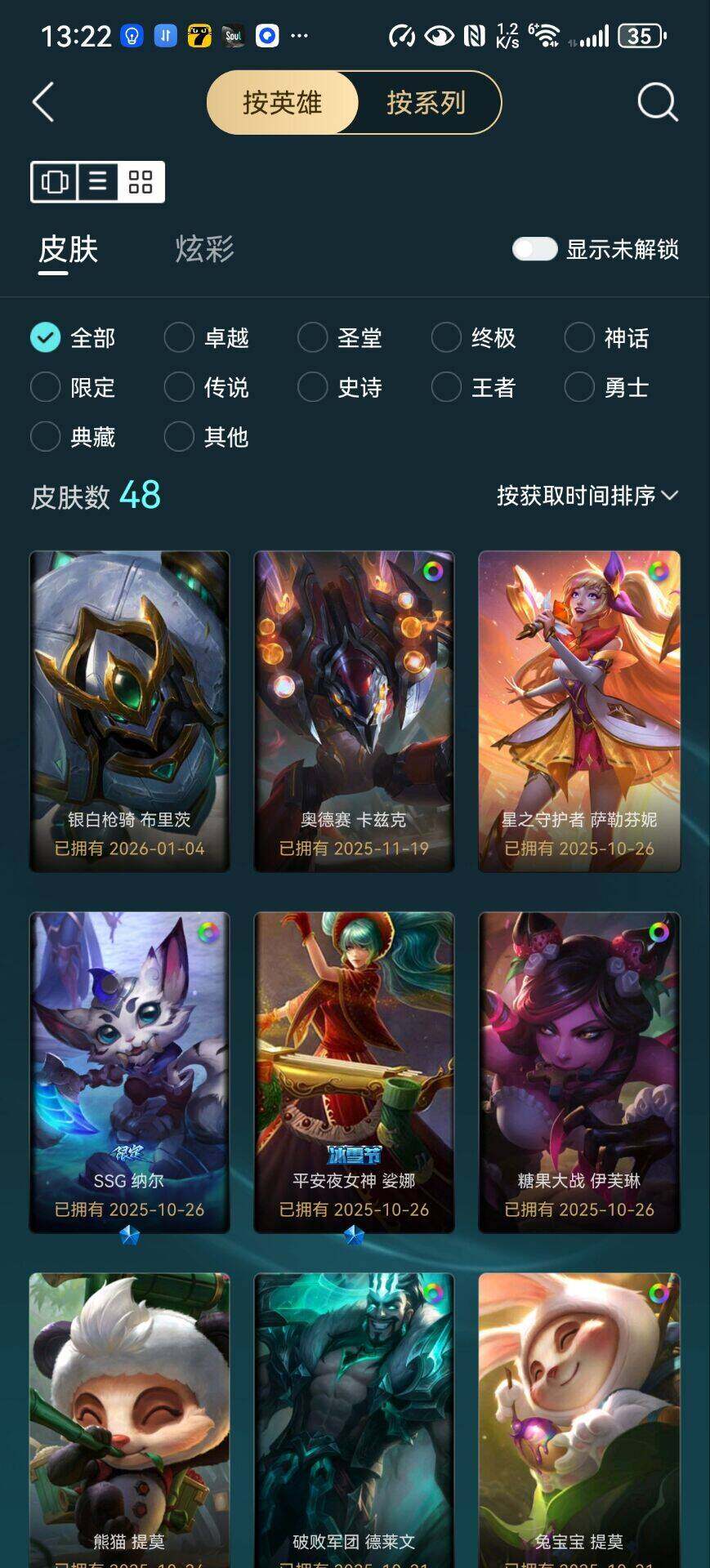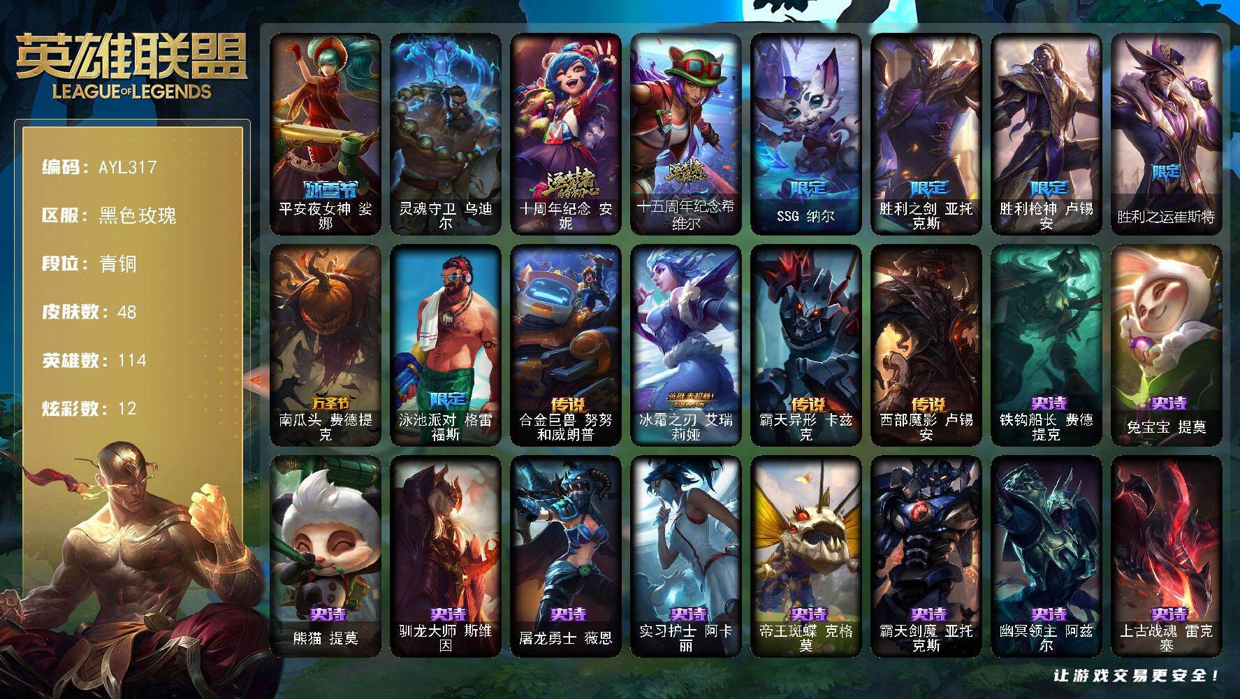 [15323163]可二次【特价出售/店主推荐】青铜段位-114英雄-48皮肤-12炫彩-1终极-2神话-7限定-4传说-11史诗 【臻彩皮肤】:冠军之箭艾希凯旋圣装 【冰雪限定】:平安夜女神娑娜 【终极皮肤】:灵魂守卫乌迪尔 【神话皮肤】:十周年纪念安妮,十五周年纪念希维尔 【限定皮肤】:SSG纳尔,胜利之剑亚托克斯,胜利枪神卢锡安,胜利之运崔斯特,南瓜头费德提克,泳池派对格雷福斯 【传说皮肤】:合金巨兽努努和威朗普,冰霜之刃艾瑞莉娅,霸天异形卡兹克,西部魔影卢锡安 【史诗皮肤】:铁钩船长费德提克,兔宝宝提莫,熊猫提莫,驯龙大师斯维因,屠龙勇士薇恩,实习护士阿卡丽,帝王斑蝶克格莫,霸天剑魔亚托克斯,幽冥领主阿兹尔,上古战魂雷克塞,冰雪游神巴德 【其他皮肤1】:星战易,武仙座海格力斯赛恩,花仙子索拉卡,丛林侠盗艾希,糖果大战伊芙琳,黑金诱惑图奇,横行霸道图奇,绝影神偷图奇,泳池派对蒙多,银白枪骑布里茨,魔女伊莉丝,品酒大师古拉加斯,德玛西亚警官盖伦,禁卫机甲格雷福斯,德莱德莱德莱文,破败军团德莱文,奥德赛卡兹克,战斗学院杰斯,神龙尊者玉境灵龙卡莎,星之守护者萨勒芬妮,源计划升华烬,德玛西亚警官卢锡安,花仙骑士卡莉丝塔
