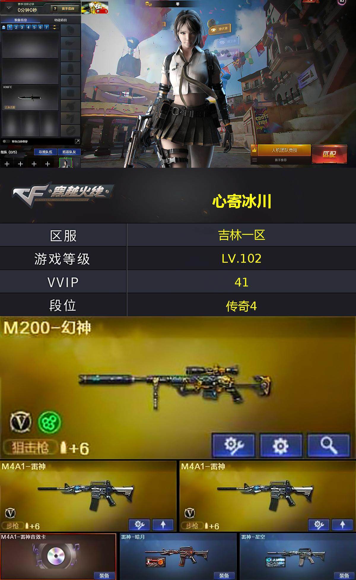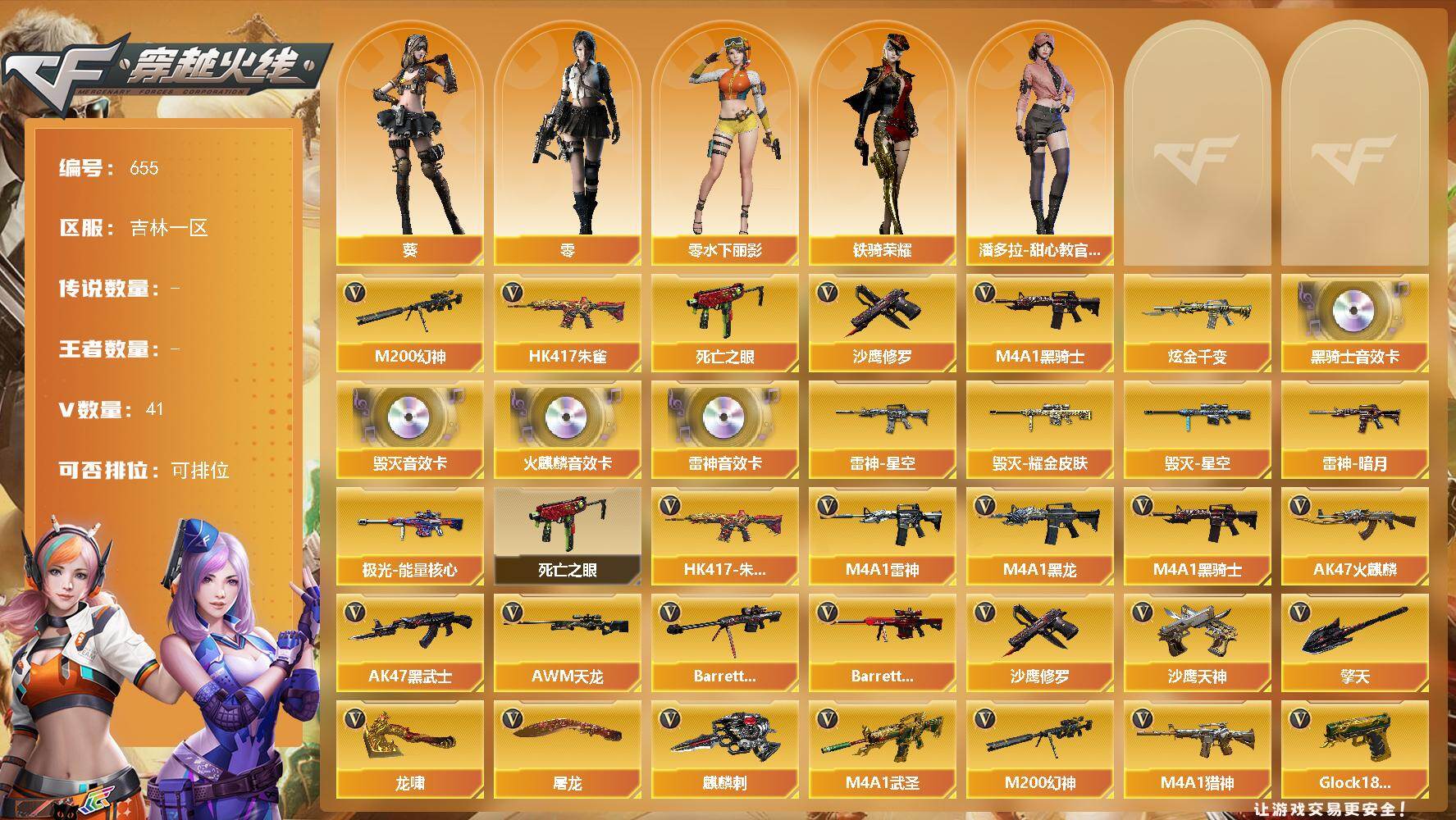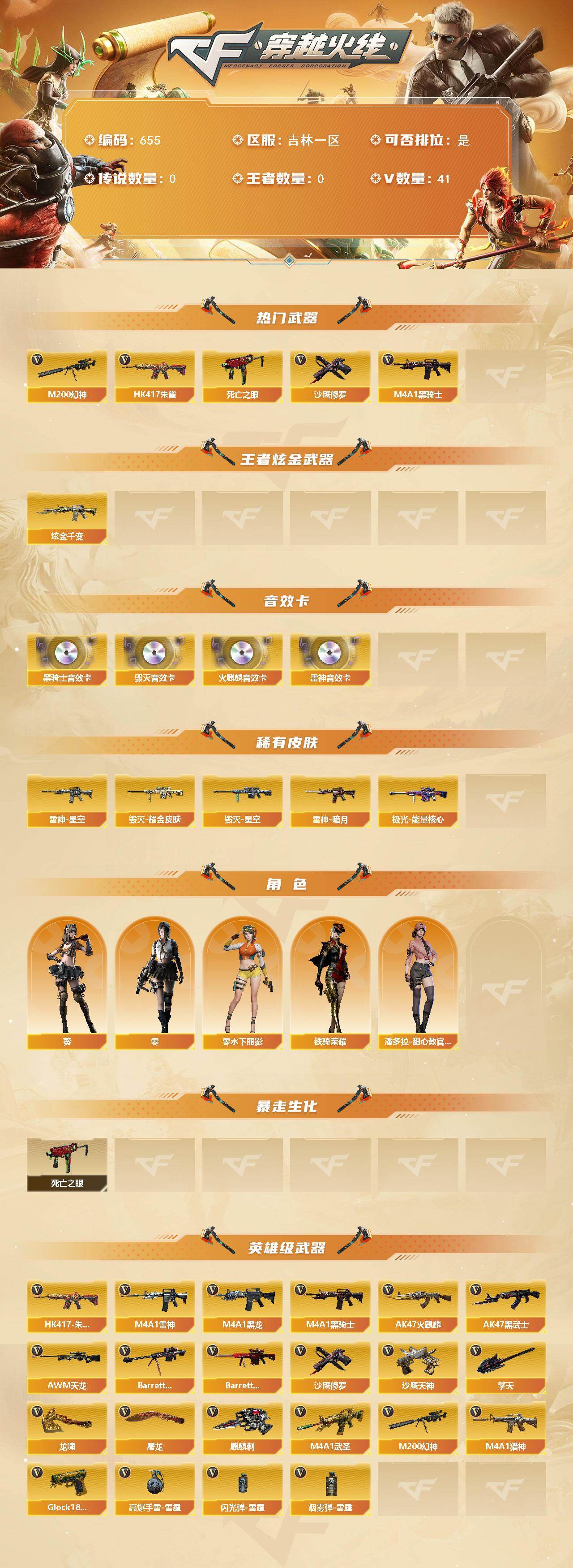 [15323275]吉林一区-41V-0王者-1炫金 【热门武器】:HK417-朱雀,M200-幻神,死亡之眼,M4A1-黑骑士,沙鹰-修罗*3 【王者炫金武器】:炫金千变 【音效卡】:AK47-火麒麟音效卡,M4A1-雷神音效卡,M4A1-黑骑士音效卡,Barrett-毁灭音效卡 【皮肤】:雷神-暗月,雷神-星空,毁灭耀金皮肤,毁灭-星空,极光-能量核心 【角色】:零,葵,零-水下丽影,潘多拉-甜心教官,铁骑荣耀 【暴走生化】:死亡之眼 【英雄级武器】:AK47-火麒麟*2,M4A1-黑龙*2,M4A1-雷神*2,M4A1-黑骑士,AK47-黑武士,M4A1-武圣,HK417-朱雀,M4A1-猎神,AWM-天龙,Barrett-毁灭*4,Barrett-极光,M200-幻神,沙鹰-修罗*3,沙鹰-天神*4,Glock18-武圣,屠龙*5,龙啸*2,擎天,麒麟刺,高爆手雷-雷霆,闪光弹-雷霆,烟雾弹-雷霆 【道具】:战舰背包,炫彩背包,绿色巨人,灵魂忍者,迷雾幽灵,夺命之镰,防化服*2,防弹头盔*2,防弹衣*2,C4工具钳*2,手雷包*2 【特殊枪械】:1黑骑士