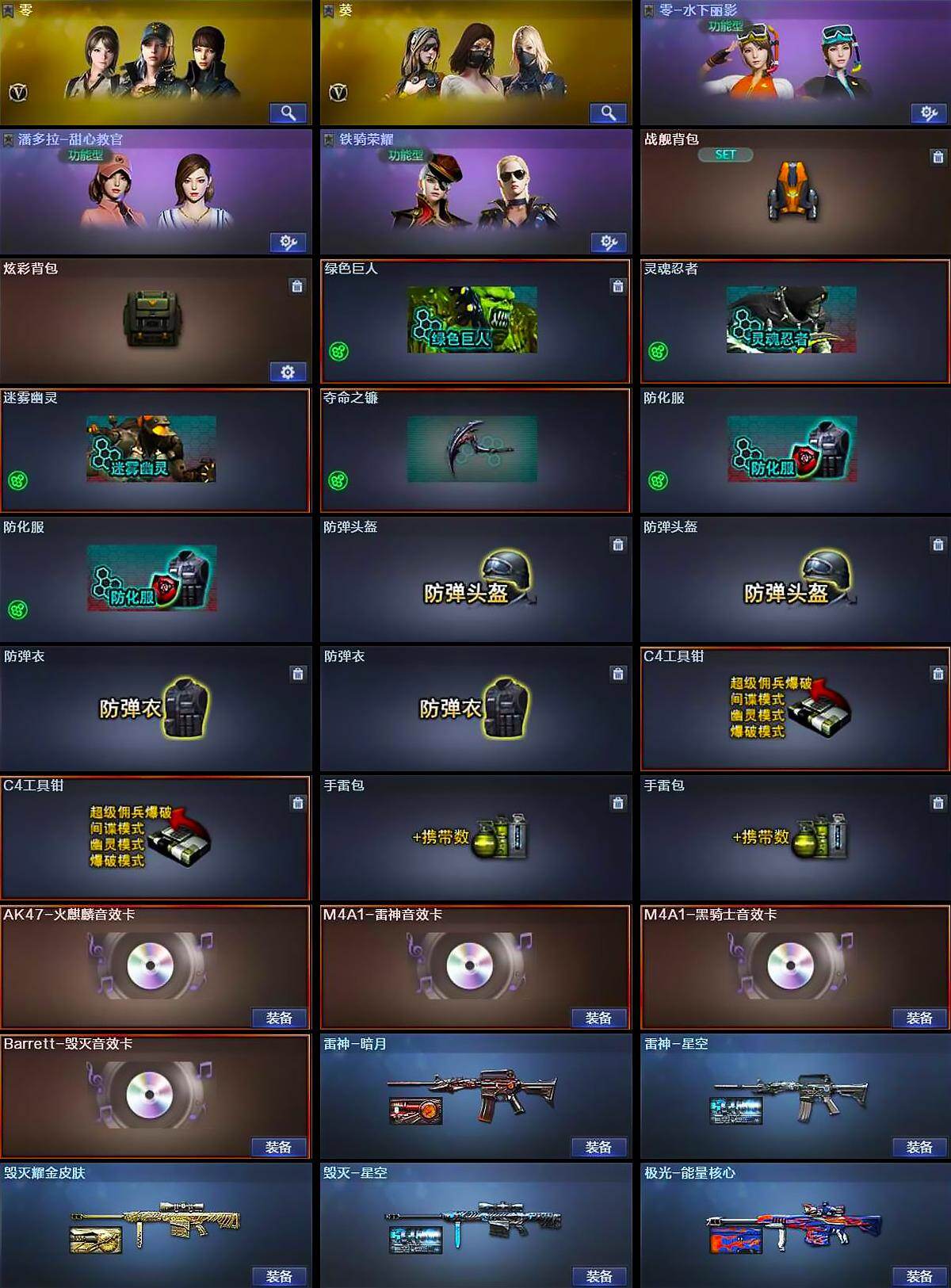 【道具】:战舰背包,炫彩背包,绿色巨人,灵魂忍者,迷雾幽灵,夺命之镰,防化服*2,防弹头盔*2,防弹衣*2,C4工具钳*2,手雷包*2