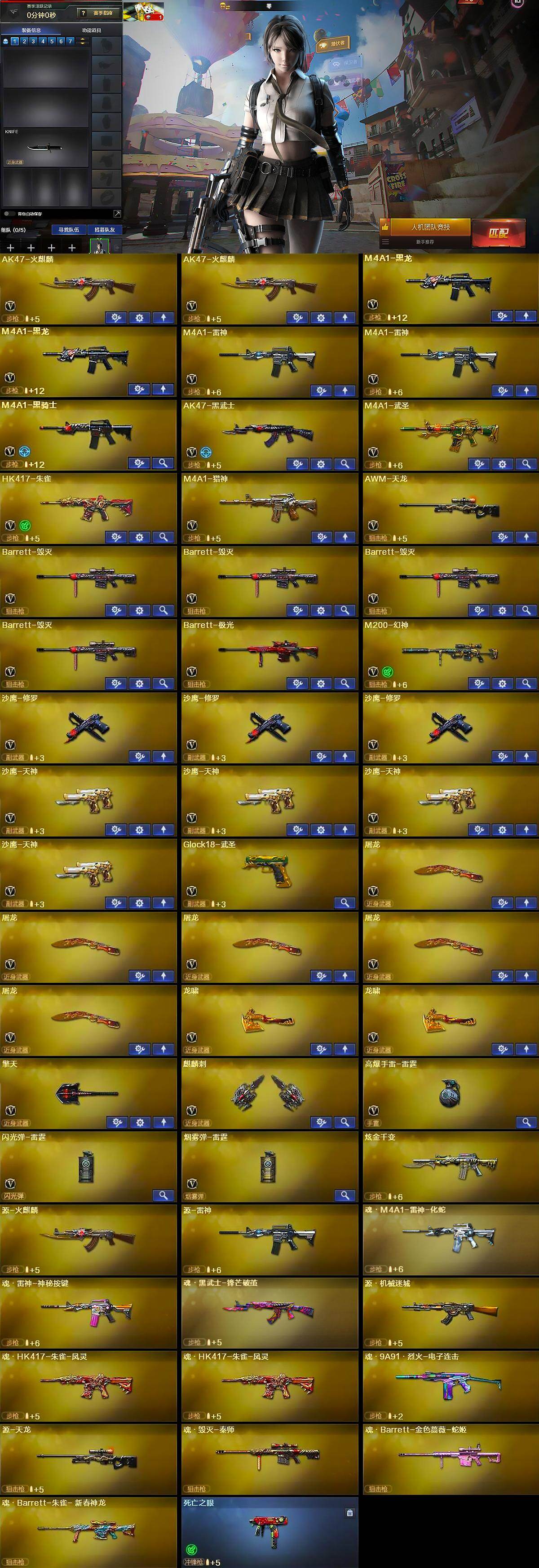 【英雄级武器】:AK47-火麒麟*2,M4A1-黑龙*2,M4A1-雷神*2,M4A1-黑骑士,AK47-黑武士,M4A1-武圣,HK417-朱雀,M4A1-猎神,AWM-天龙,Barrett-毁灭*4,Barrett-极光,M200-幻神,沙鹰-修罗*3,沙鹰-天神*4,Glock18-武圣,屠龙*5,龙啸*2,擎天,麒麟刺,高爆手雷-雷霆,闪光弹-雷霆,烟雾弹-雷霆