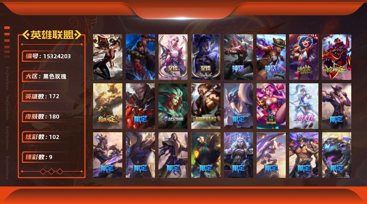 白银段位-172英雄-180皮肤-102炫彩-1终极-5神话-33限定-11传说-29史诗