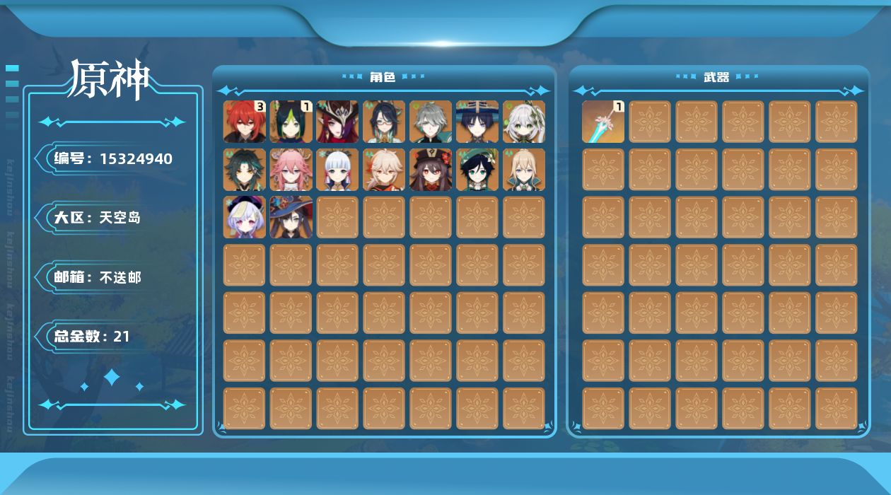 [15324940]56级/21黄/女主/16个五星角色/1个五星武器 0命闲云,0命艾尔海森,0命流浪者,0命纳西妲,1命提纳里,0命八重神子,0命枫原万叶,0命神里绫华,0命胡桃,0命魈,0命温迪,0命七七,0命琴,0命莫娜,3命迪卢克,0命恰斯卡,精1天空之傲