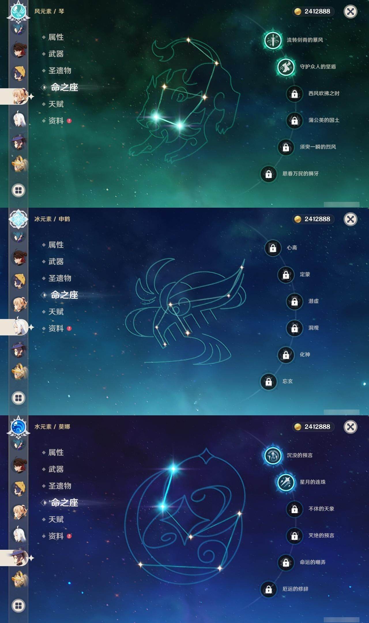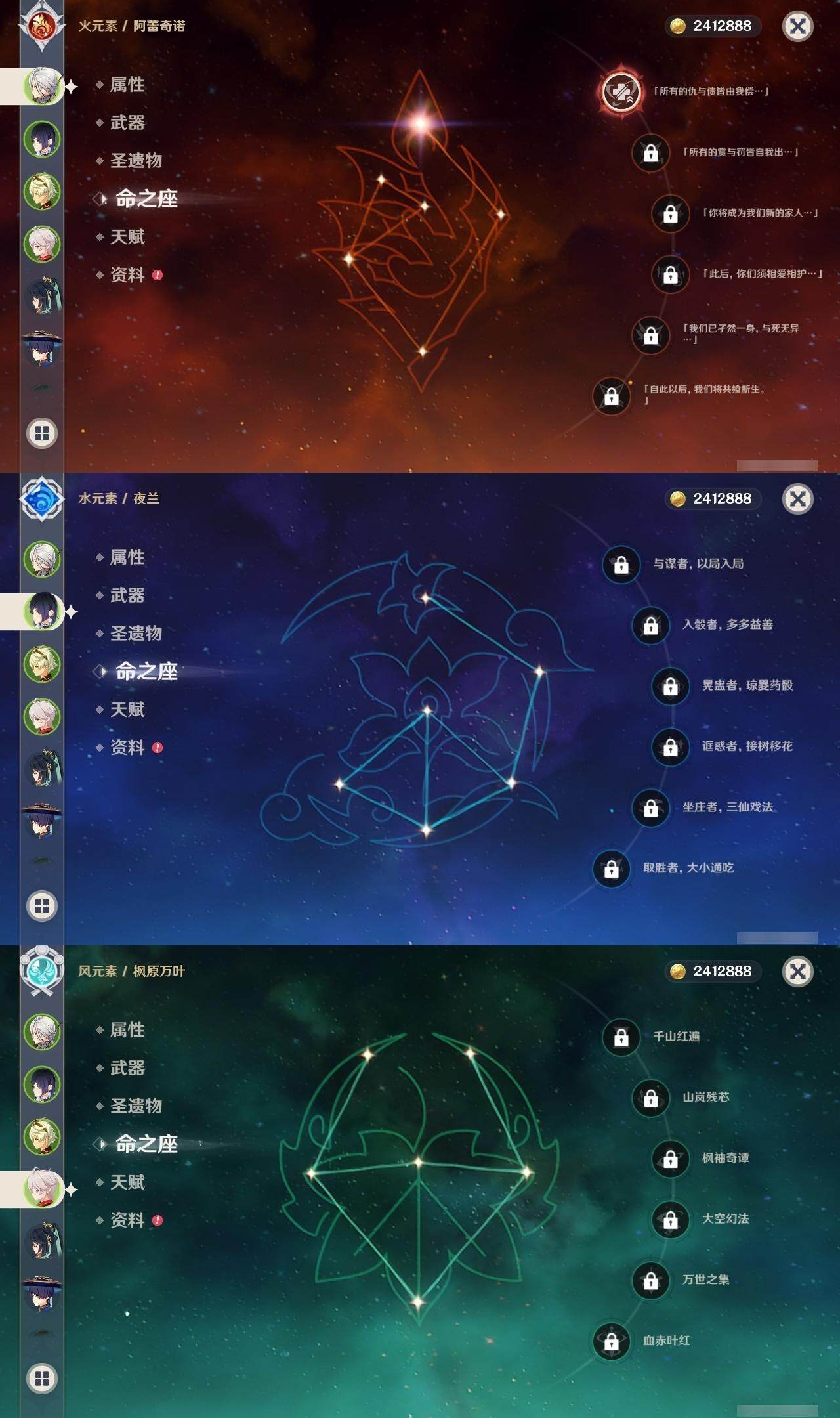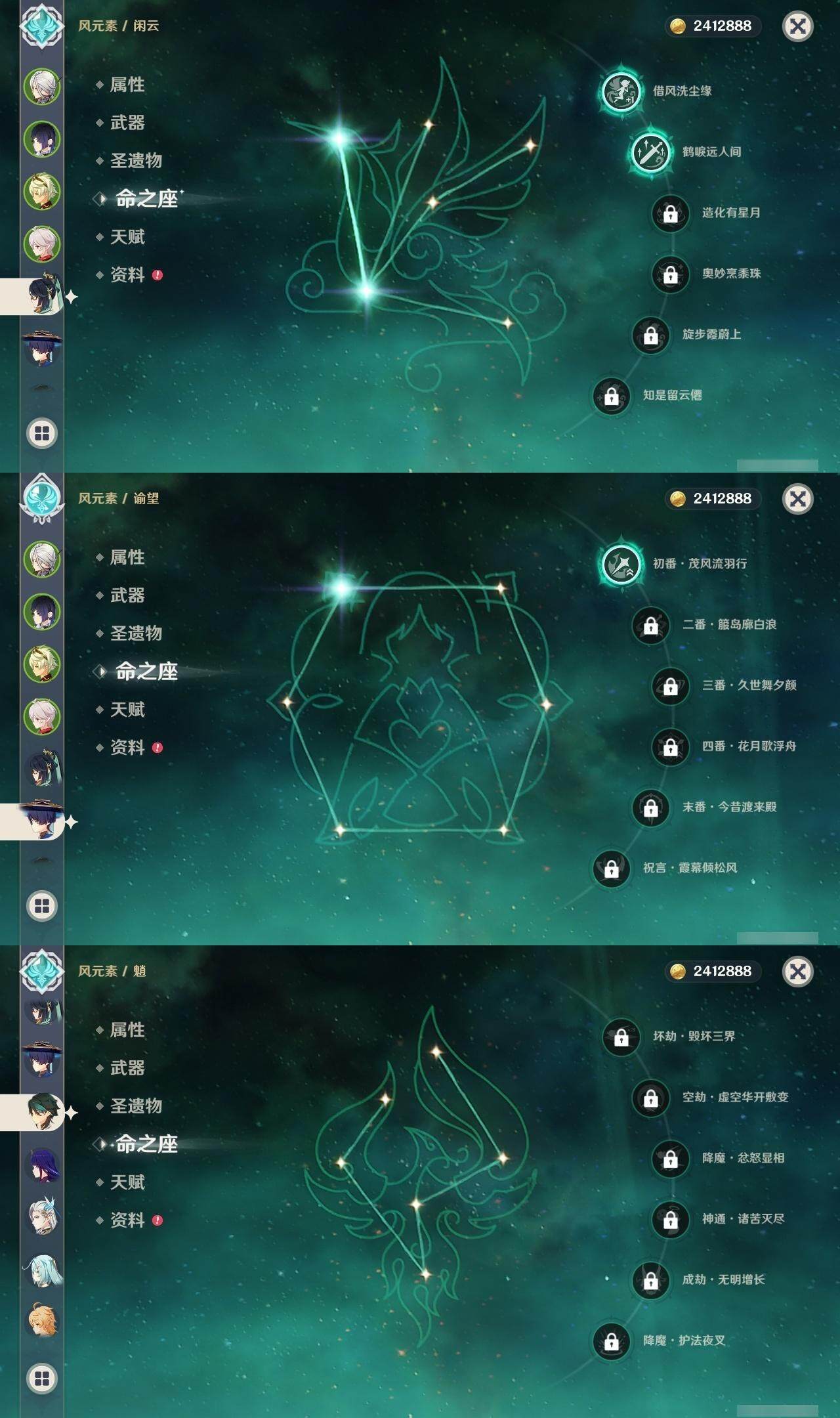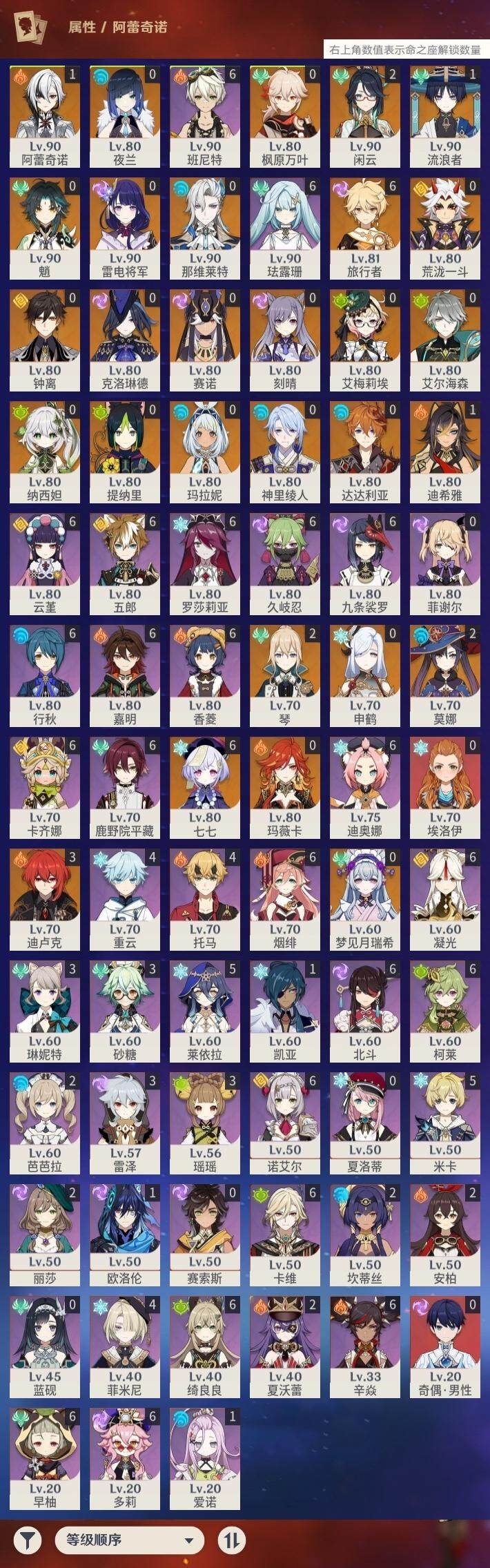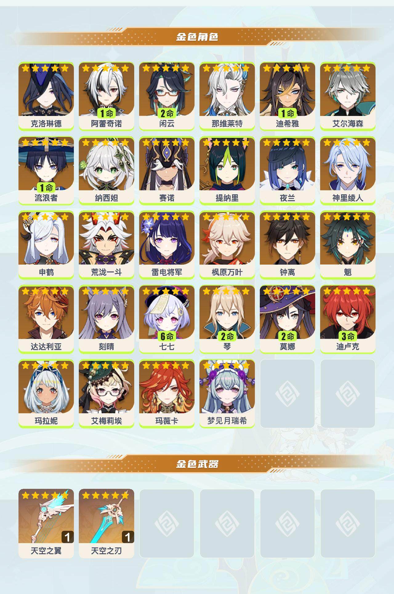 0命克洛琳德,1命阿蕾奇诺,2命闲云,0命那维莱特,1命迪希雅,0命艾尔海森,1命流浪者,0命纳西妲,0命赛诺,0命提纳里,0命夜兰,0命神里绫人,0命申鹤,0命荒泷一斗,0命雷电将军,0命枫原万叶,0命钟离,0命魈,0命达达利亚,0命刻晴,满命七七,2命琴,2命莫娜,3命迪卢克,0命玛拉妮,0命艾梅莉埃,0命玛薇卡,0命梦见月瑞希,精1天空之翼,精1天空之刃