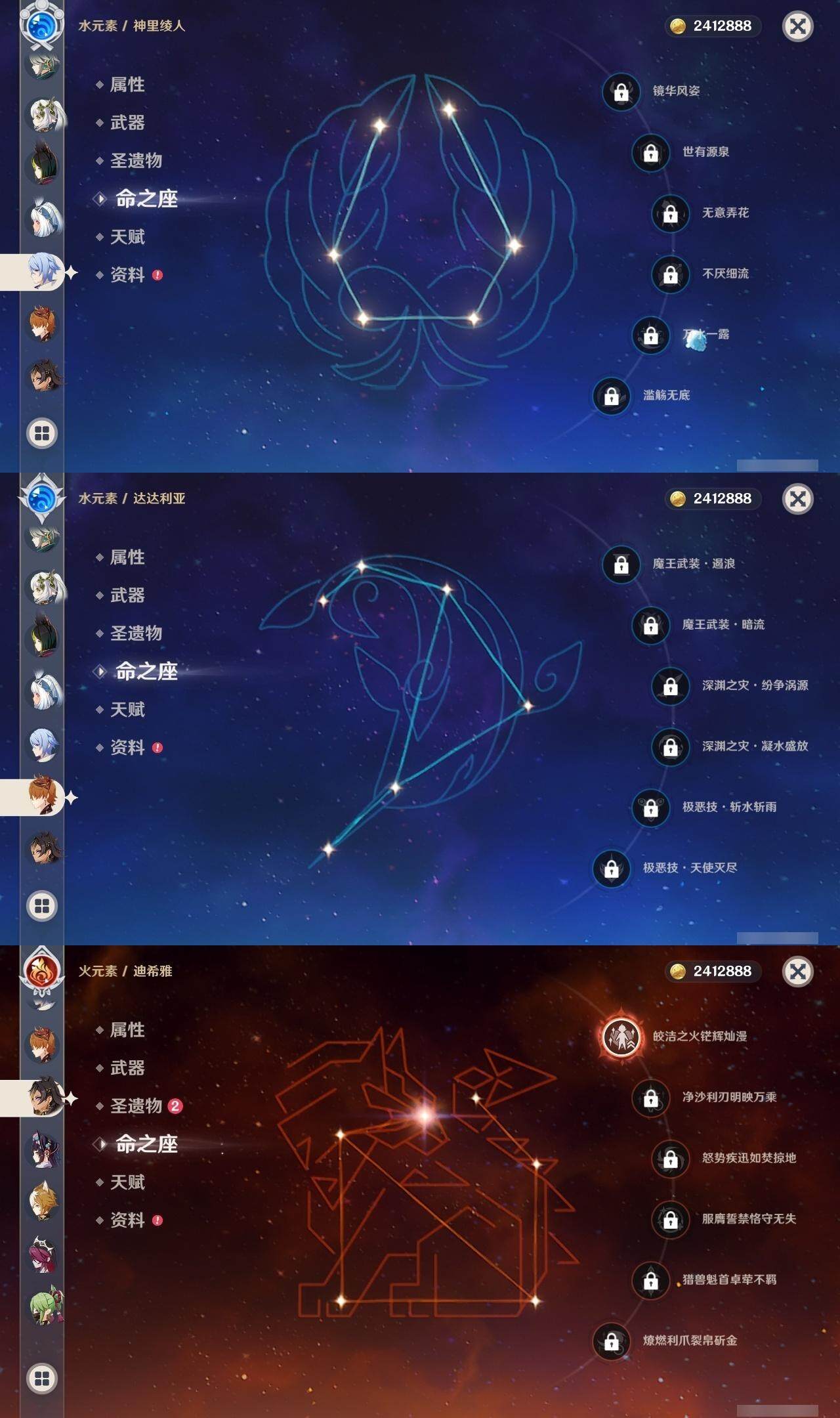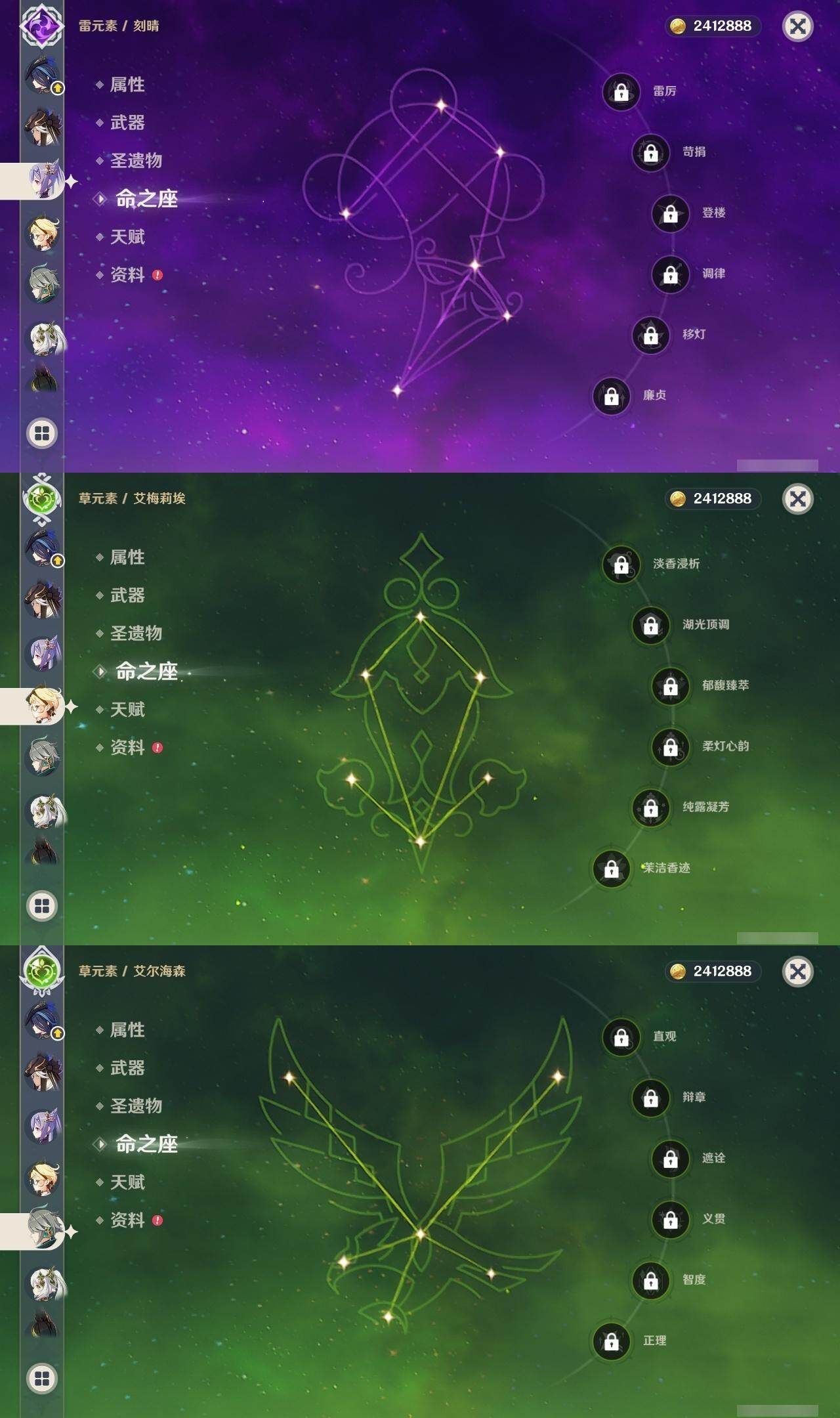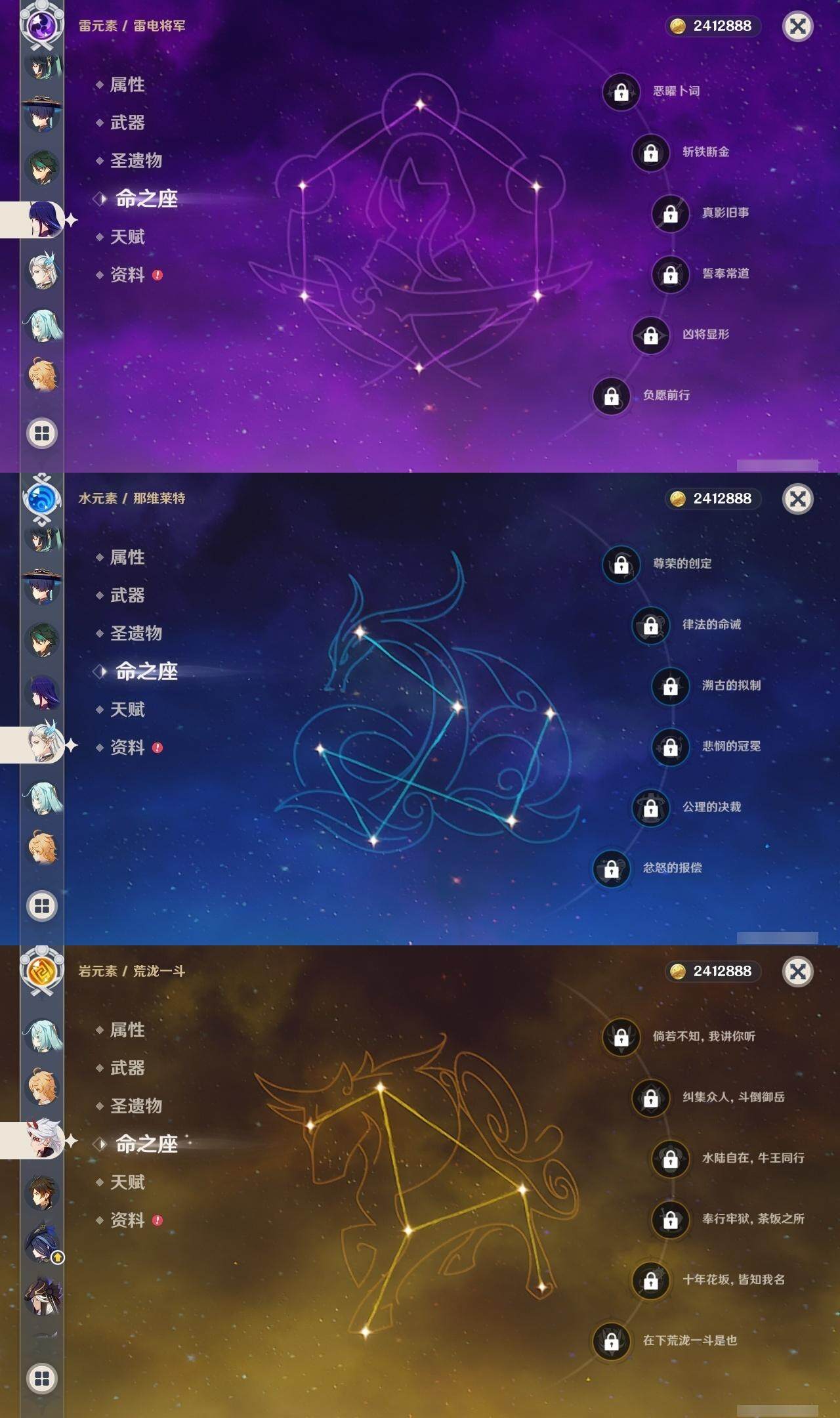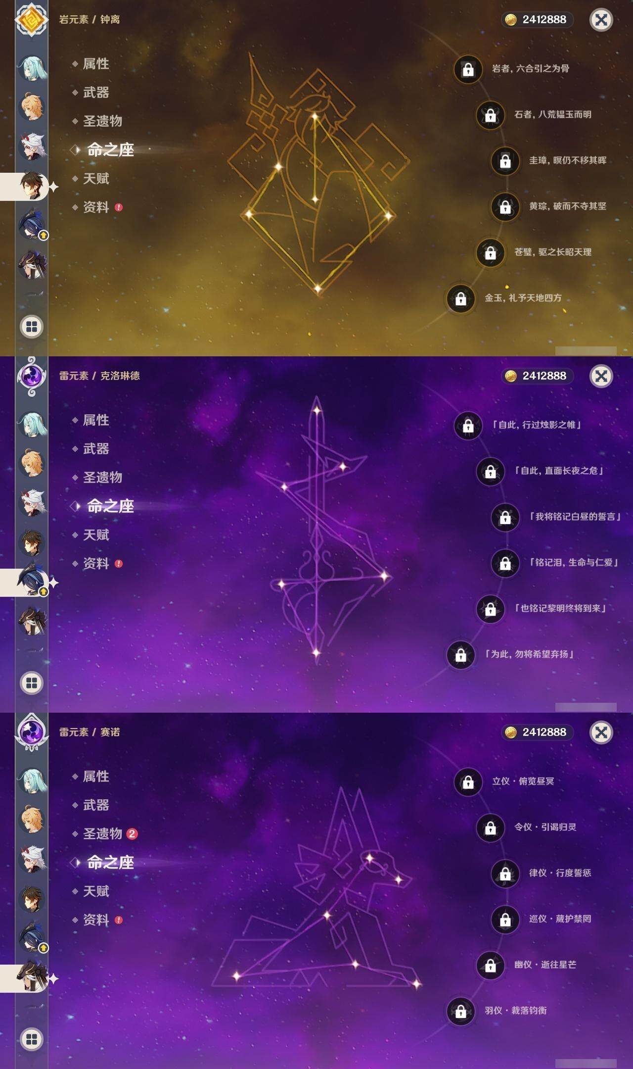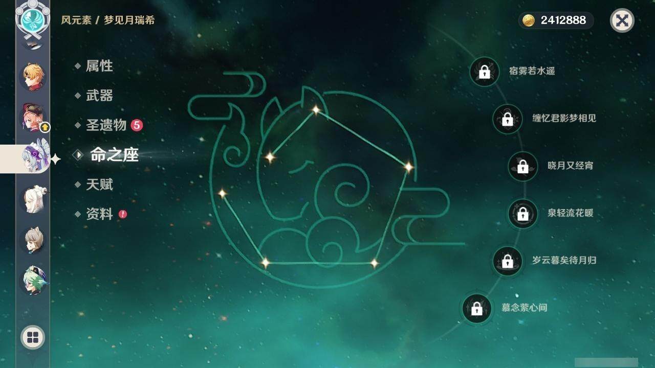 0命克洛琳德,1命阿蕾奇诺,2命闲云,0命那维莱特,1命迪希雅,0命艾尔海森,1命流浪者,0命纳西妲,0命赛诺,0命提纳里,0命夜兰,0命神里绫人,0命申鹤,0命荒泷一斗,0命雷电将军,0命枫原万叶,0命钟离,0命魈,0命达达利亚,0命刻晴,满命七七,2命琴,2命莫娜,3命迪卢克,0命玛拉妮,0命艾梅莉埃,0命玛薇卡,0命梦见月瑞希,精1天空之翼,精1天空之刃